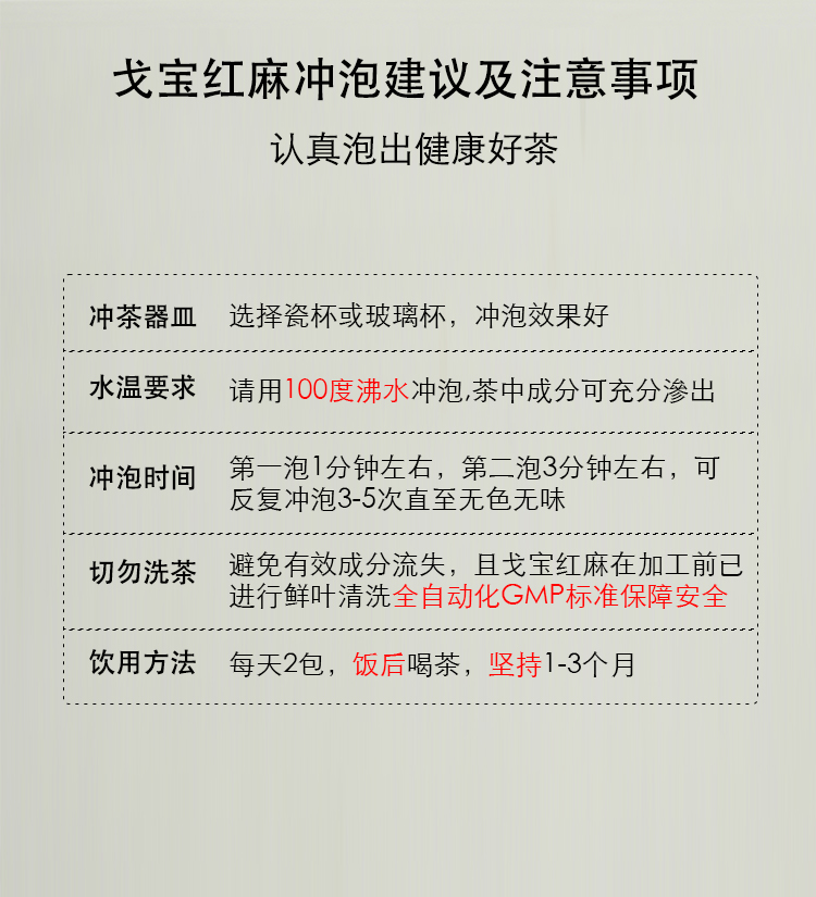 罗布麻茶每盒24袋,购买两盒会送手提礼袋,自用送礼都十分合适。饮用方法也有小窍门,每天2袋,可以根据需求调整喝的时间:想辅助降压、降脂,适合在早、午饭后来一杯,既能缓解饮食油腻感,又能降低血液粘稠度,帮助身体排出多余脂肪垃圾;想改善睡眠质量,则推荐晚饭后饮用,戈宝红麻罗布麻茶不含茶碱与咖啡因,且含有金丝桃苷成分,能起到镇静安神的作用,助力拥有好睡眠哦!