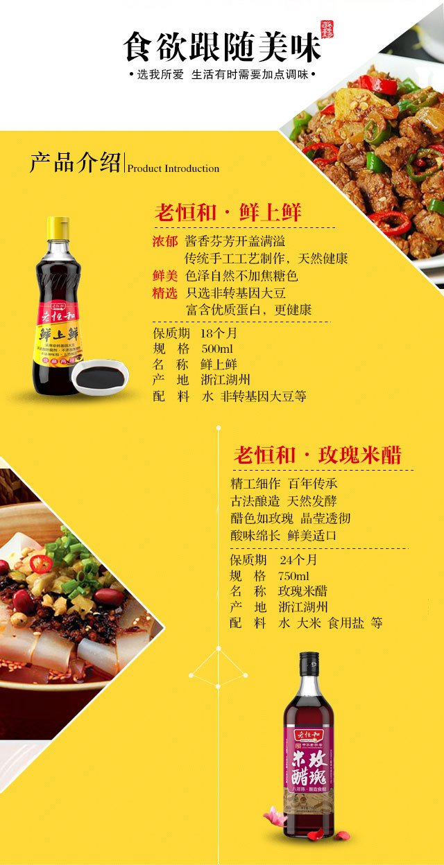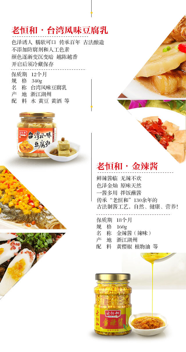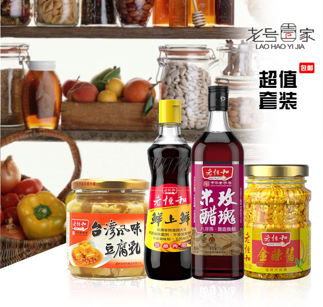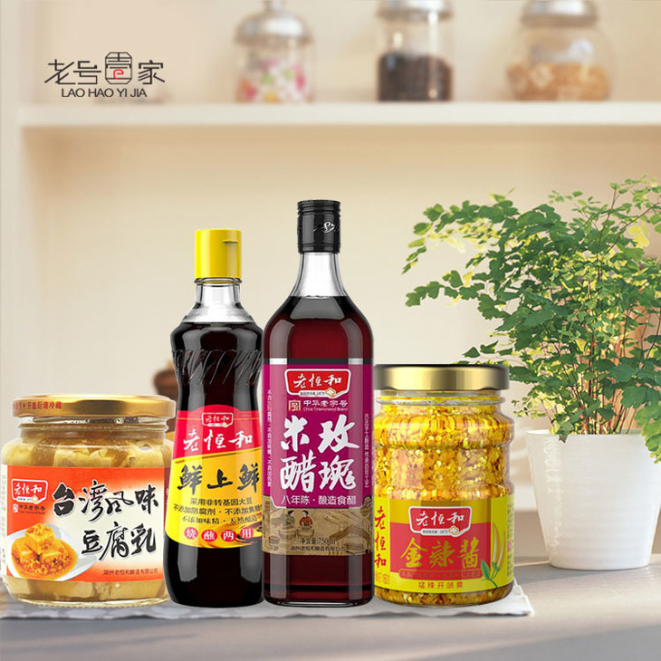 礼包组合内容:八年玫瑰米醋一瓶(750ml)、金辣酱一瓶(160g)、鲜上鲜酱油一瓶(500ml)、台湾风味豆腐乳一瓶(340g)