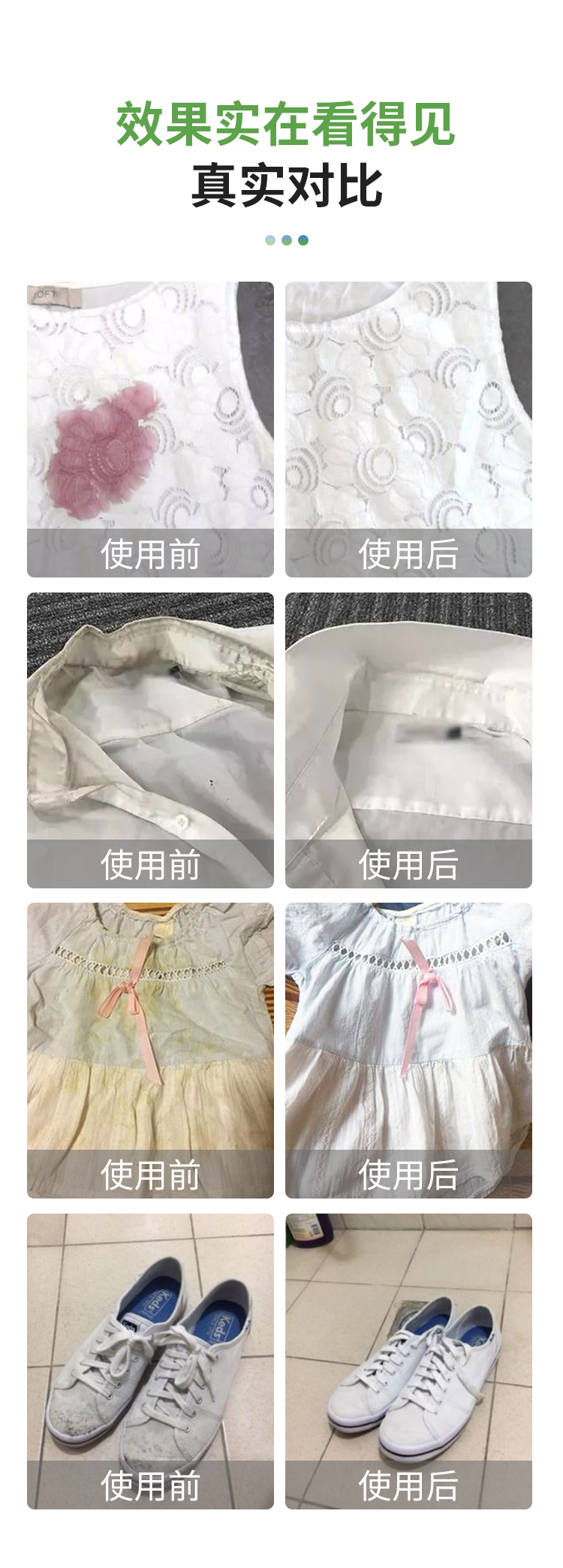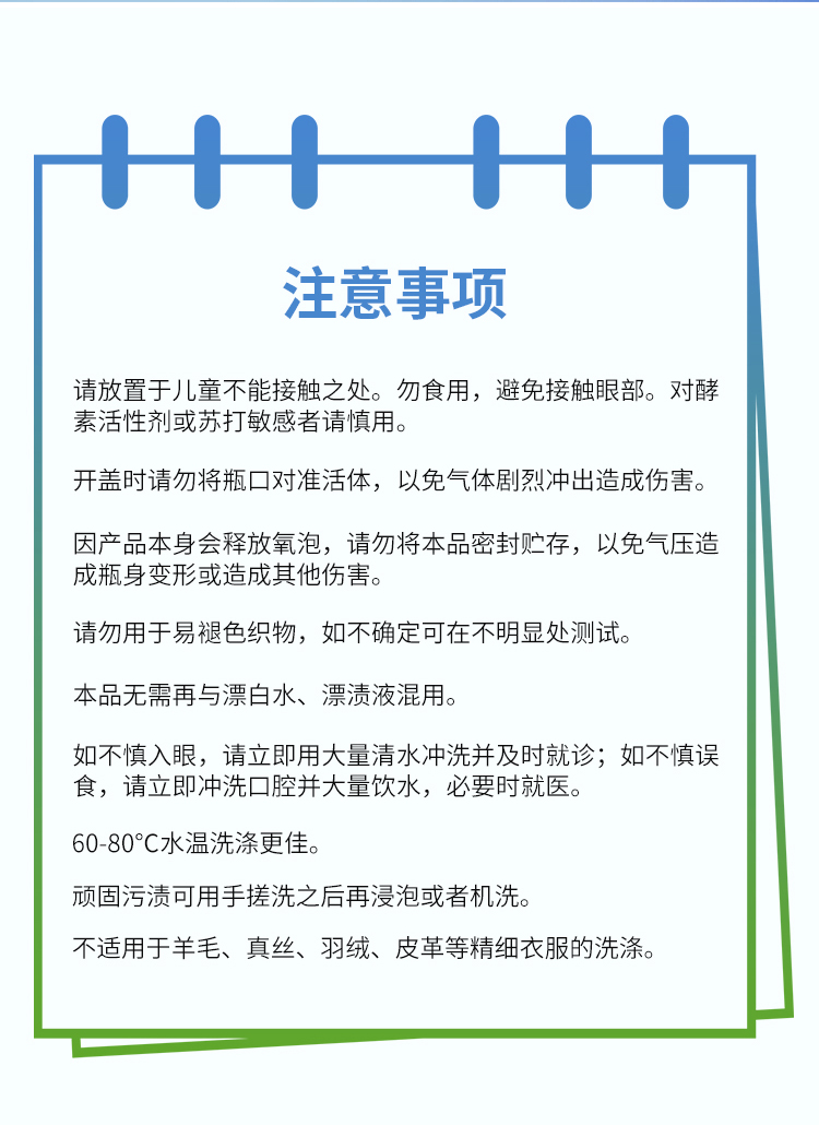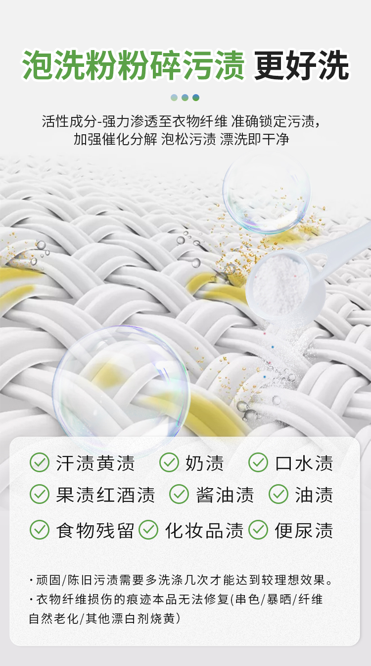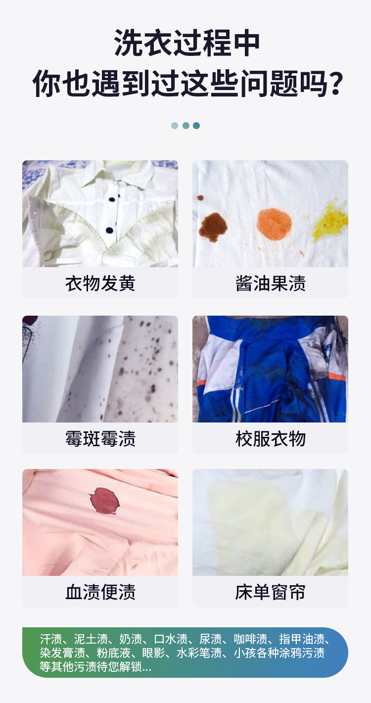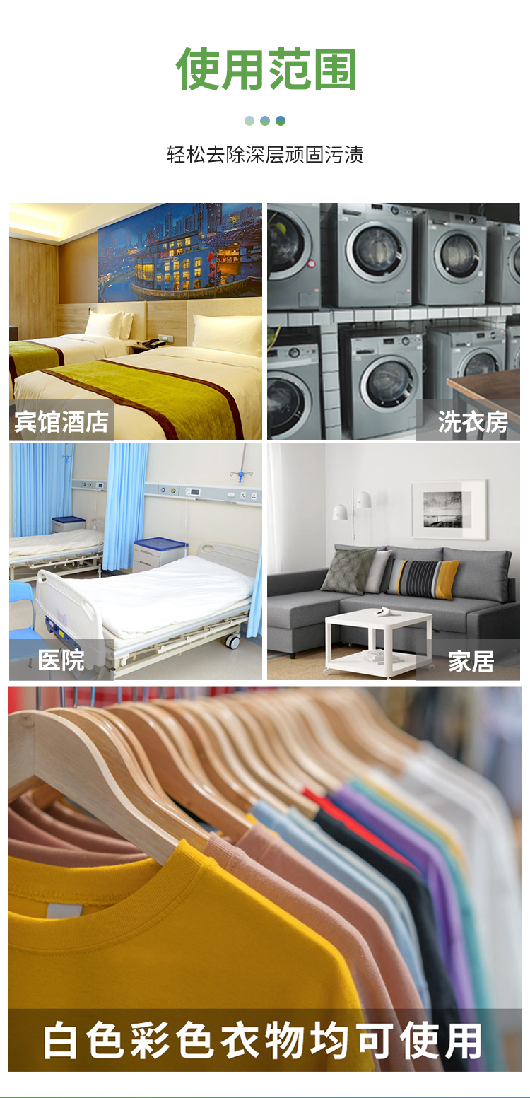 织物类污渍清洗杀菌。如:所有可水洗衣物、发黄衣物、内衣裤、婴幼儿衣物、尿布、床单被套、袜子、帆布鞋、毛巾、婴儿推车、血渍汗渍等污渍和味道。