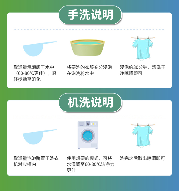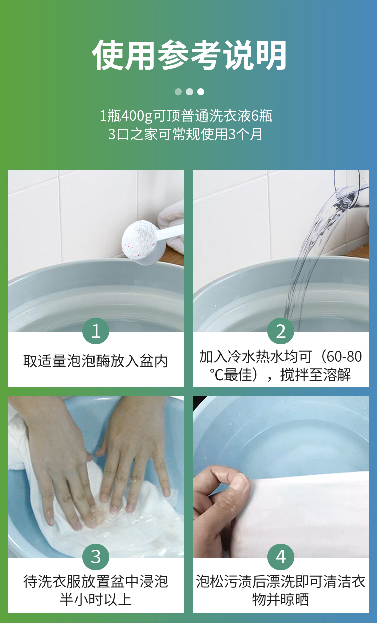 购买本产品赠送勺子,无需人工手洗,建议使用剂量只适用于轻度污渍,大约1勺以内;重度污渍视情况加大使用剂量,大约3勺起,用60-80度热水泡洗效果30分钟内最佳。