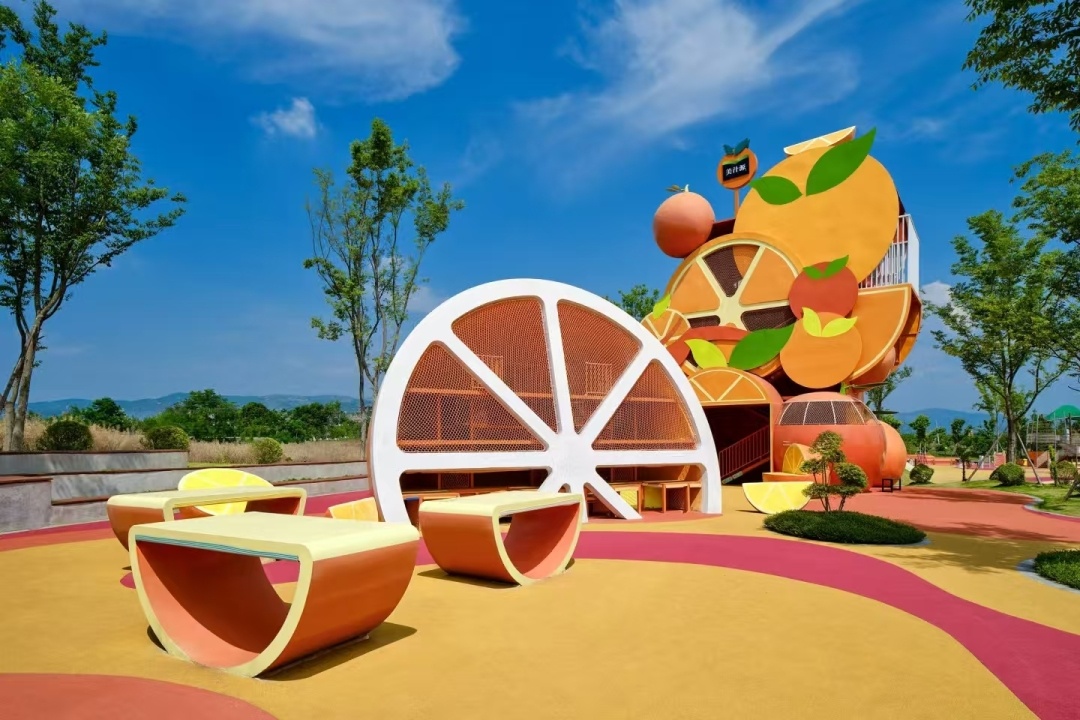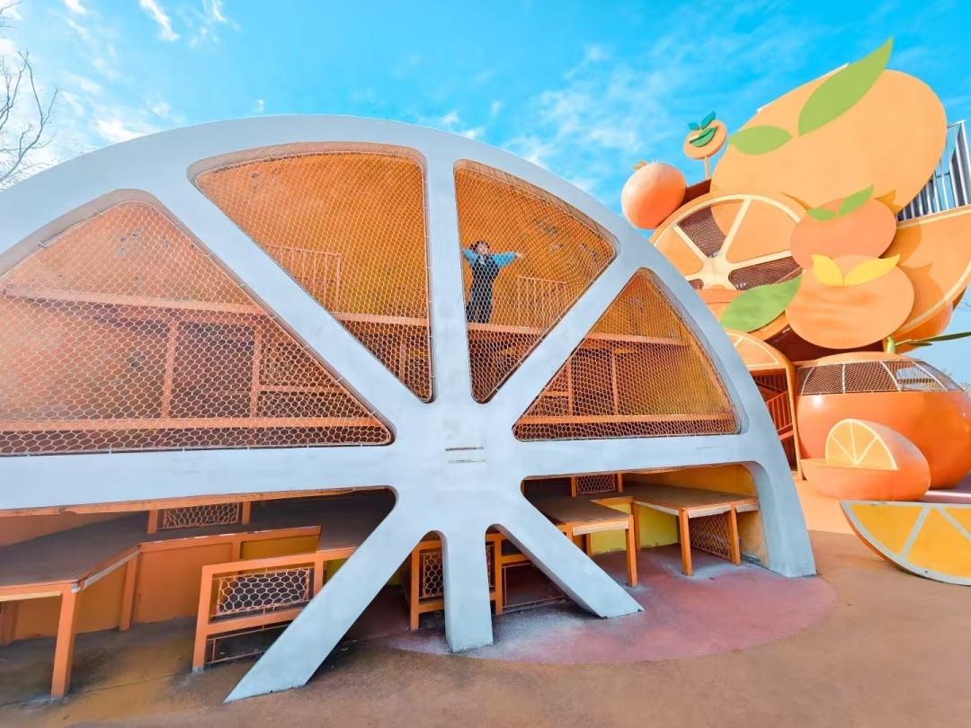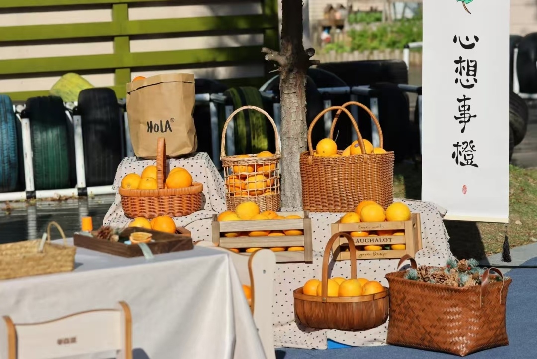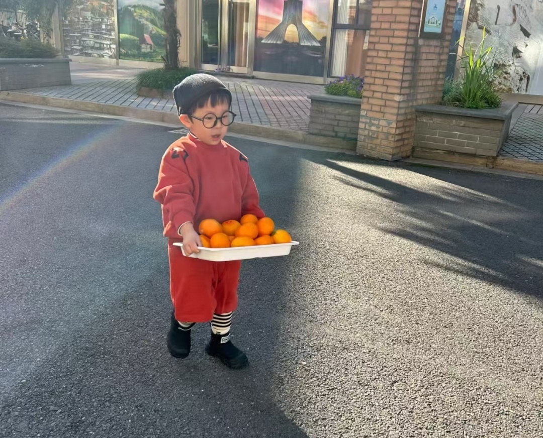 摆上摘来的橘子摆摊啦!手绘招牌写"One Yuan!"