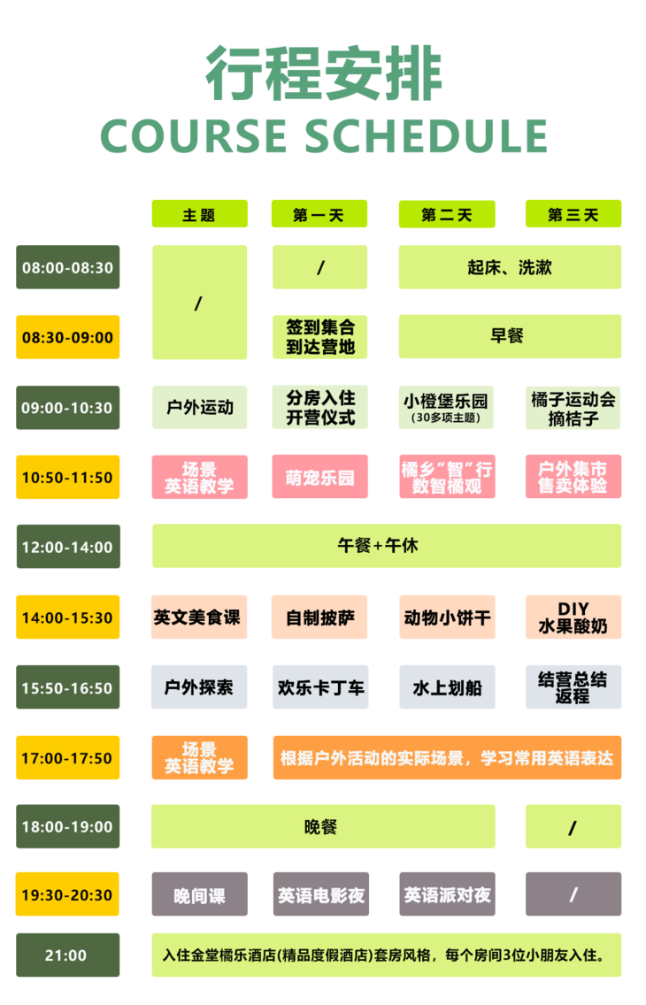 费用包含:主教/助教/生活老师费用+活动策划及组织费用+往返交通费用+早午晚餐费用+专业户外保险费用+活动物料费用+住宿费用+活动跟拍费用+工作人员费用