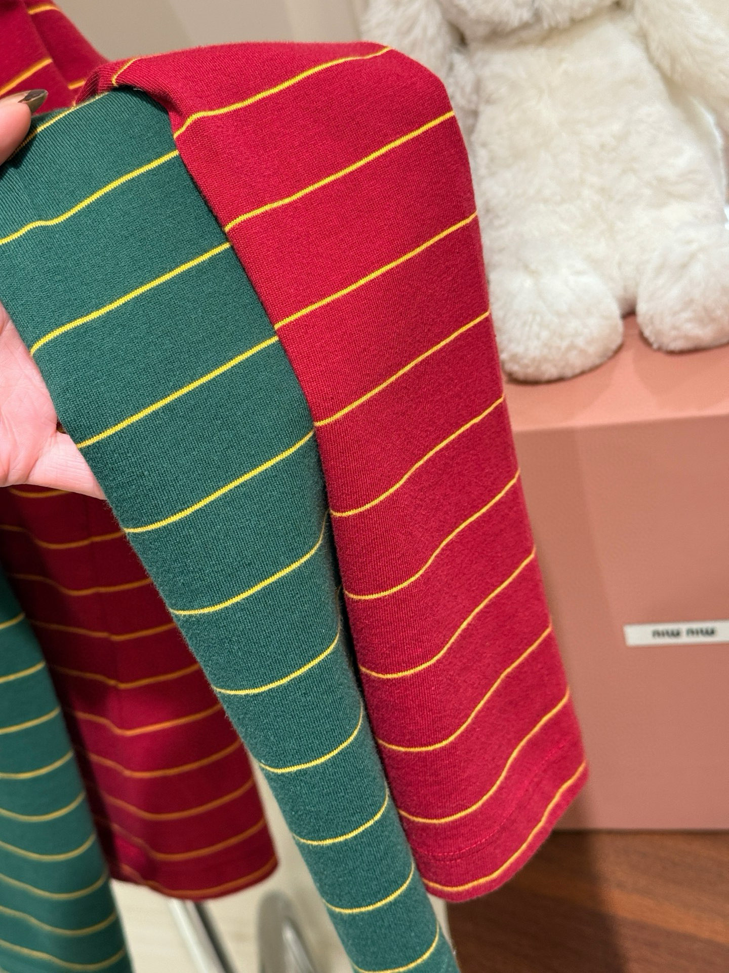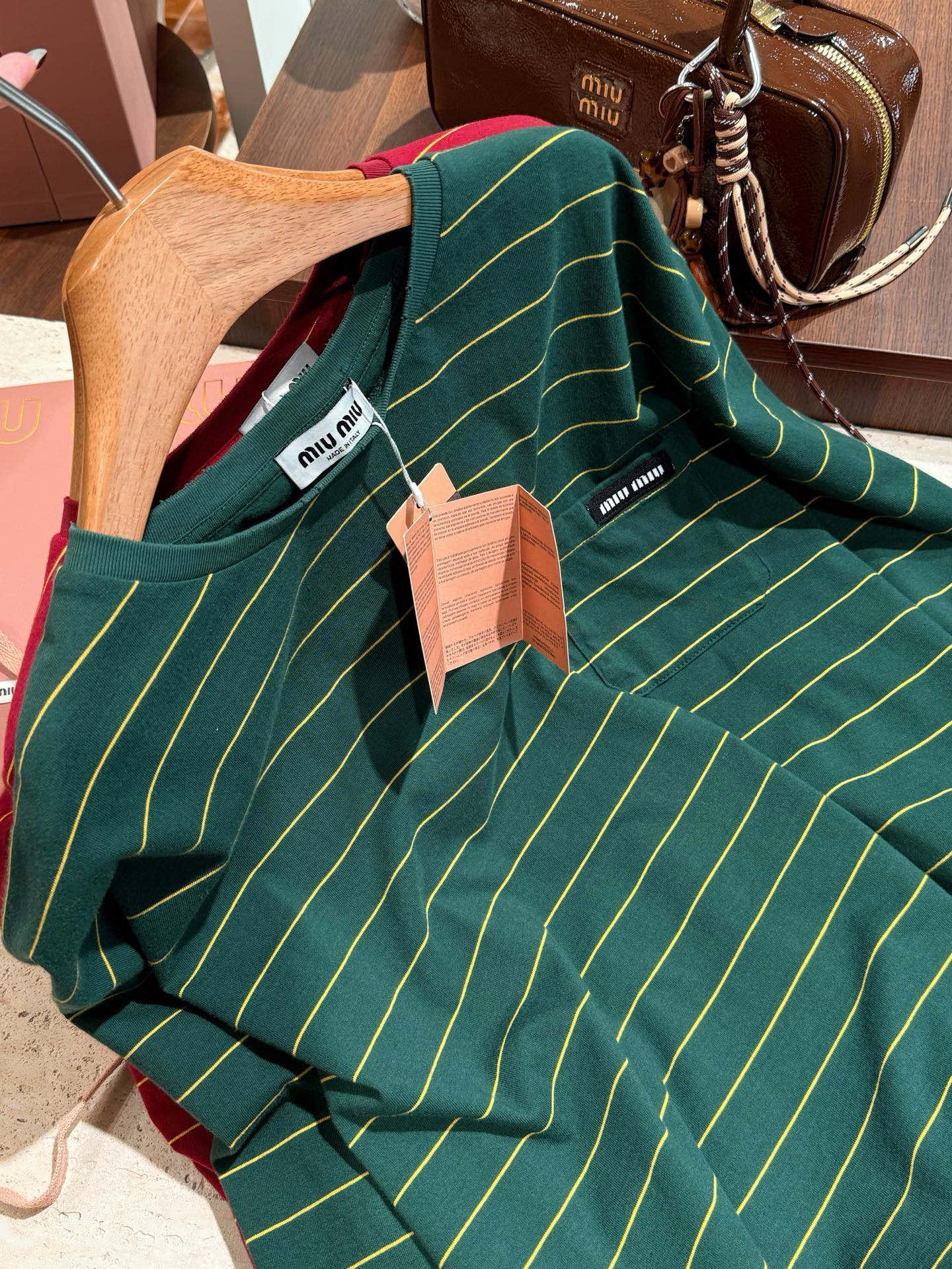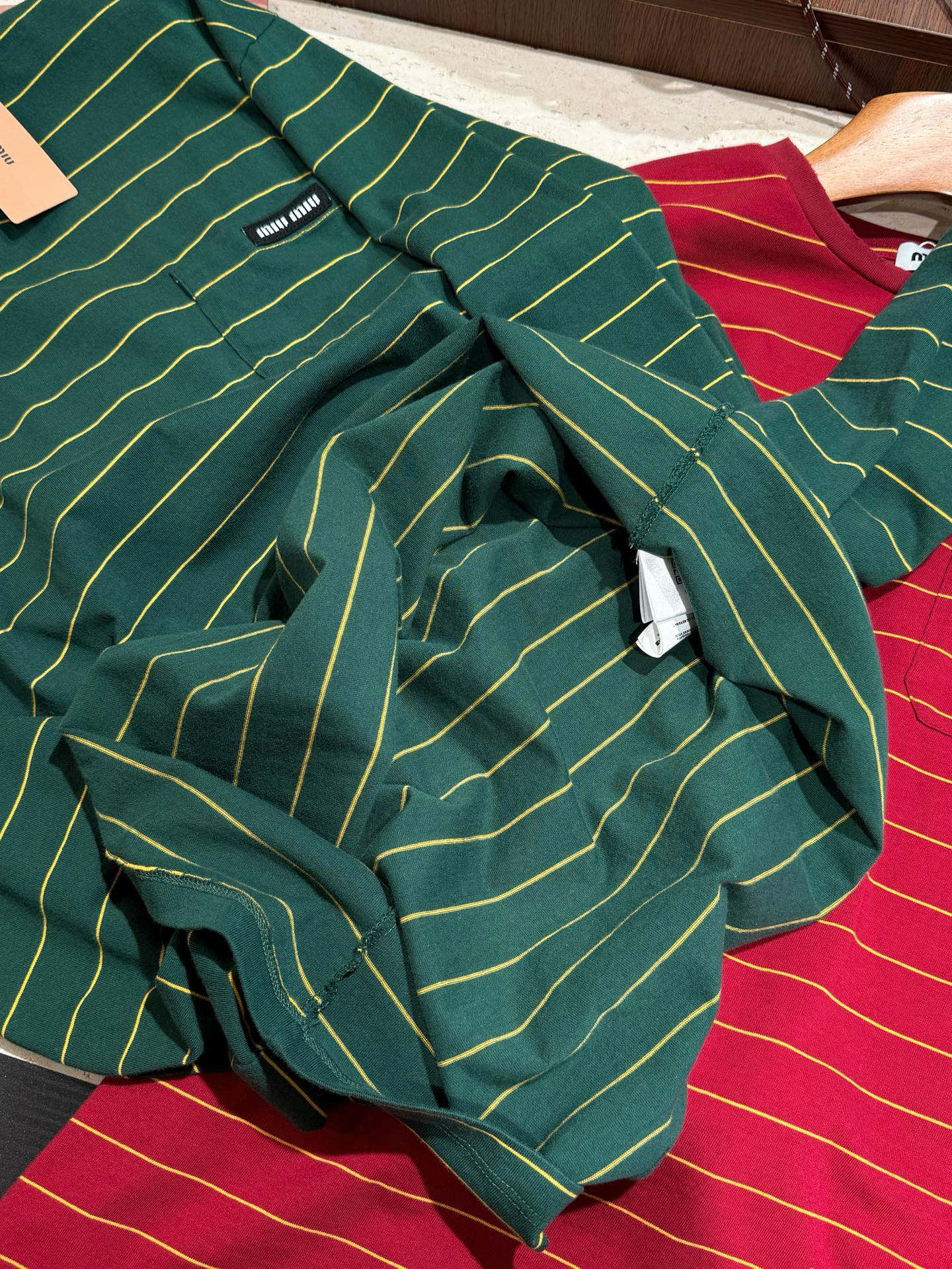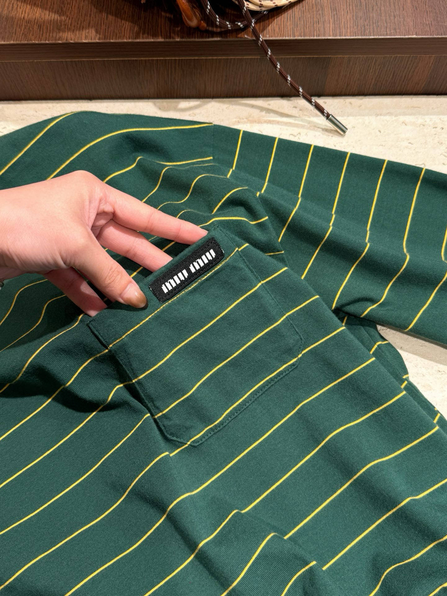 感觉miu家的设计师真的没有设计瓶颈 每个新款都可以美出新高度! 开挂条纹miu 是主推元素 miu男孩女孩都蹲好 搭配万金油🌚 款1️⃣黄色条纹Polo款2️⃣灰色条纹Polo款3️⃣粗条纹t-绿色、粗条纹t-红色款4️⃣细条纹t-绿色、细条纹t-红色款5️⃣ 白色条纹polo