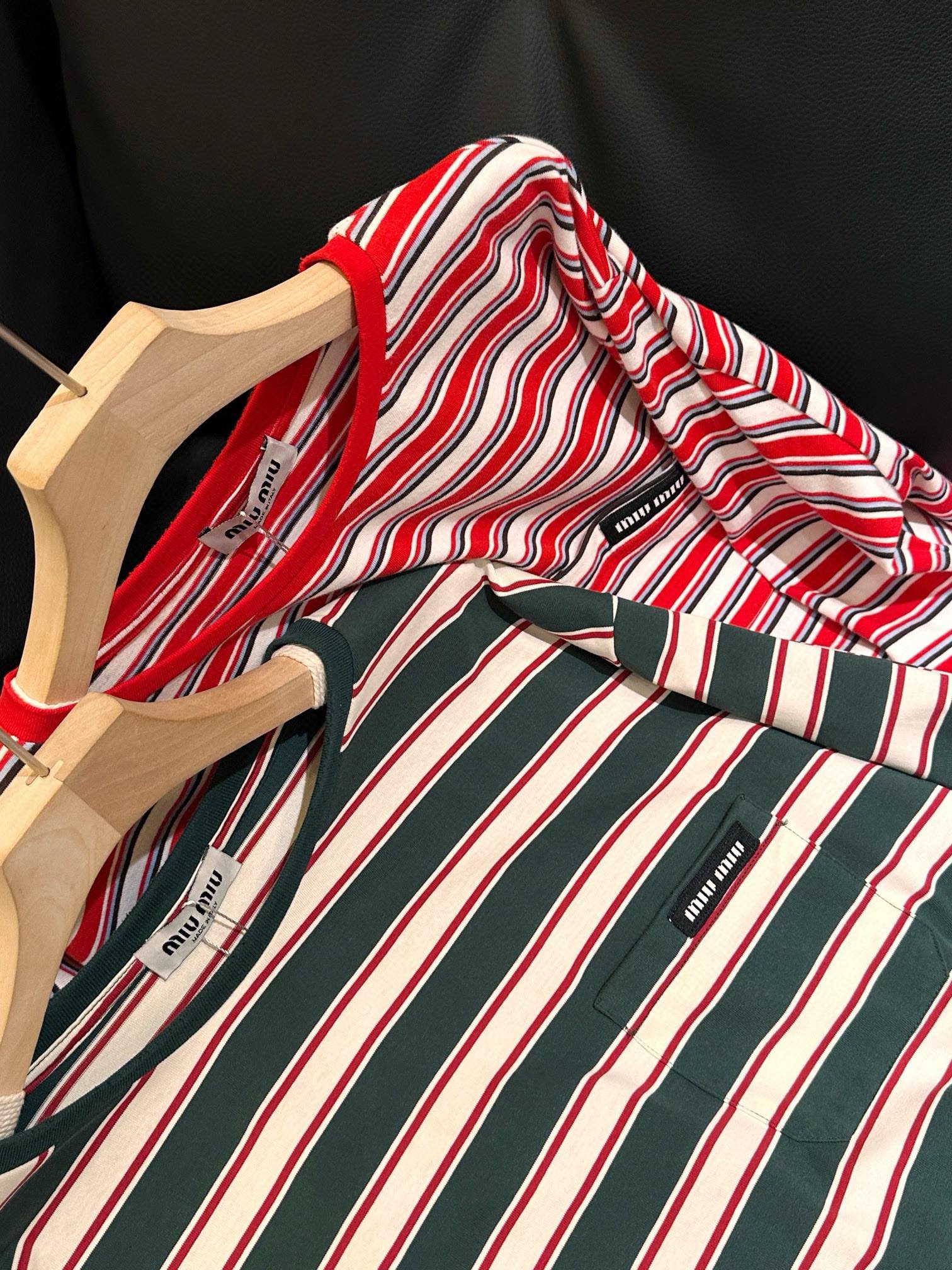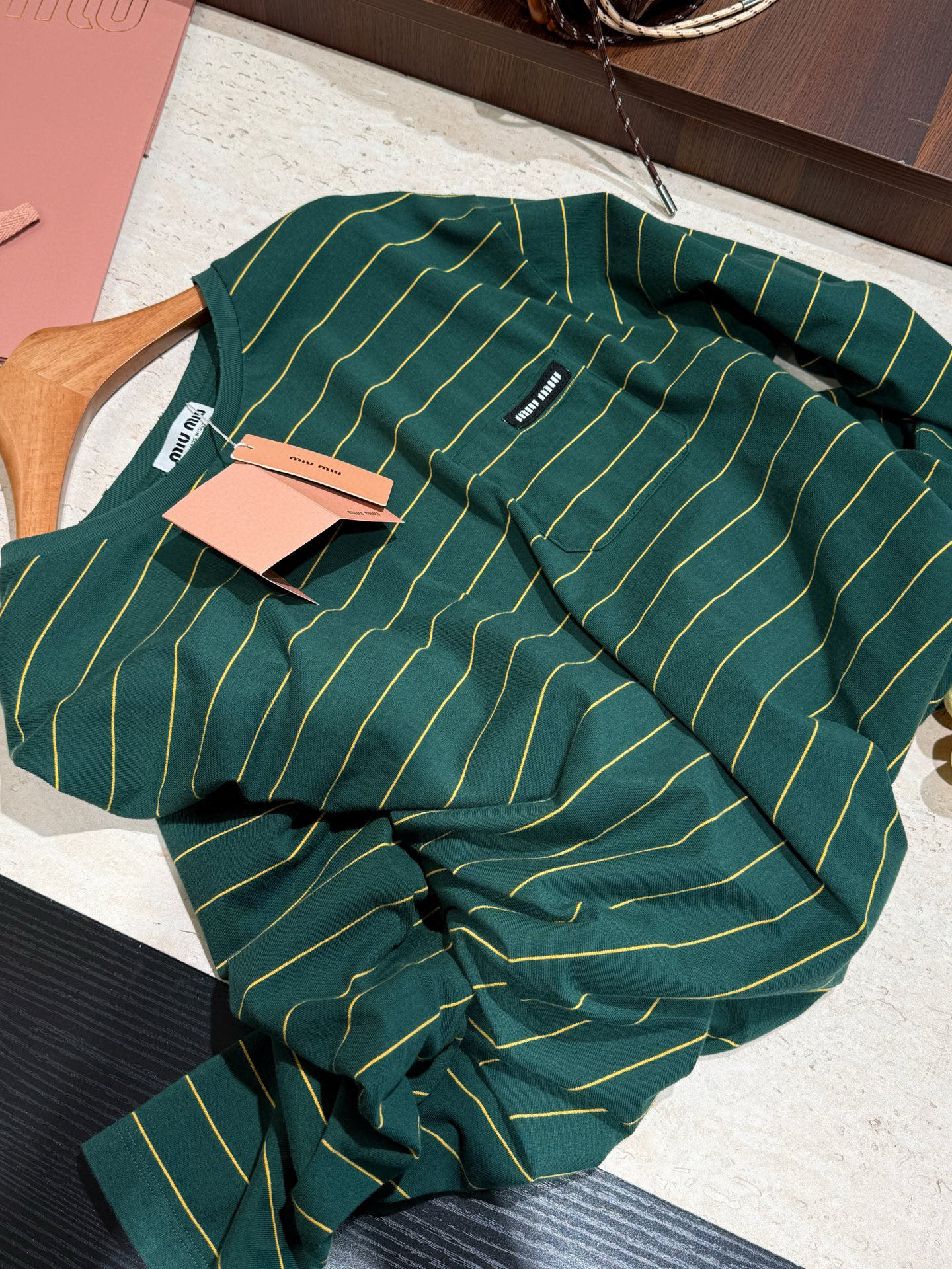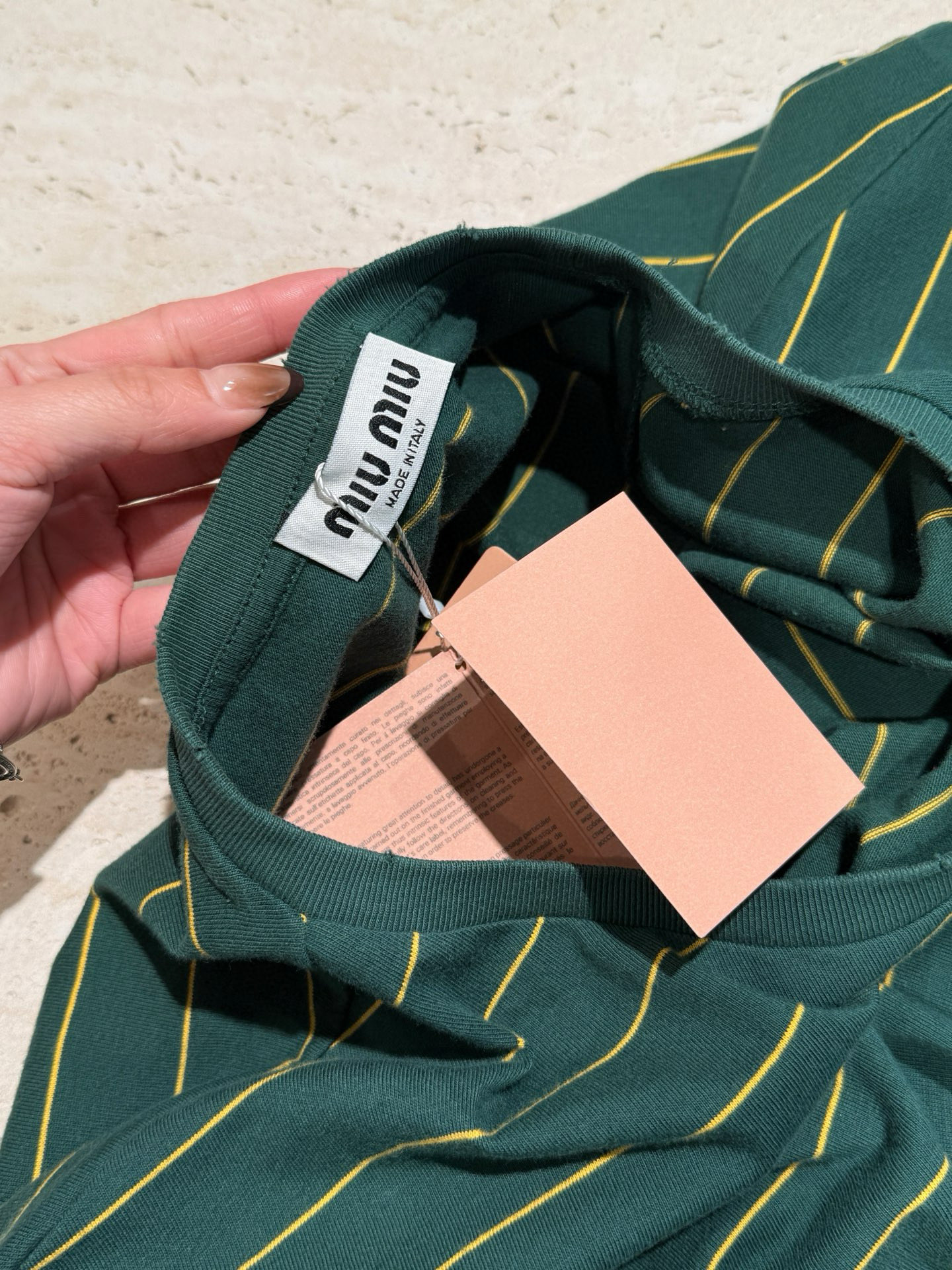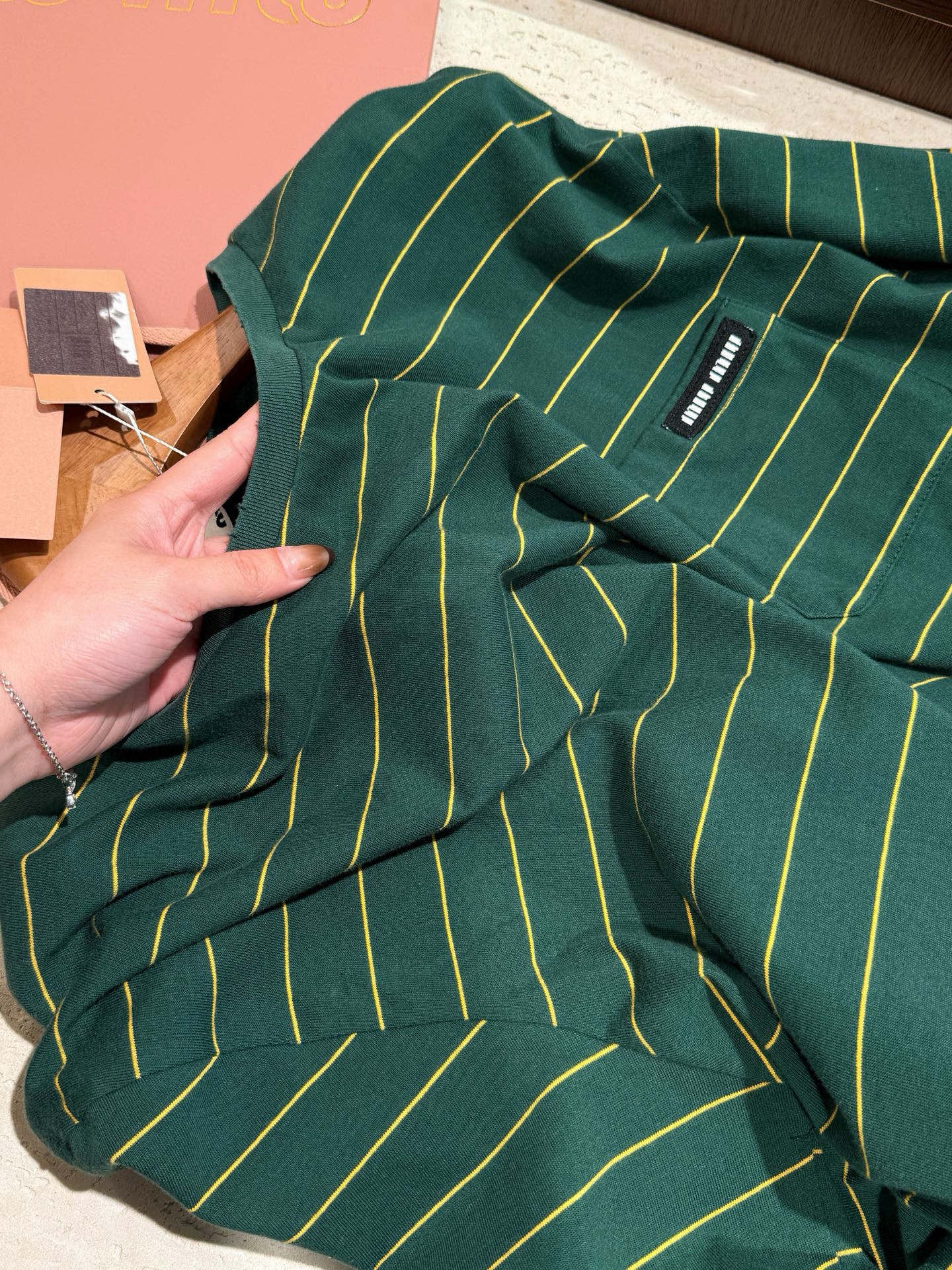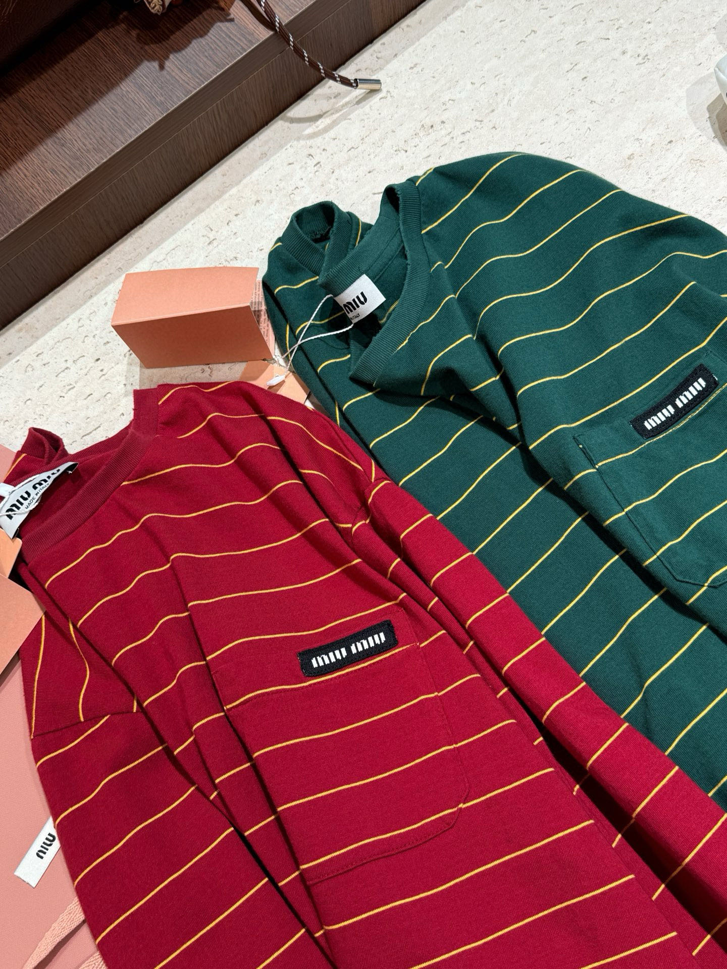 感觉miu家的设计师真的没有设计瓶颈 每个新款都可以美出新高度! 开挂条纹miu 是主推元素 miu男孩女孩都蹲好 搭配万金油🌚 款1️⃣黄色条纹Polo款2️⃣灰色条纹Polo款3️⃣粗条纹t-绿色、粗条纹t-红色款4️⃣细条纹t-绿色、细条纹t-红色款5️⃣ 白色条纹polo