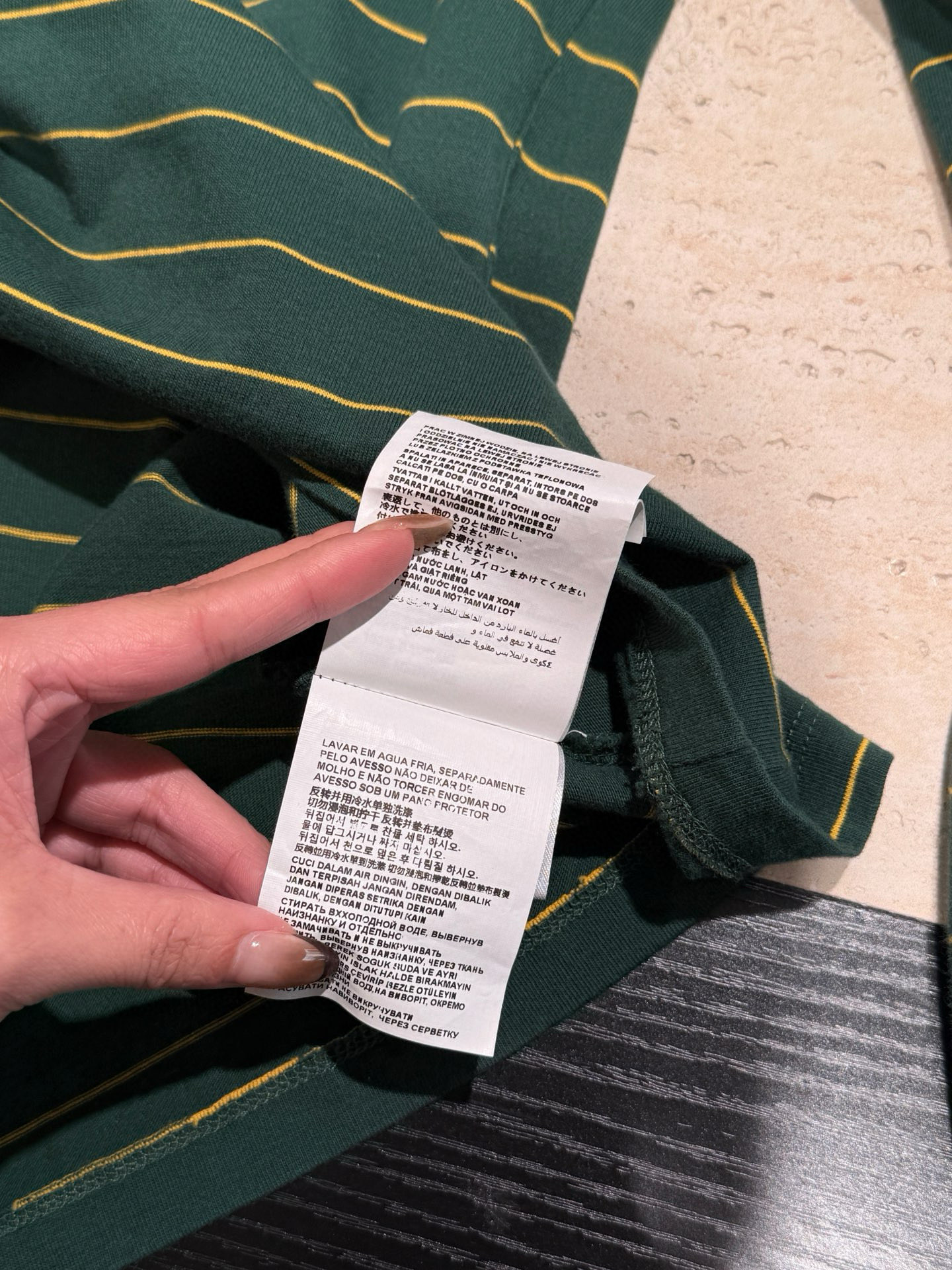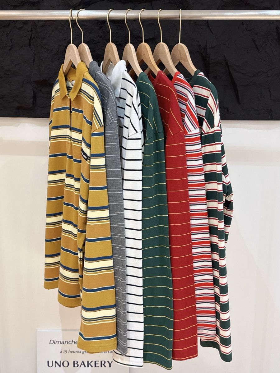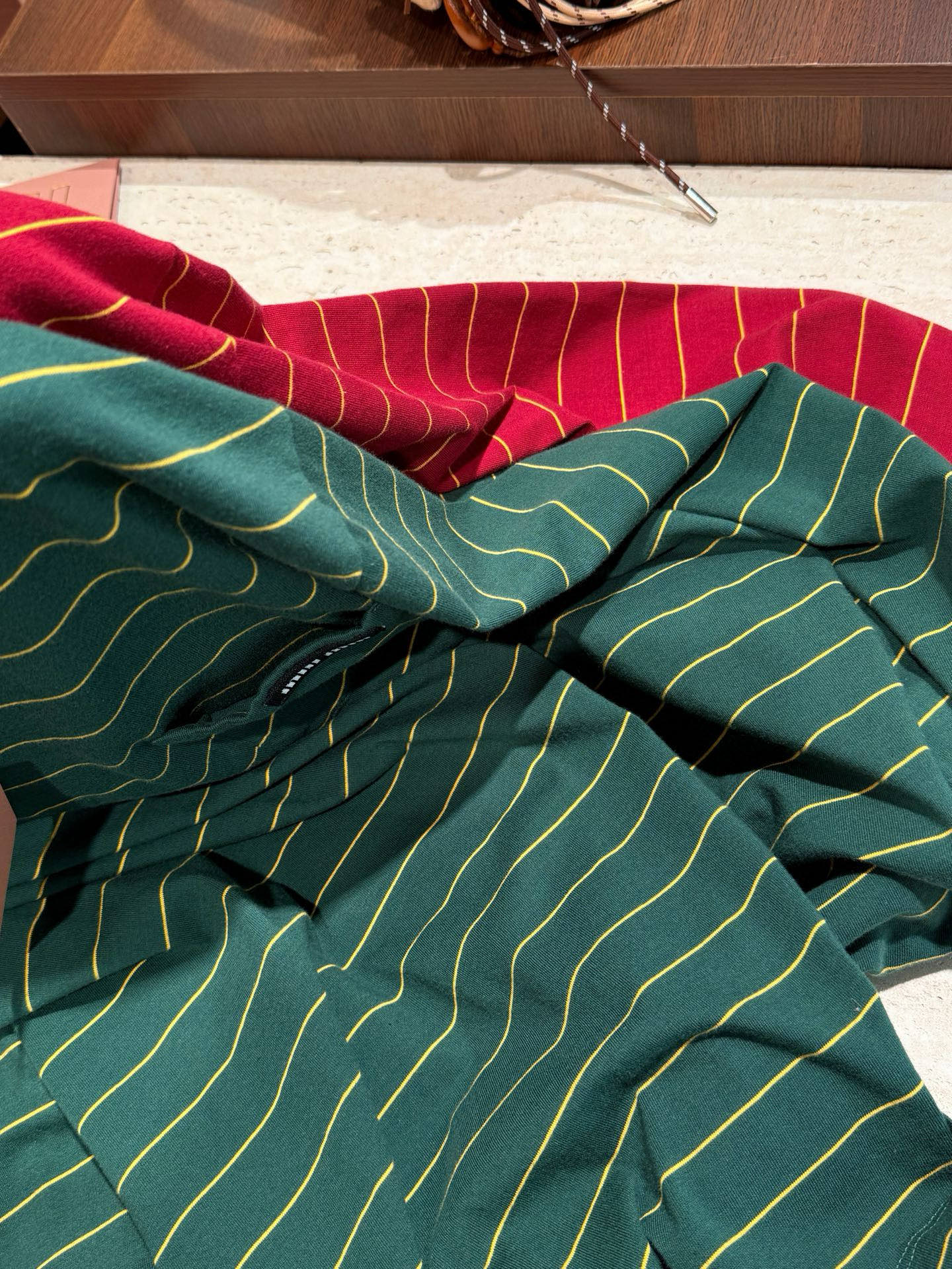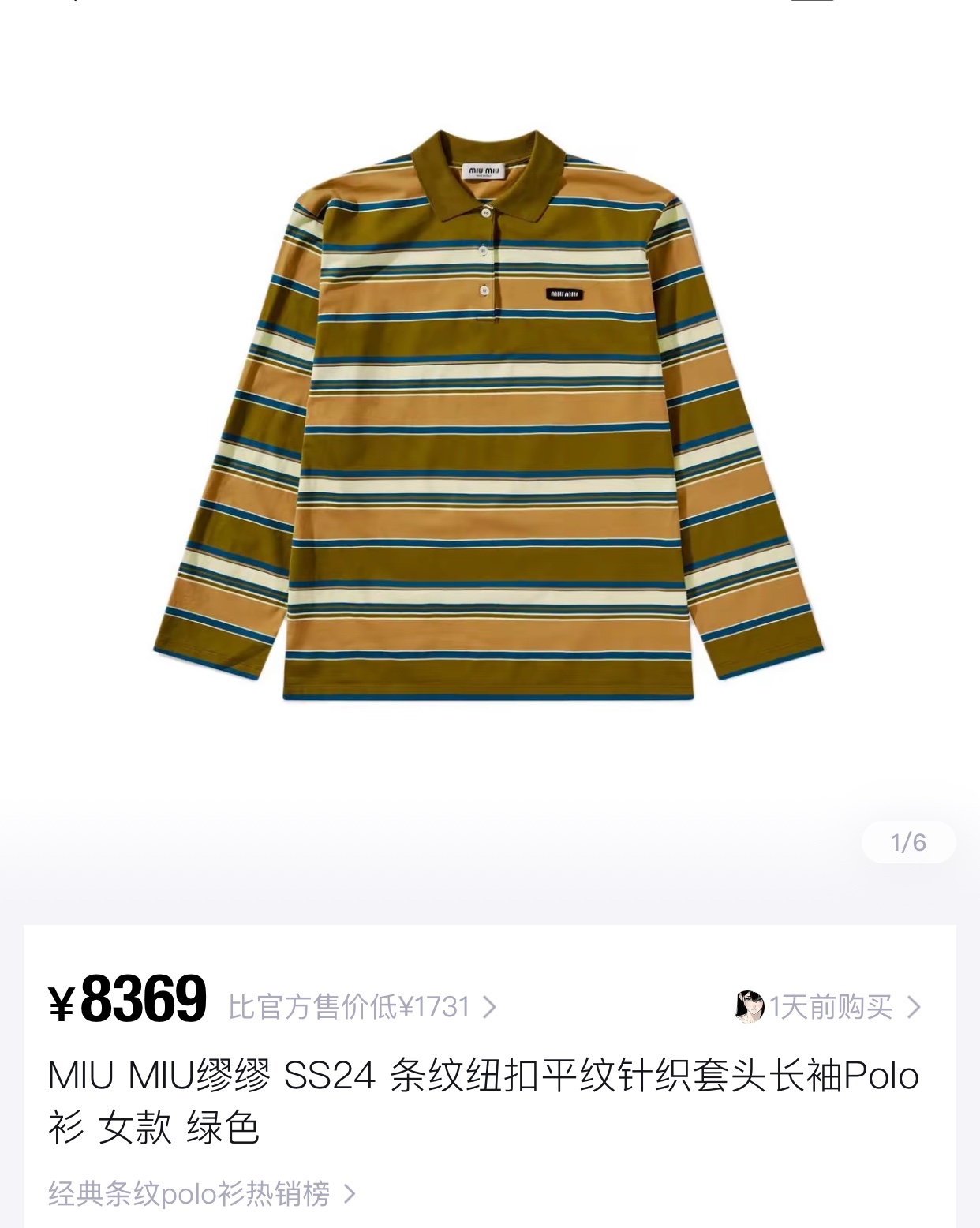 感觉miu家的设计师真的没有设计瓶颈 每个新款都可以美出新高度! 开挂条纹miu 是主推元素 miu男孩女孩都蹲好 搭配万金油🌚 款1️⃣黄色条纹Polo款2️⃣灰色条纹Polo款3️⃣粗条纹t-绿色、粗条纹t-红色款4️⃣细条纹t-绿色、细条纹t-红色款5️⃣ 白色条纹polo