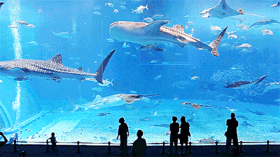 当夜幕低垂,白天海洋馆里的热闹人群散去