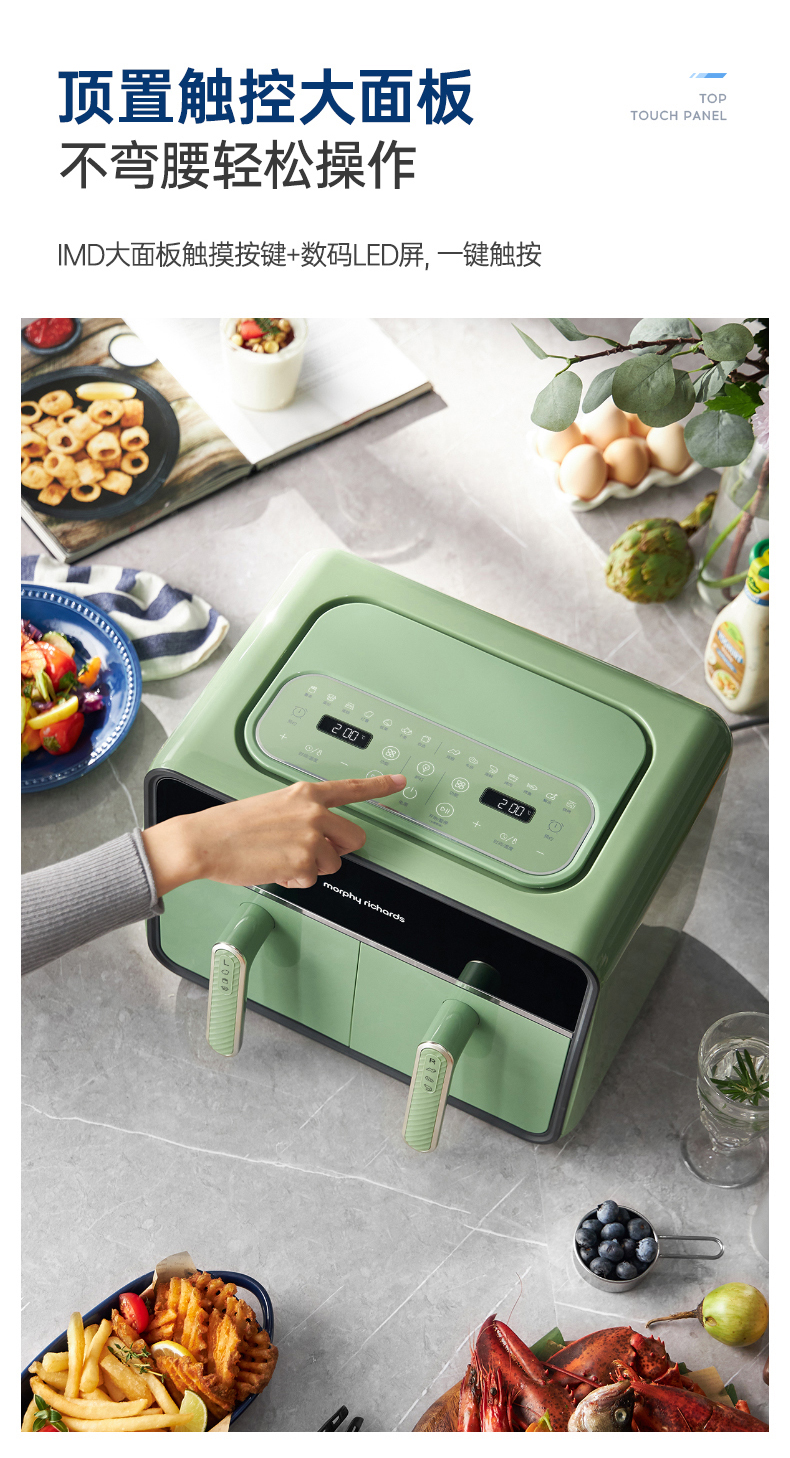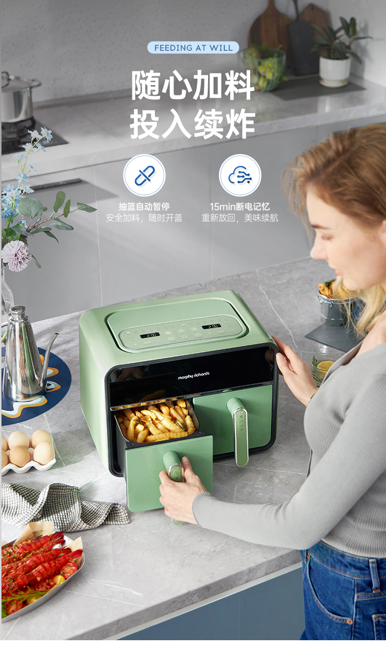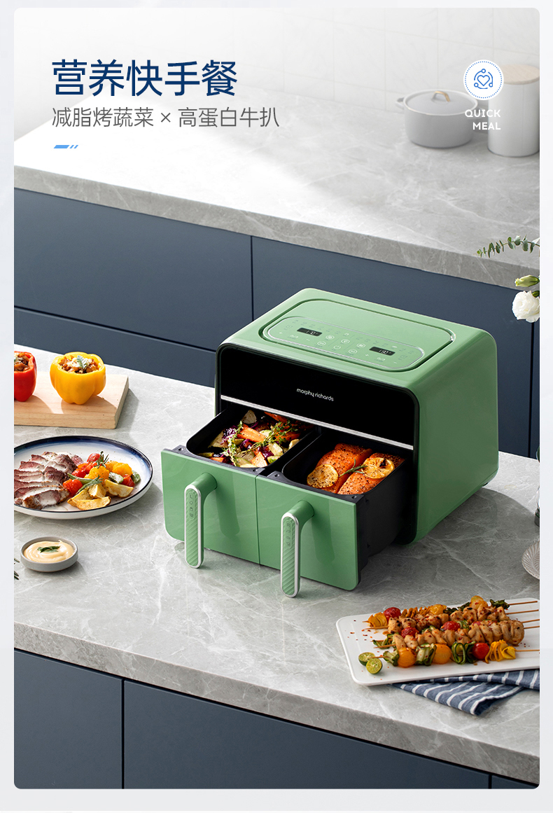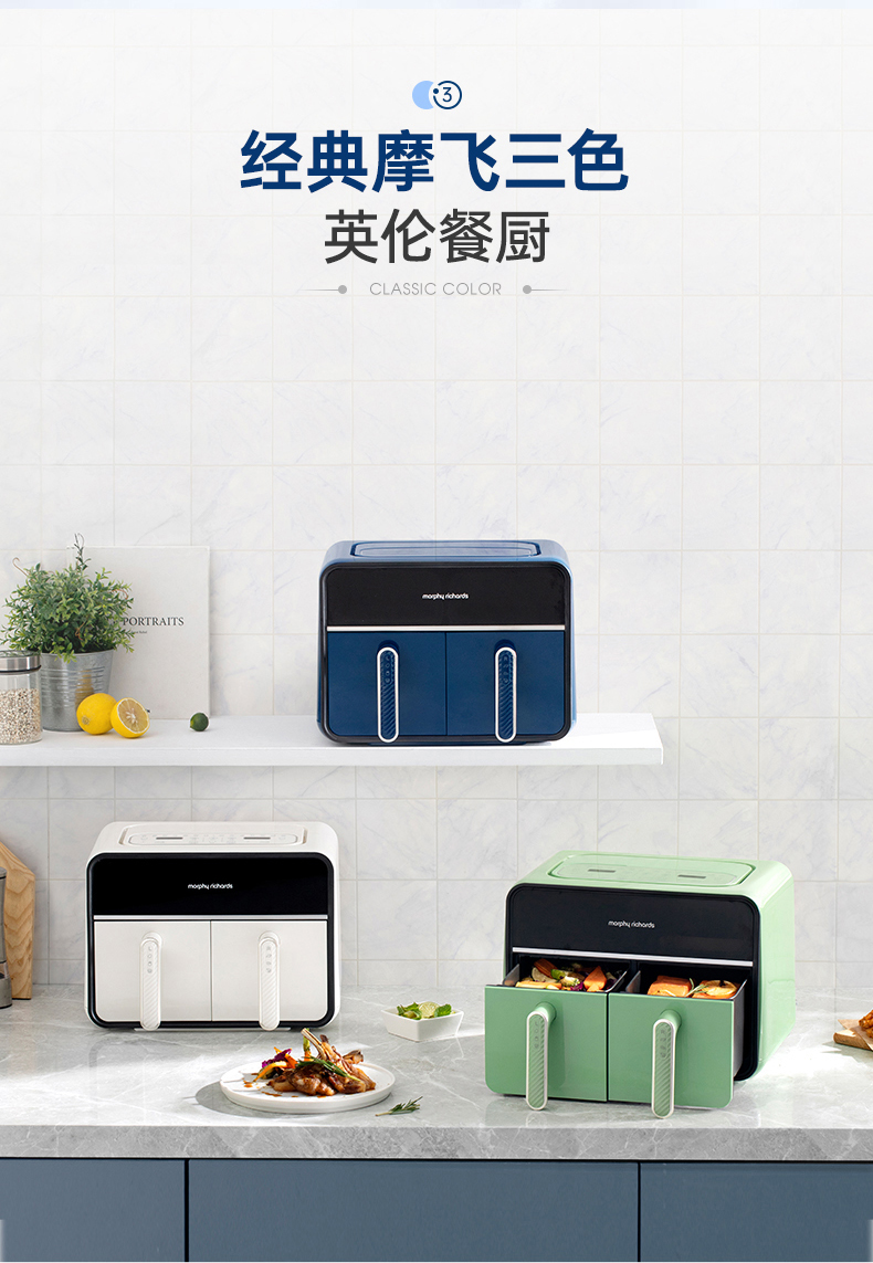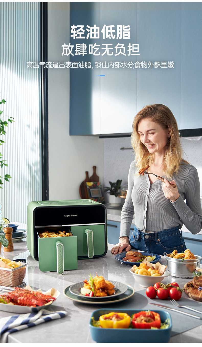 颜值也是非常在线,三款颜色都好好看!我留了跟家装很搭的绿,超美哦!两边可以分别设好时间温度后同时开启,也可以只用一侧,无论是传统的炸鸡翅、薯条,还是创新的健康零食、烘焙甜品,都可以轻松实现,特别适合动手能力强的老粉,一台空气炸锅,真的是能搞定好多美食!