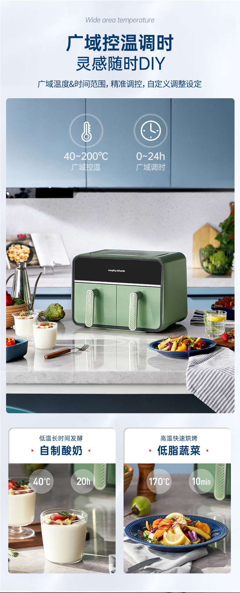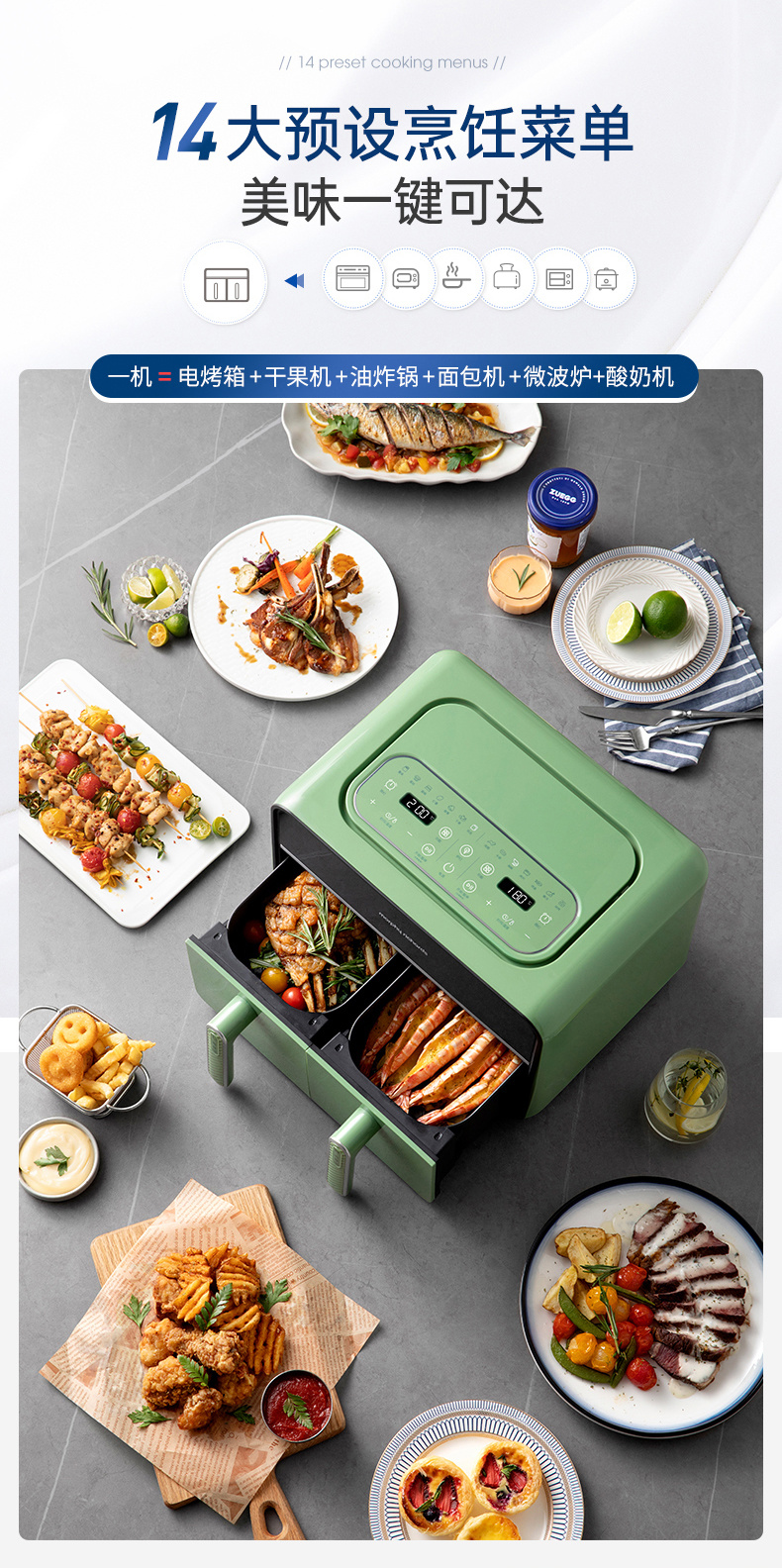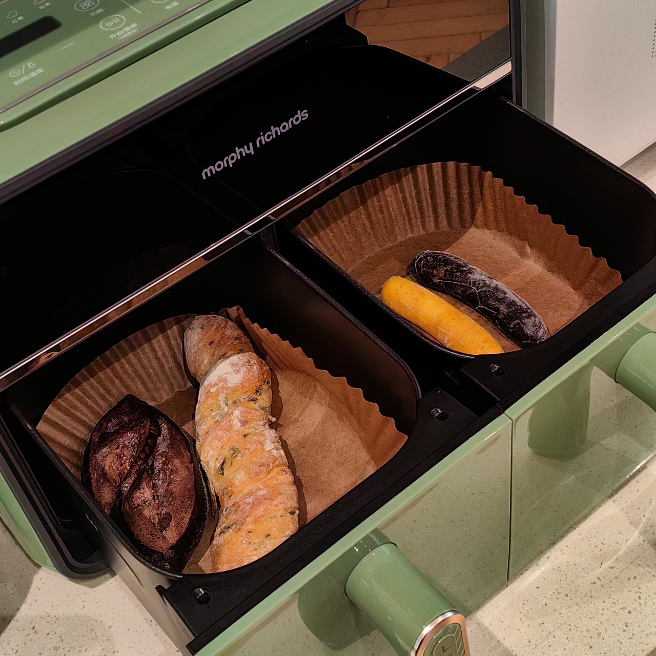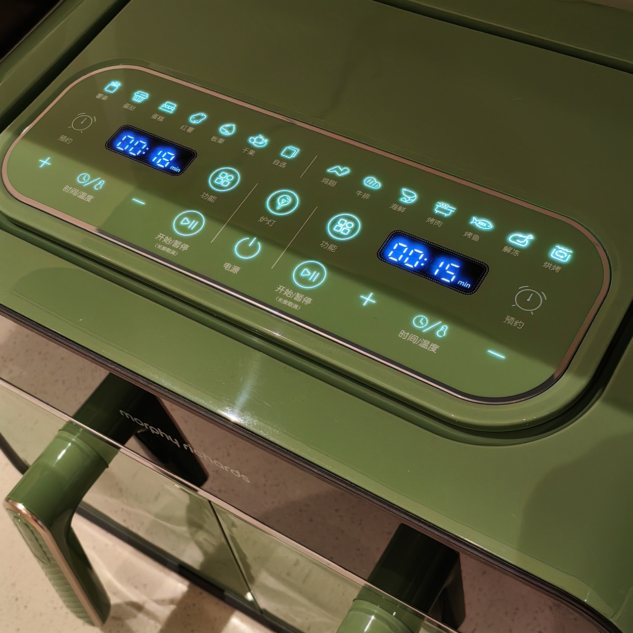 颜值也是非常在线,三款颜色都好好看!我留了跟家装很搭的绿,超美哦!两边可以分别设好时间温度后同时开启,也可以只用一侧,无论是传统的炸鸡翅、薯条,还是创新的健康零食、烘焙甜品,都可以轻松实现,特别适合动手能力强的老粉,一台空气炸锅,真的是能搞定好多美食!