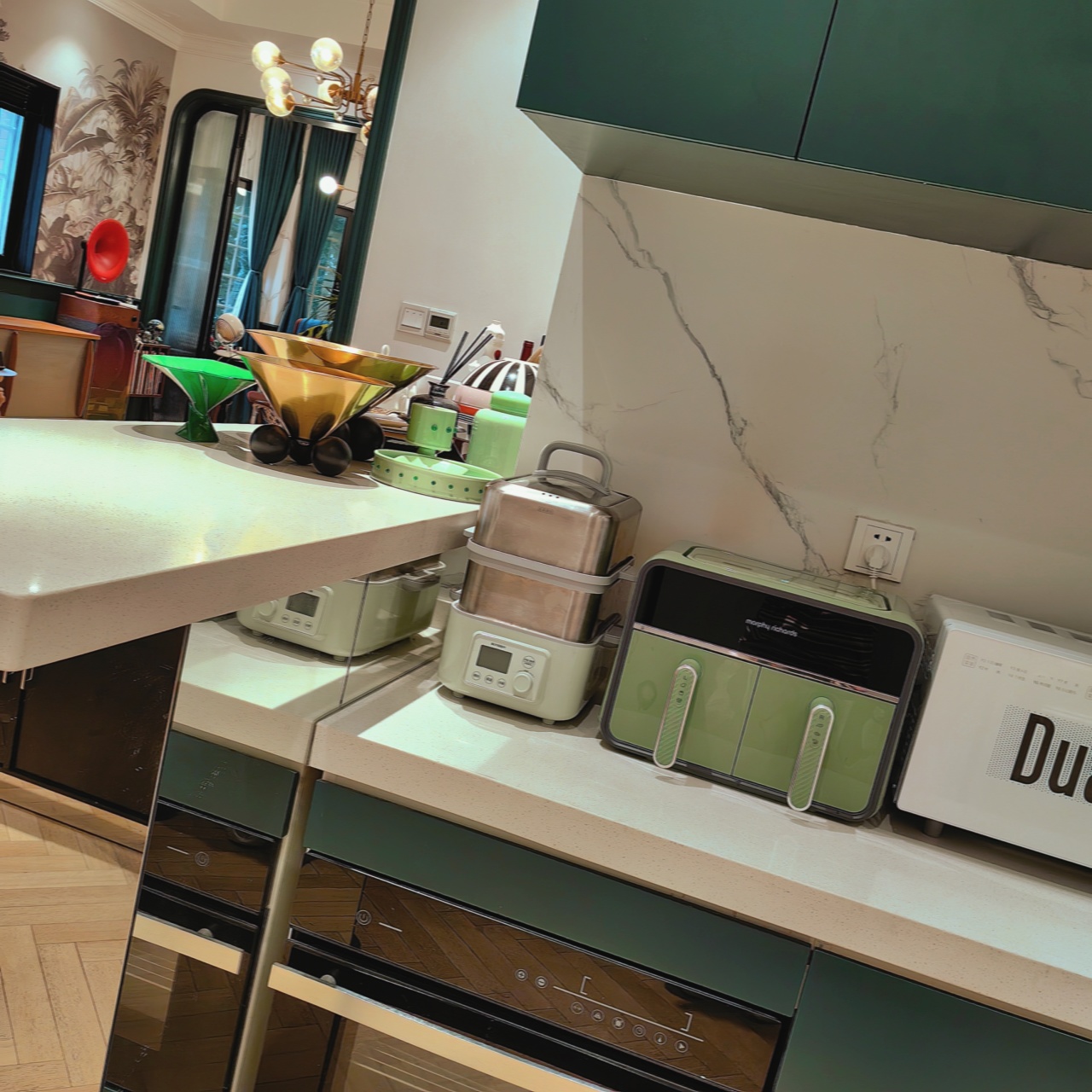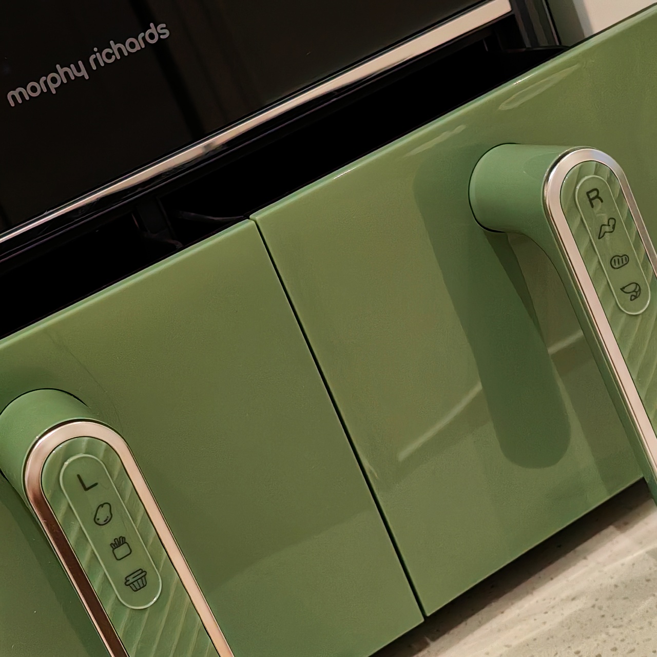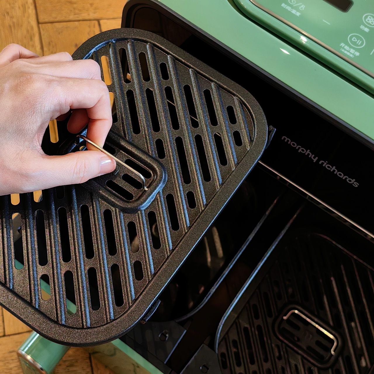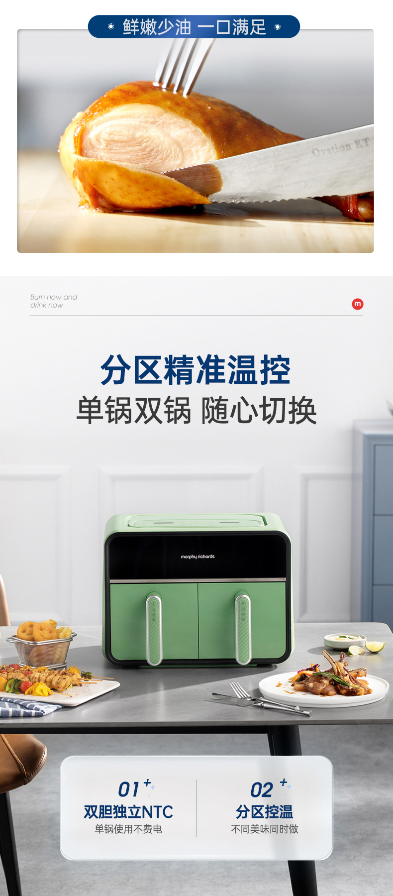 颜值也是非常在线,三款颜色都好好看!我留了跟家装很搭的绿,超美哦!两边可以分别设好时间温度后同时开启,也可以只用一侧,无论是传统的炸鸡翅、薯条,还是创新的健康零食、烘焙甜品,都可以轻松实现,特别适合动手能力强的老粉,一台空气炸锅,真的是能搞定好多美食!