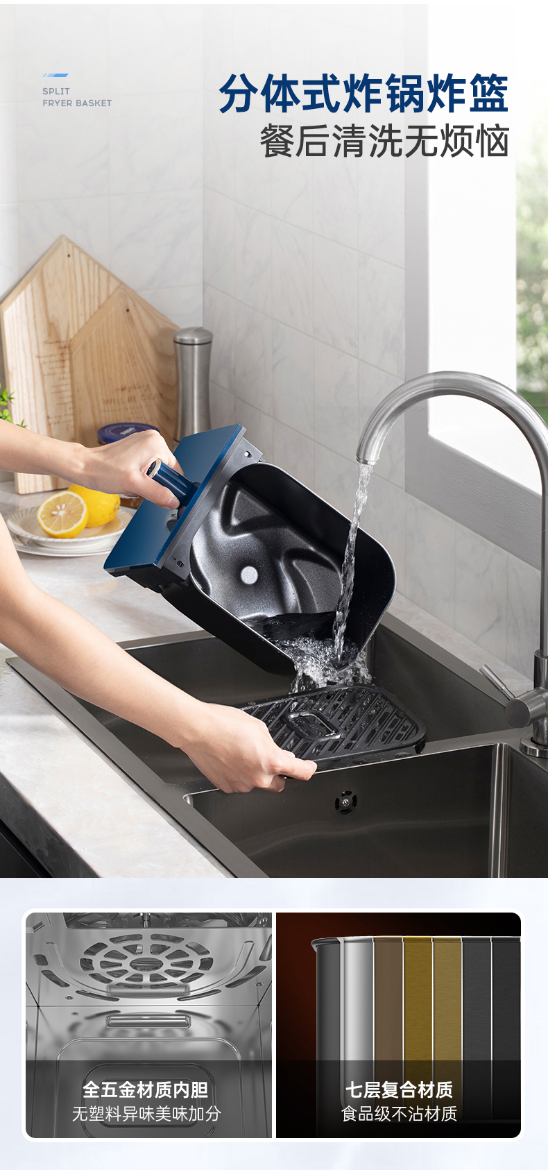 而且,它还贴心的做了全触屏控制,搭配14种预设菜单,让操作变得更直观便捷。炉灯透明大视窗,更是让烹饪过程一目了然,无需频繁开盖查看,既方便又安全。全身还采用五金材质内胆和食品级不沾材质,不仅保证了烹饪过程的安全,也让后续的清洁工作变得轻松。分体式的炸锅炸篮设计,即便是烤制一些难以清洗的食物,也能无惧油渍残留。