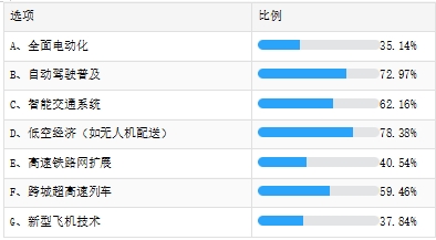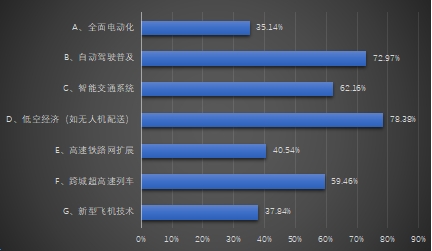 未来十年内,最有可能显著改变居民日常生活的交通变革主要包括低空经济、自动驾驶普及、智能交通系统、跨城超高速列车等。调查显示,78.38%的人认为低空经济(如无人机配送)将会带来最大变革,72.97%的人认为自动驾驶普及将极大程度地改变人们的出行方式,62.16%的人认为智能交通系统将引发重大变革。此外,跨城超高速列车(59.46%)、高速铁路网扩展(40.54%)、全面电动化(35.14%)、新型飞机技术(37.84%)等也可能在未来十年内显著影响居民的日常生活。