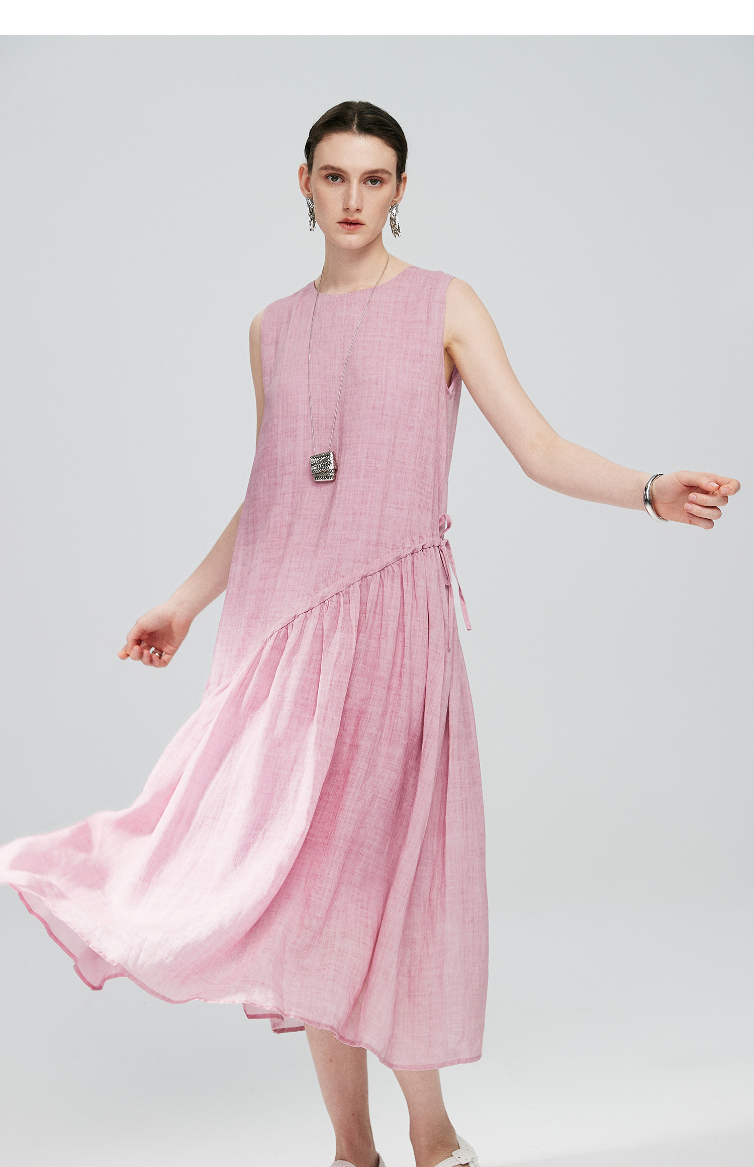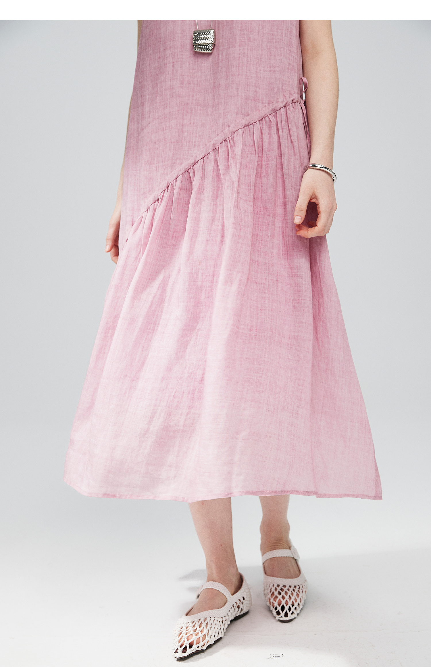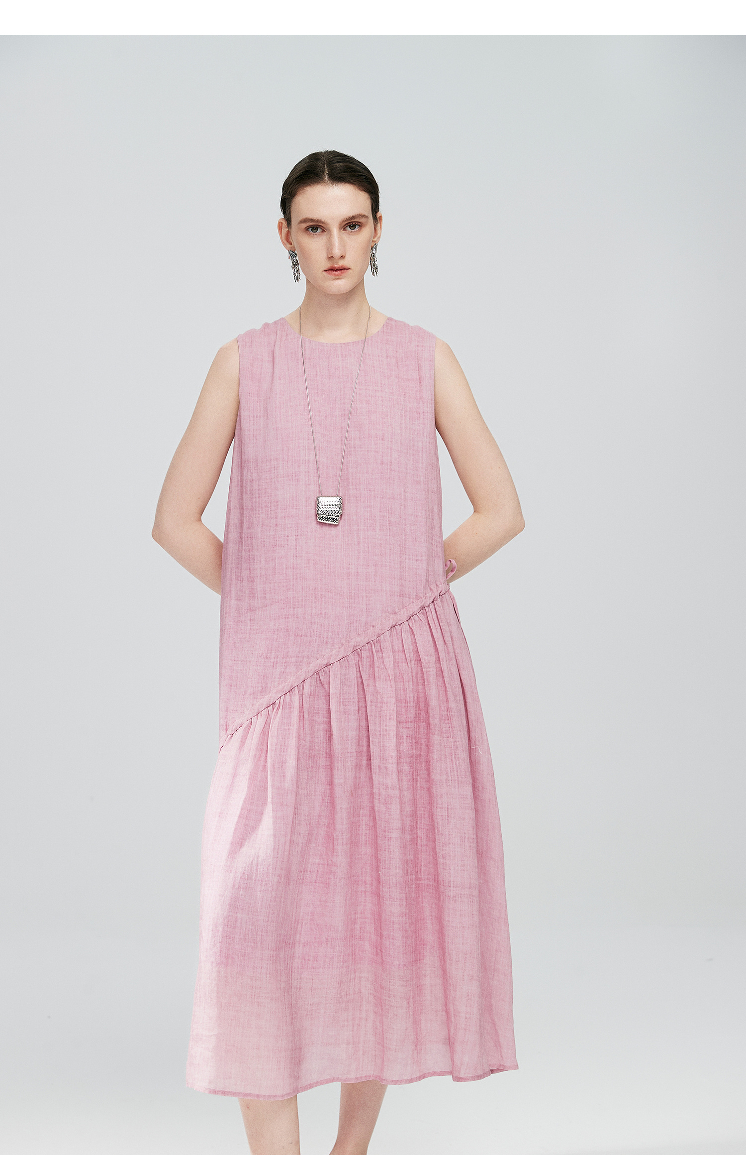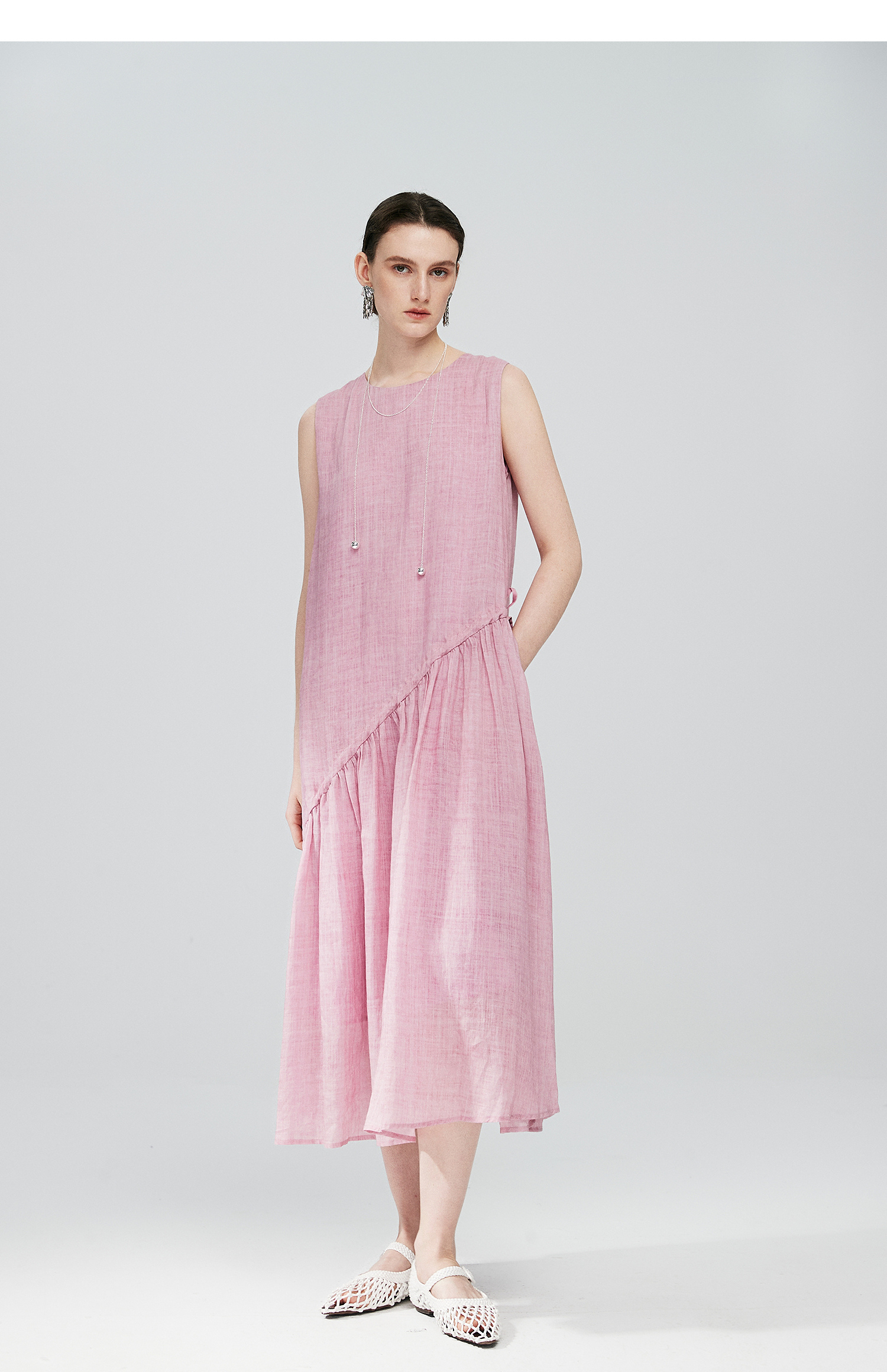 棉仓363616036-初棉海石竹粉-海滨度假风苎麻天丝不对称连衣裙