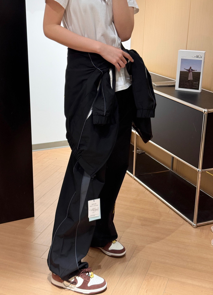 裤脚内置隐藏式抽绳设计,告别传统运动裤的单一版型。松开抽绳时,呈现利落直筒阔腿形态,修饰腿型、拉长比例;收紧抽绳后,秒变束脚运动风,