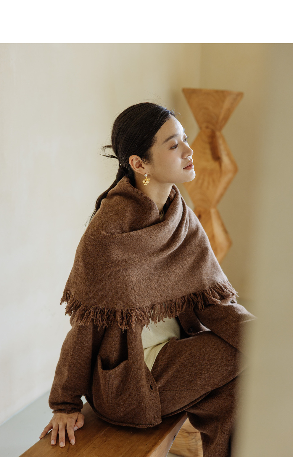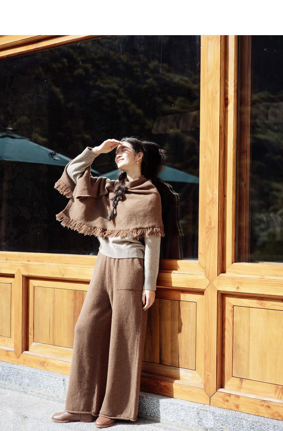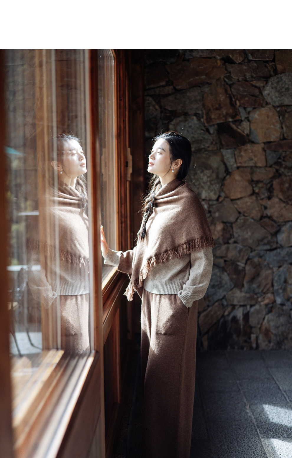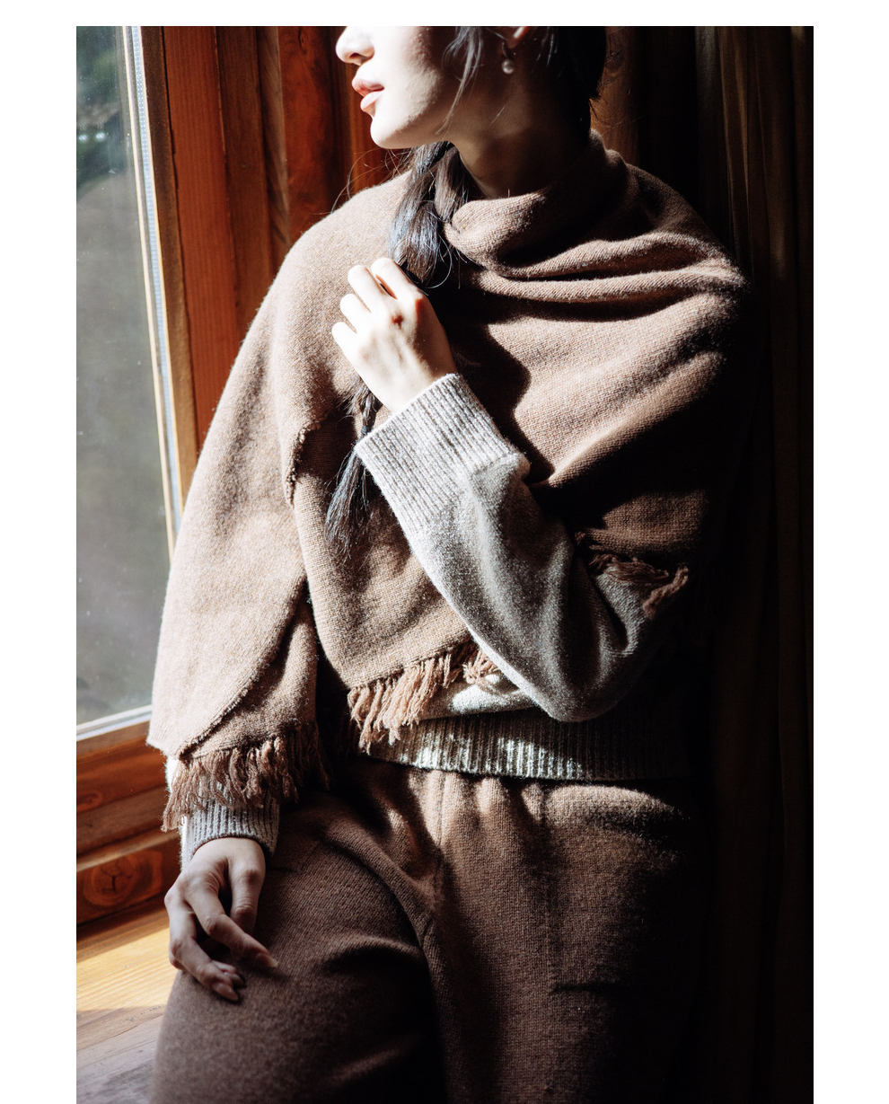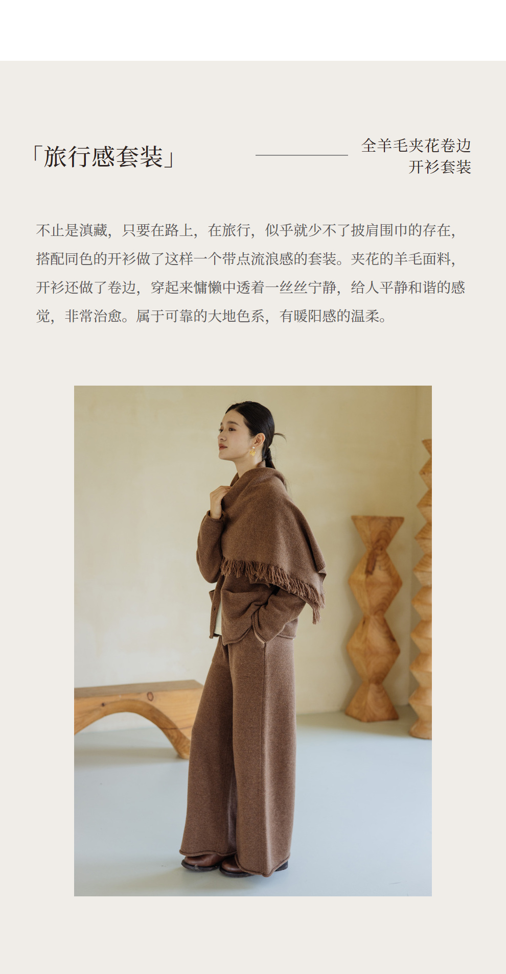 绽放328-366朵/全羊毛夹花卷边文艺女旅行感流苏毛衣开衫披肩套装