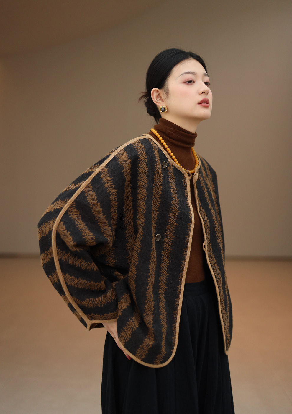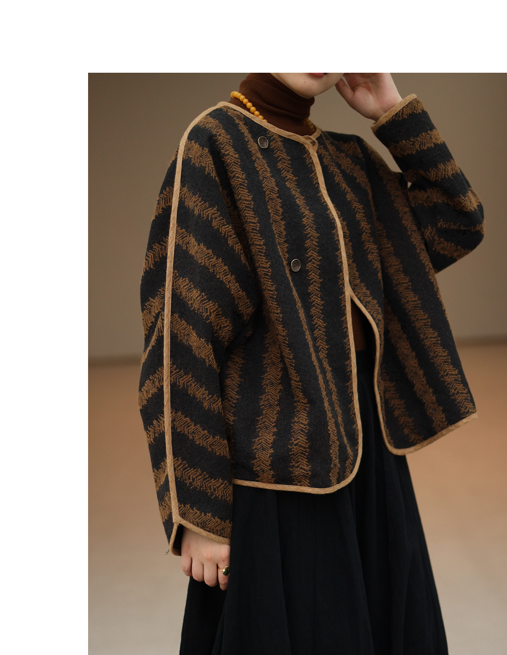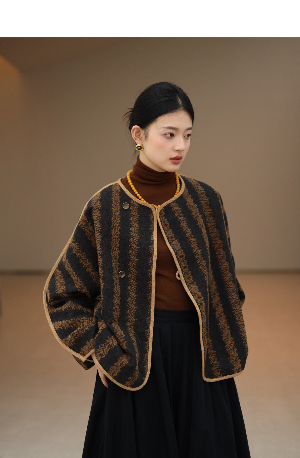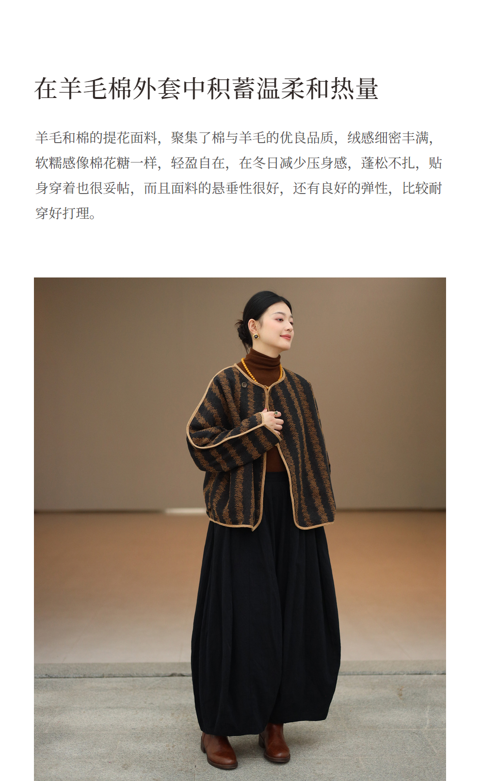 绽放831朵/黑咖提花复古高端羊毛宇航棉自发热开襟撞色边毛呢外套