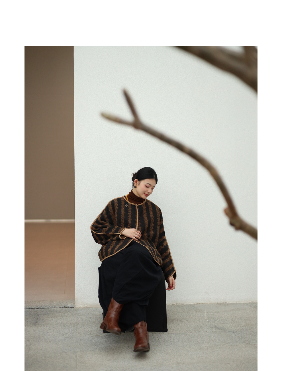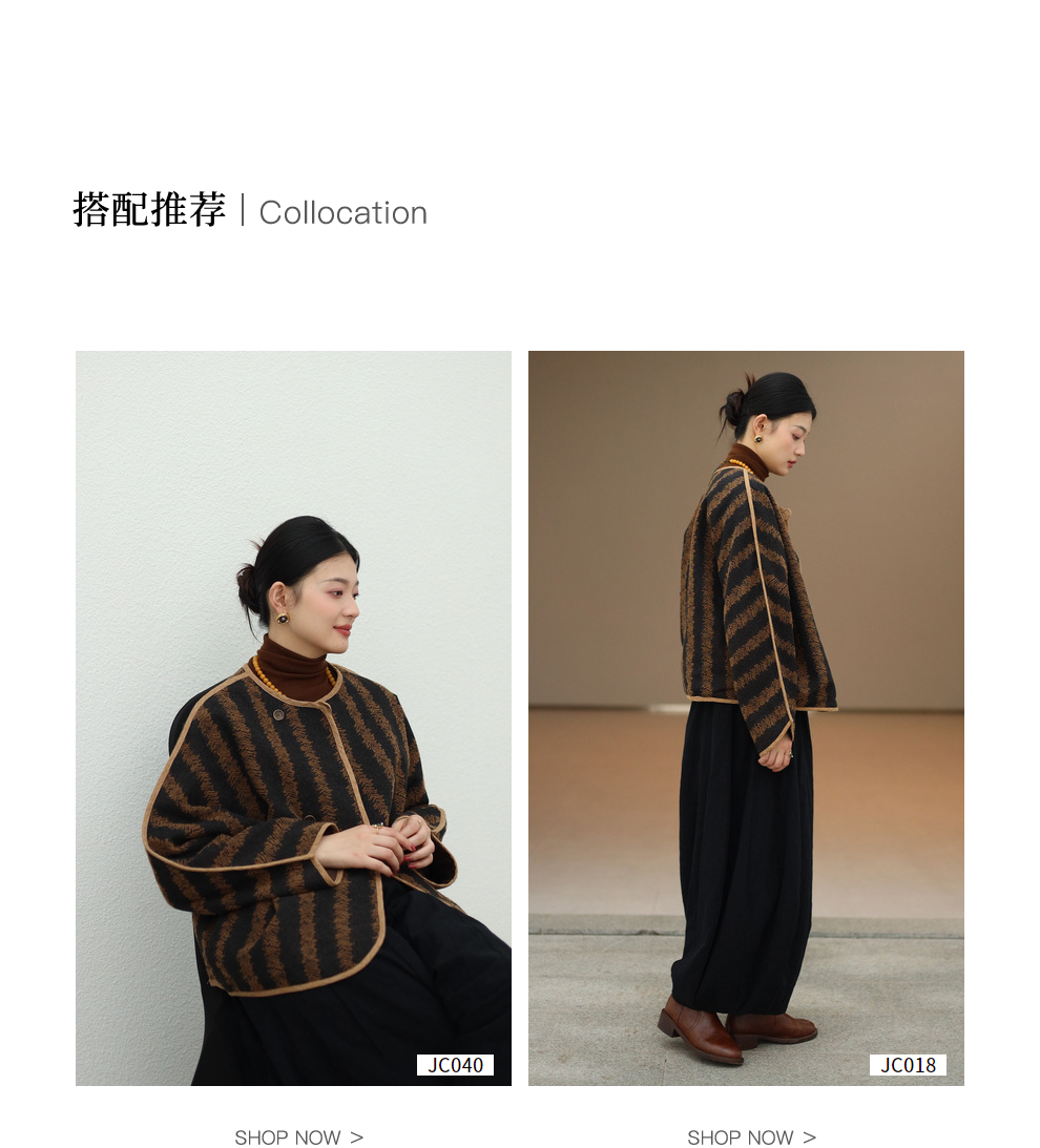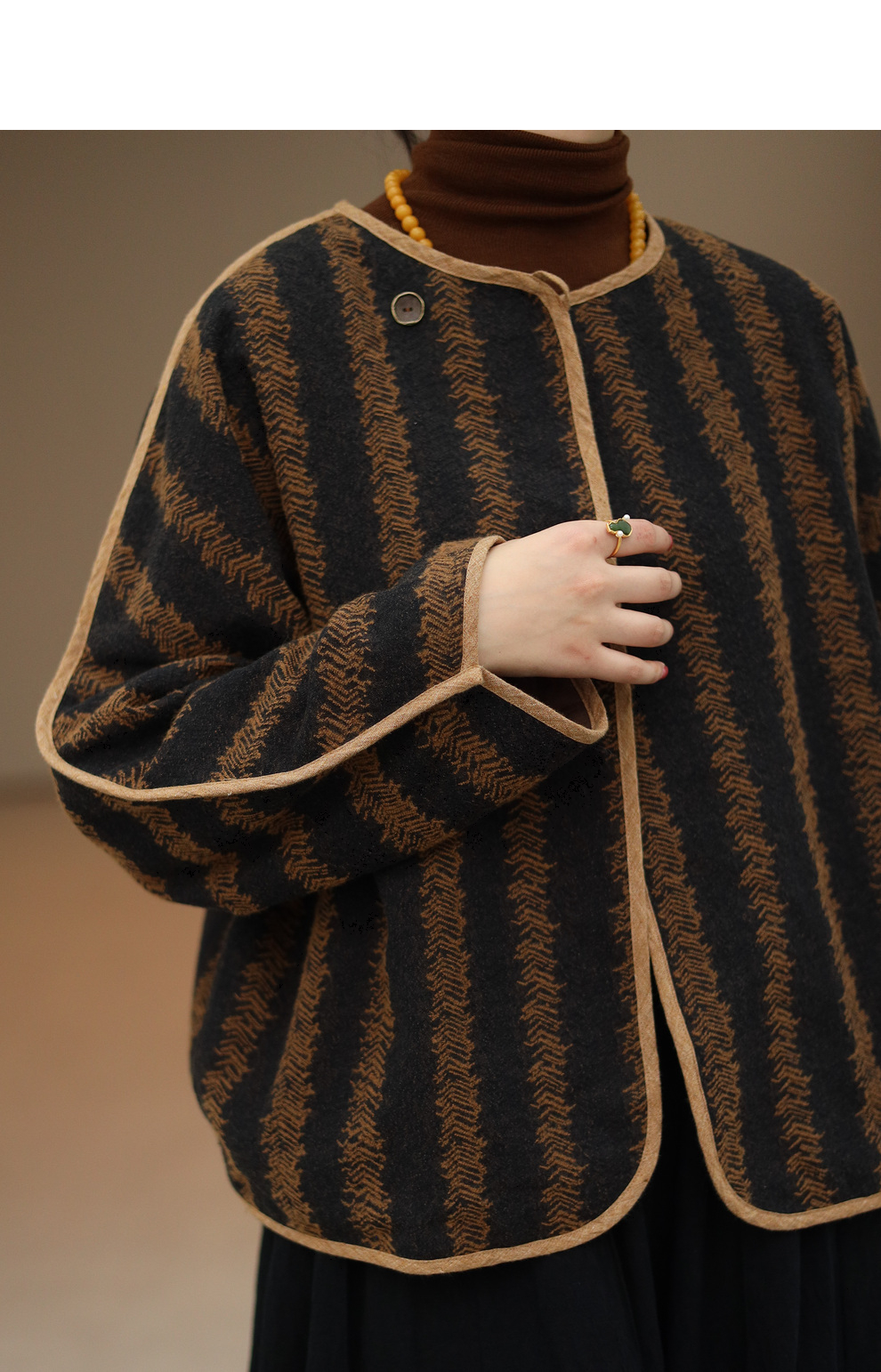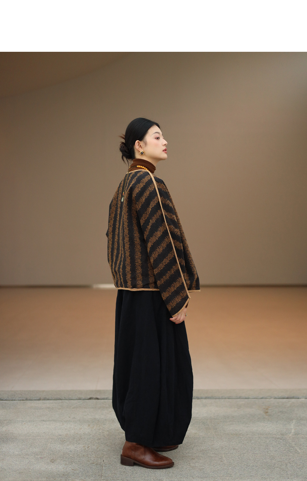 绽放831朵/黑咖提花复古高端羊毛宇航棉自发热开襟撞色边毛呢外套