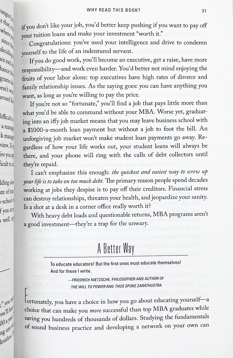 Many people assume that they need to attend business school to learn how to build a successful business or advance in their career. That’s simply not true. The vast majority of modern business practice requires little more than common sense, simple arithmetic, and knowledge of a few very important ideas and principles.