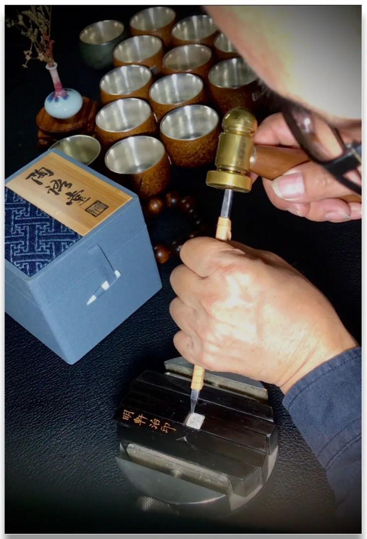 主人杯,是爱茶之人的标配。一款做工精良、大方得体的主人杯随身,不单是身份与品位的象征,更是饮茶健康与卫生的保障。陶语堂·鎏银主人杯,系老茶鬼在西泠印社篆刻班的同班学员颜明轩先生手作。单杯总重约150克,鎏银净重约10克,杯身镶嵌主人姓氏加厚银片,皆为篆刻家颜明轩先生手工凿制,一杯一品,传递指间温暖,彰显不俗品味。