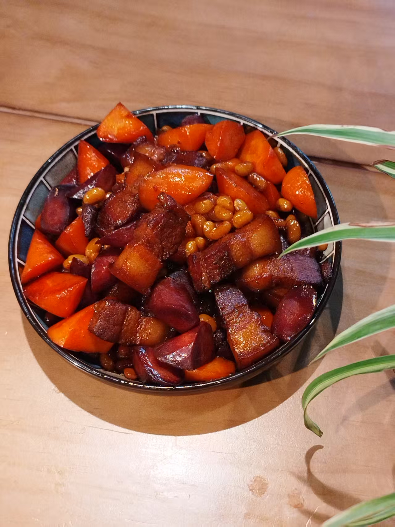 原料:牧童心五花肉,沃翠源黄豆,蜗牛农场胡萝卜,有机酱油/老抽,江禄香叶,汇耕田八角&沙姜片,有机冰糖,小黄姜、辣椒干