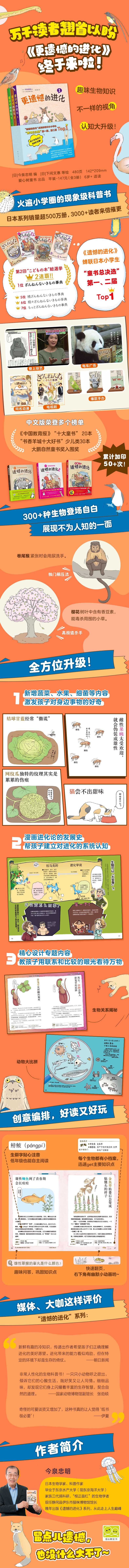 【媒体评论】1.新鲜有趣的冷知识,传递出作者希望孩子们正确理解进化的美好愿望。进化带来的能力看似鸡肋,但在特定的环境下却是生存的倚仗。朝日新闻
