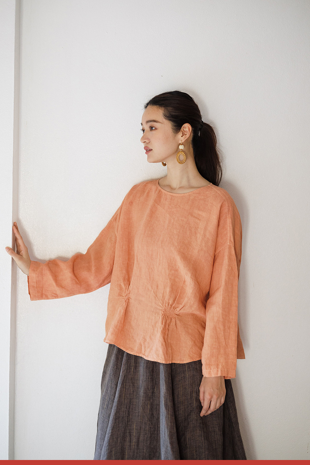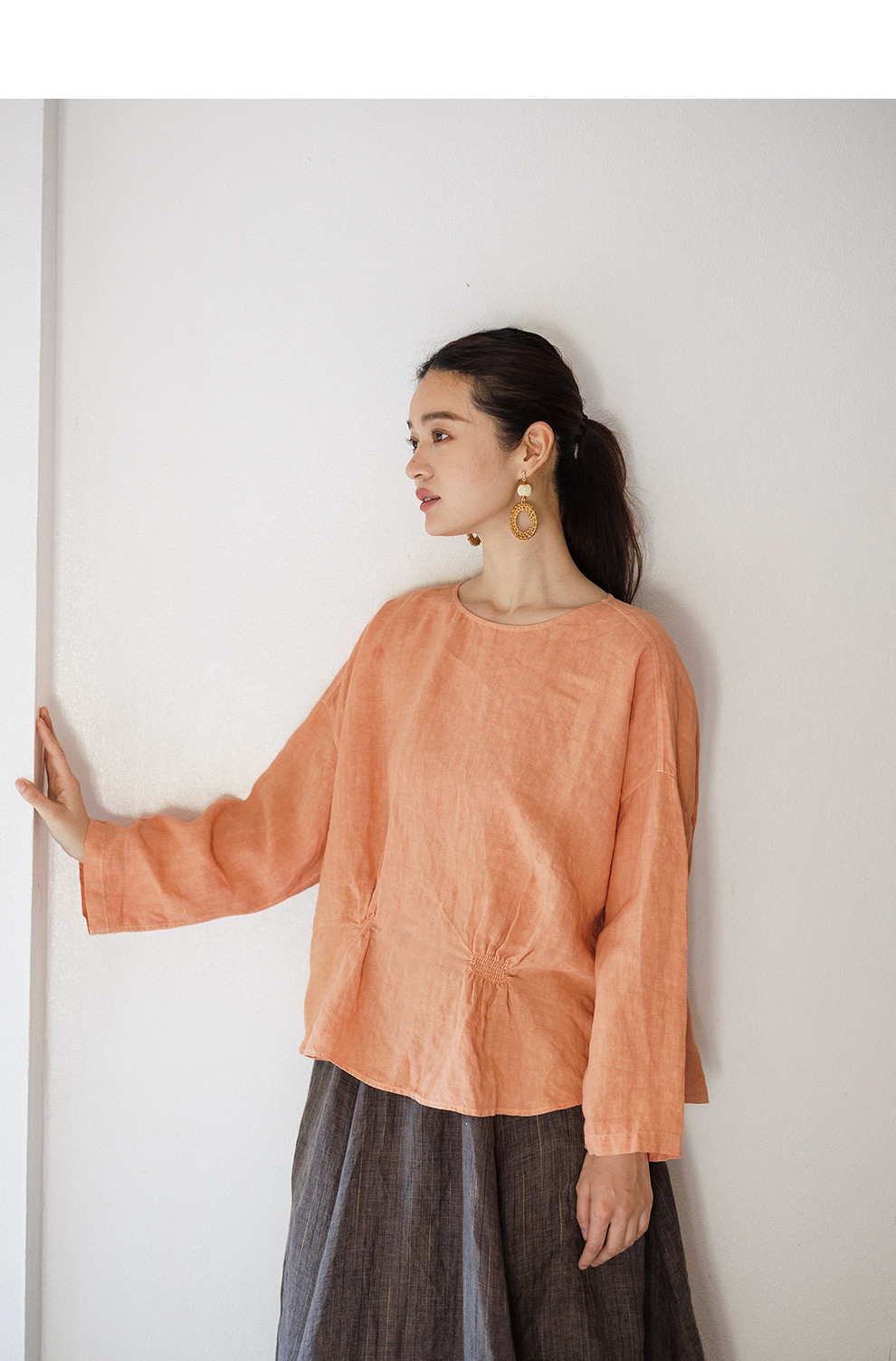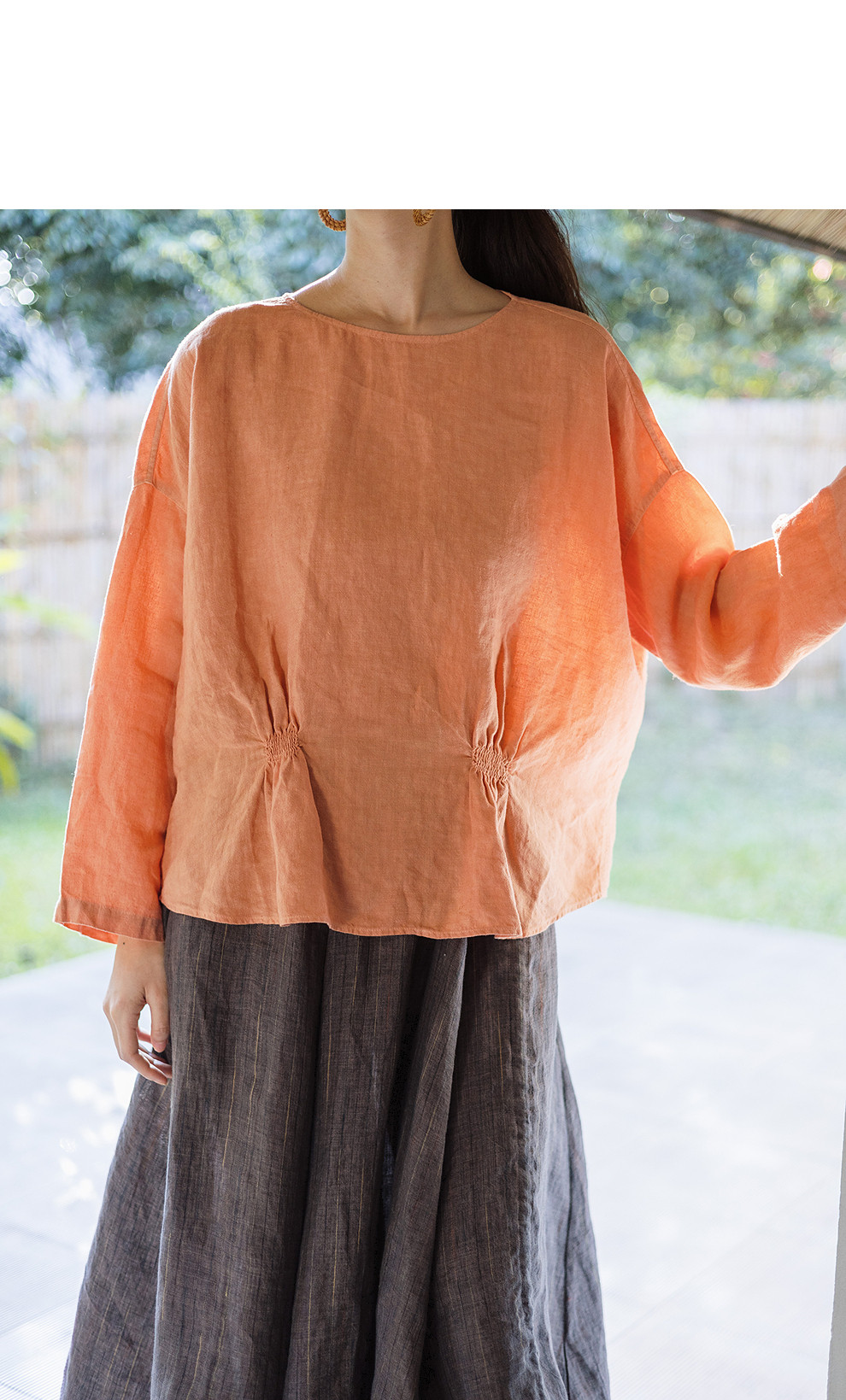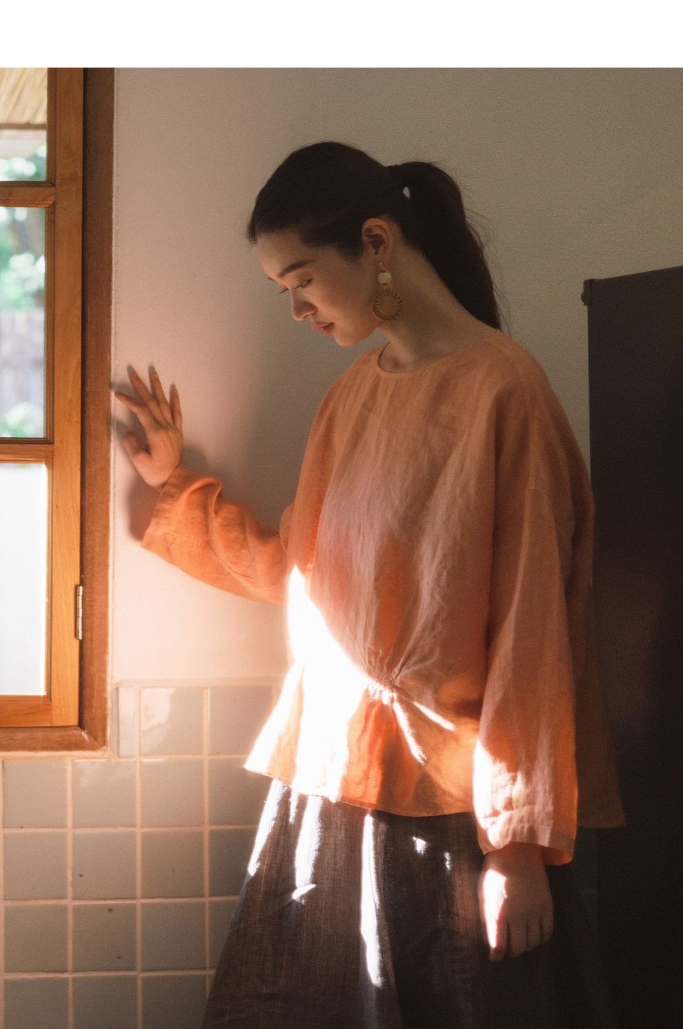 绽放158朵/亚麻成衣染色圆领落肩长袖T恤女宽松显瘦新款小衫百搭