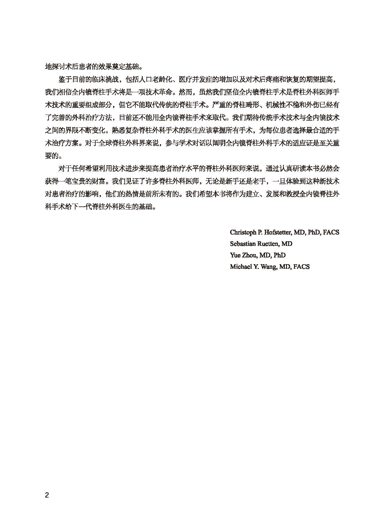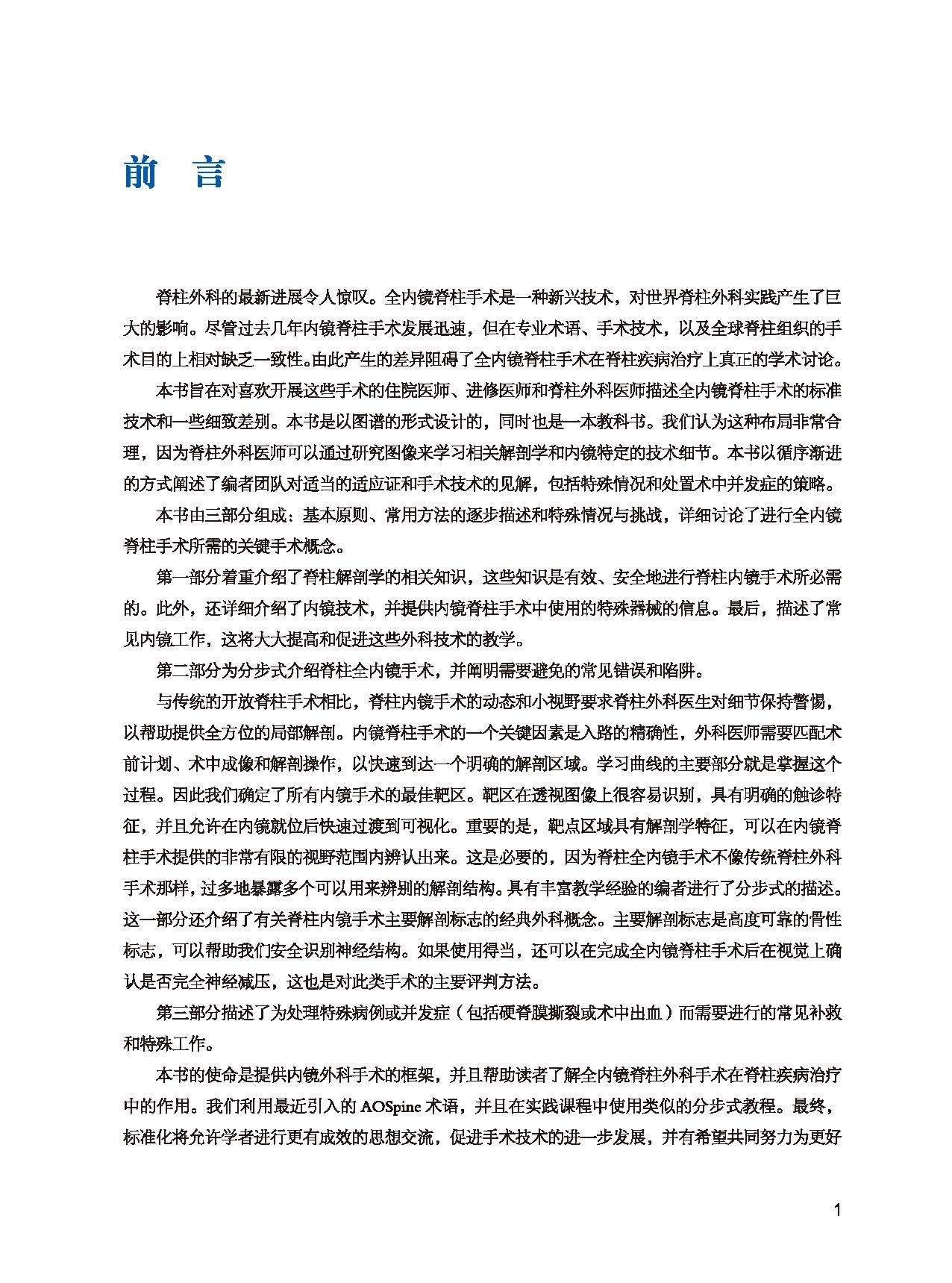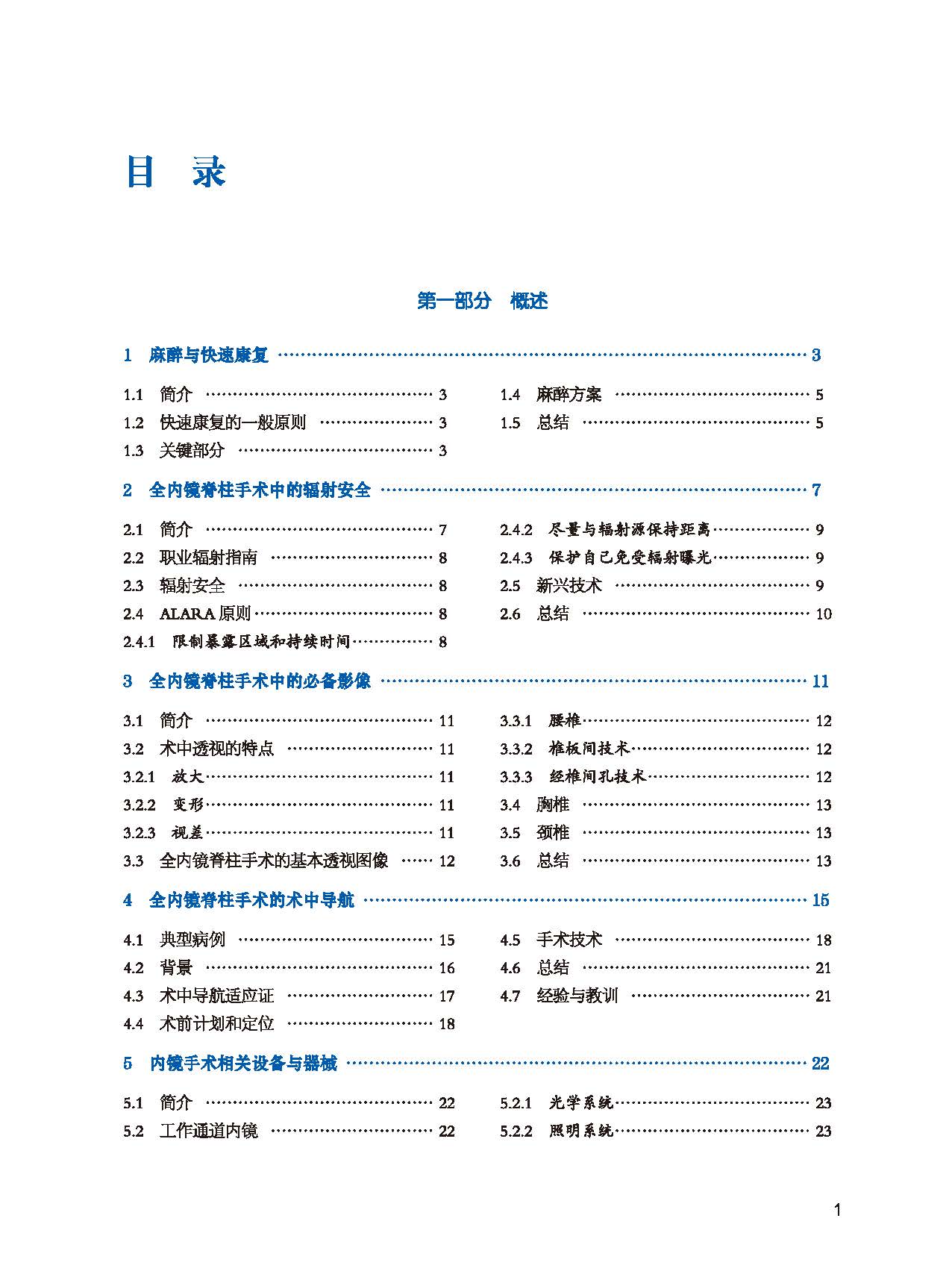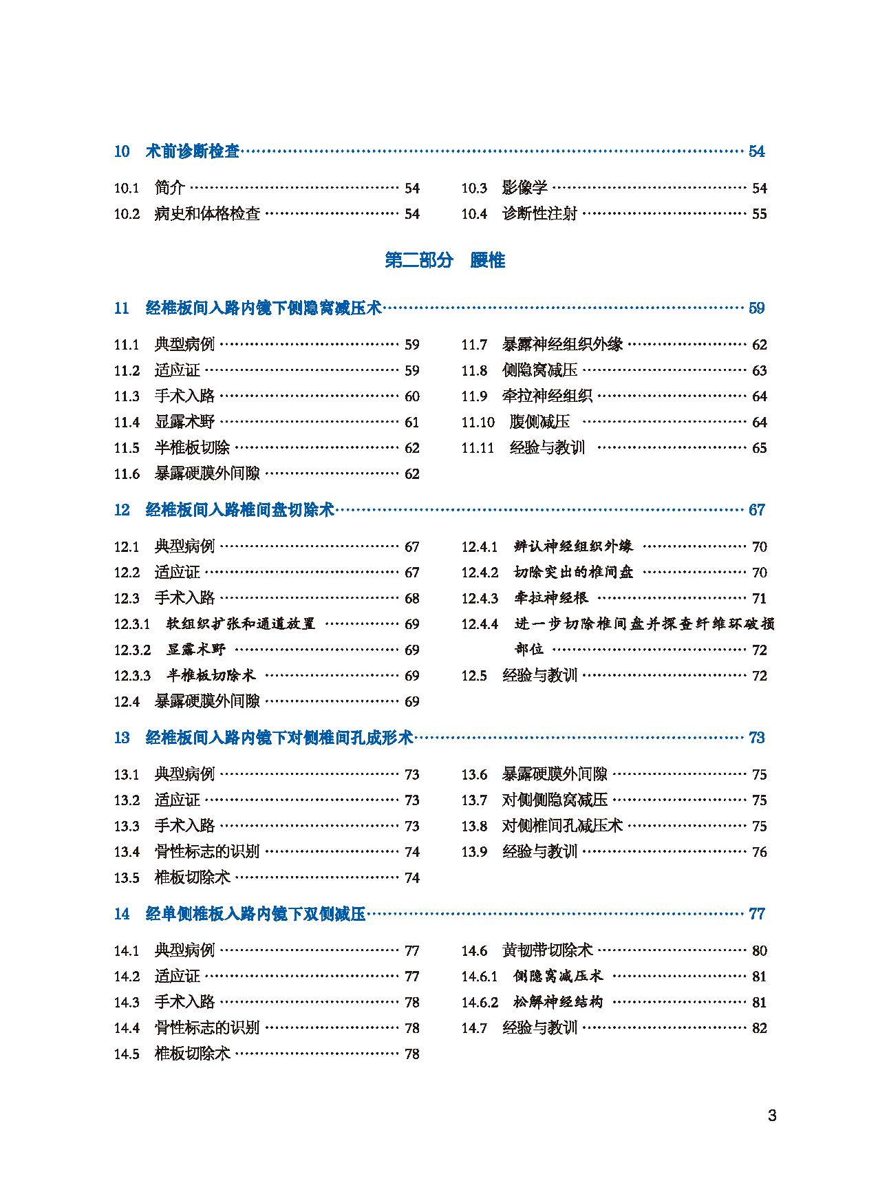 本书分为五部分,第一部分为基础篇,介绍全内镜脊柱手术的麻醉、设备、影像准备等;第二至第四部分按照腰椎、胸椎、颈椎部位分篇,分步骤详细介绍了内镜脊柱外科手术在脊柱各个部位的应用;复杂与疑难病例单独分篇在第五部分介绍。本书旨在总结目前全内镜脊柱外科手术的发展现状、标准化手术技术,为内镜脊柱手术的初中级学者以及志在积极学习内镜脊柱手术的医师提供一本实用的教科书。