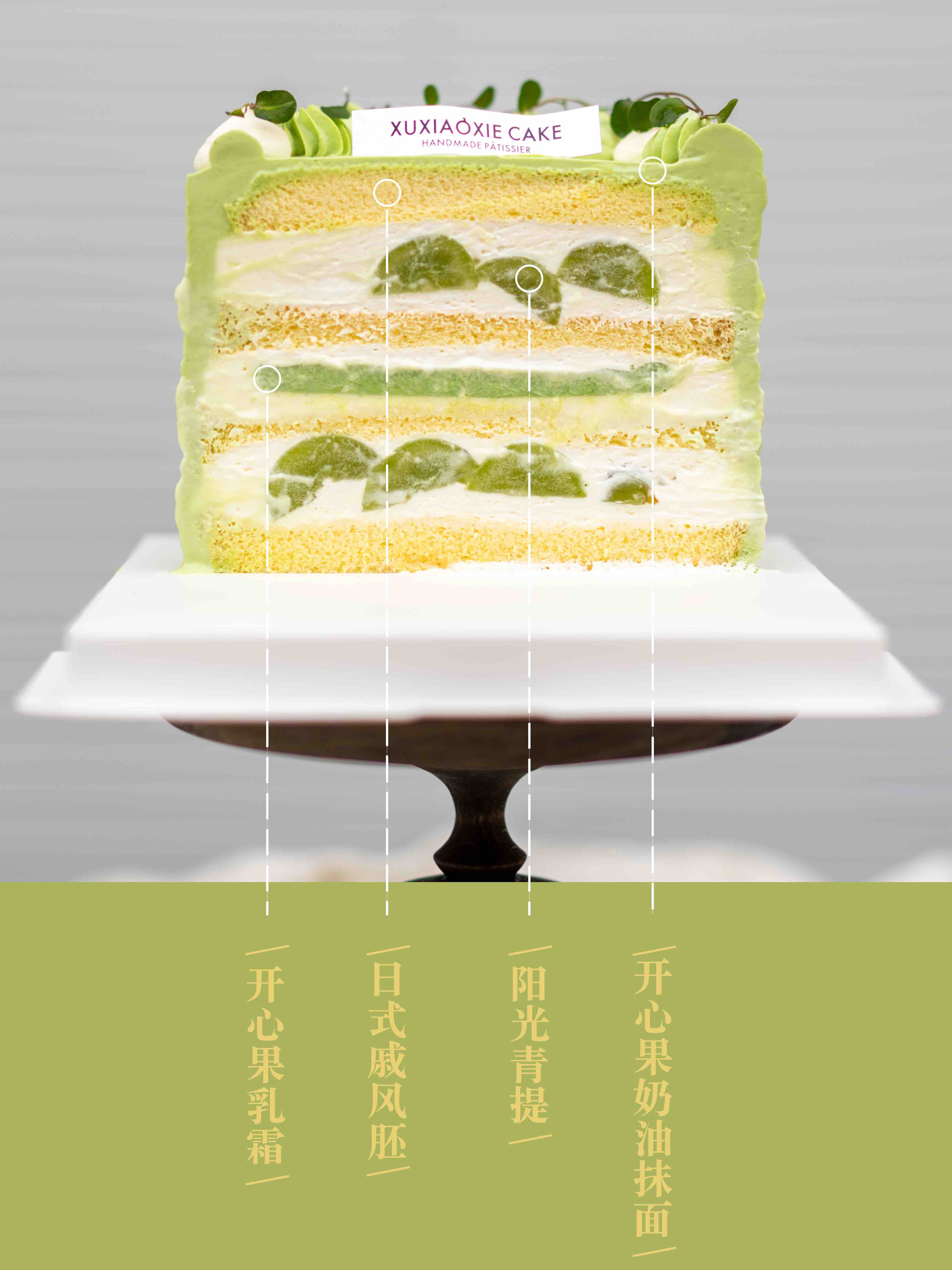 【开心果青提】4层胚3层夹心,日本进口正荣开心果酱+晴王青提+开心果凝乳。口感香醇