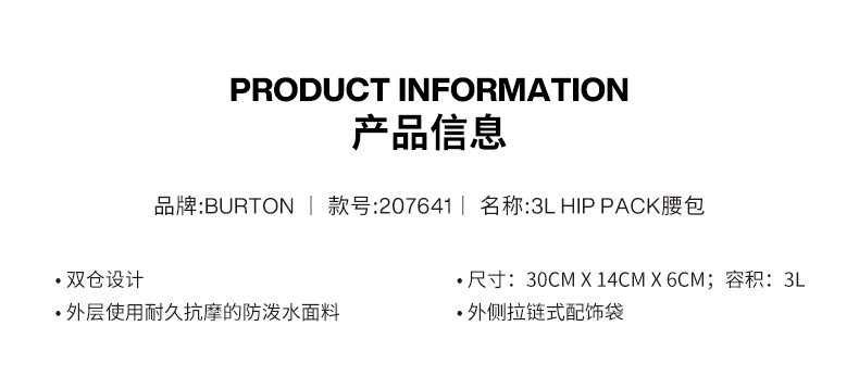 【六折清仓】 BURTON/伯顿男女3L HIP PACK腰包便携耐磨防泼水运动挎包 207641 **