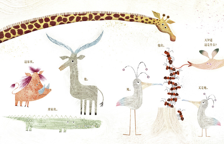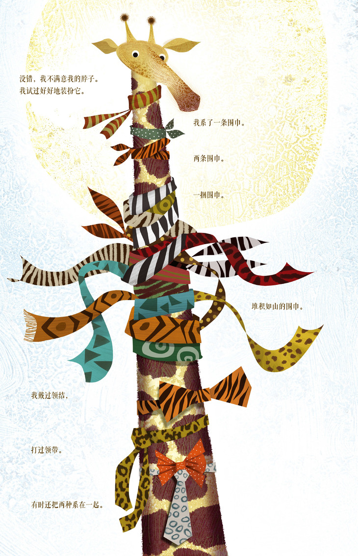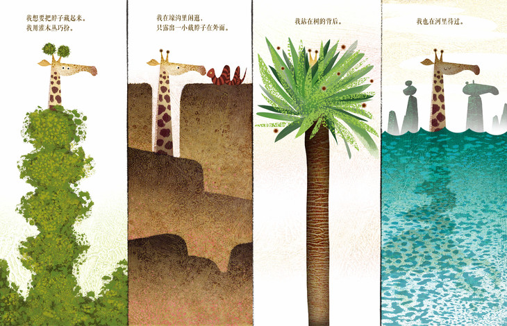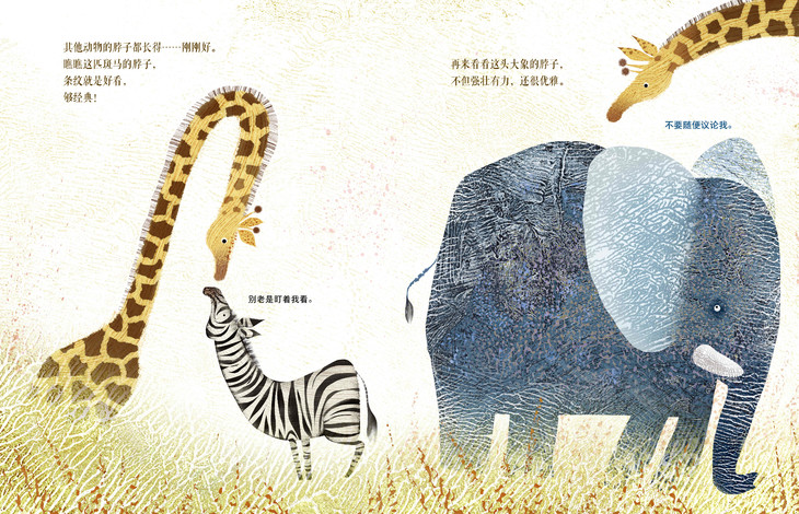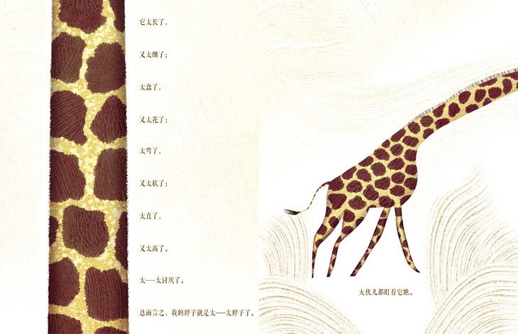 绘者充分利用长颈鹿的特点,将斑块的皮肤纹理用在前后环衬的设计上。图画采用新兴绘画材料,绘制出独属于每种动物的皮肤纹理和身体特点。电影般的运镜感受,令人期待的故事走向,造就动态翻页的效果,图文合奏极富戏剧性。