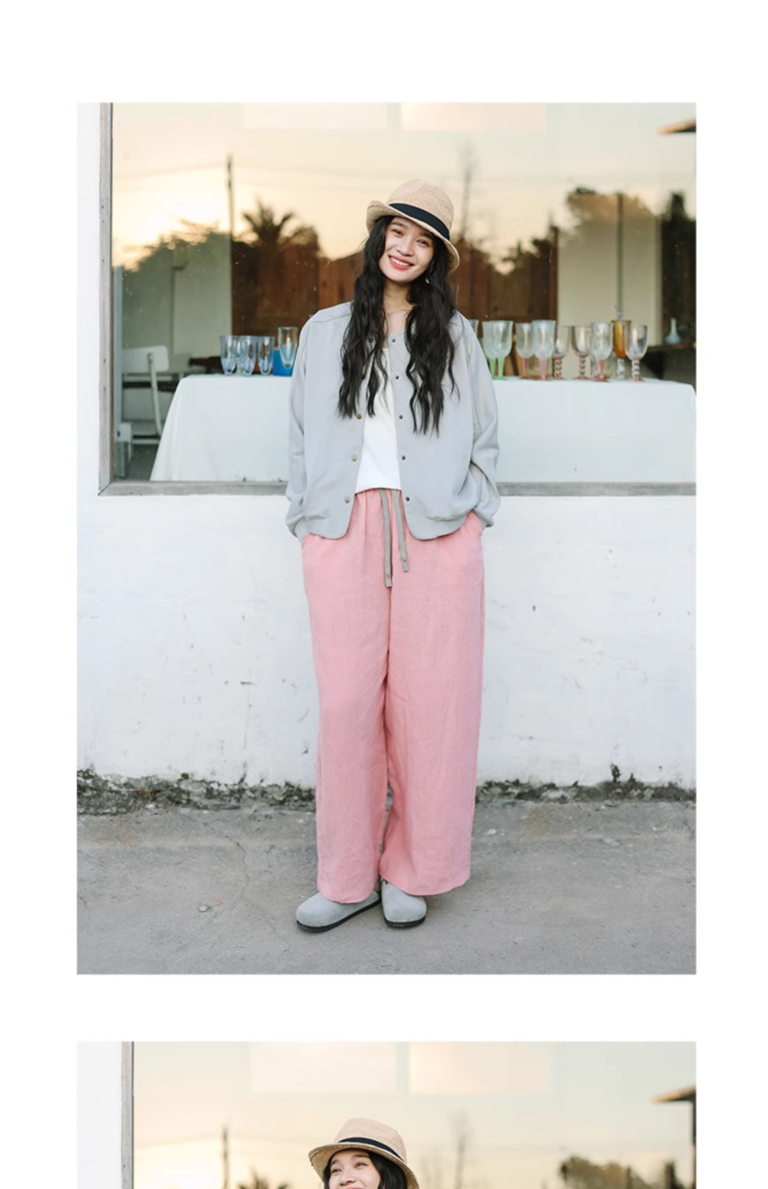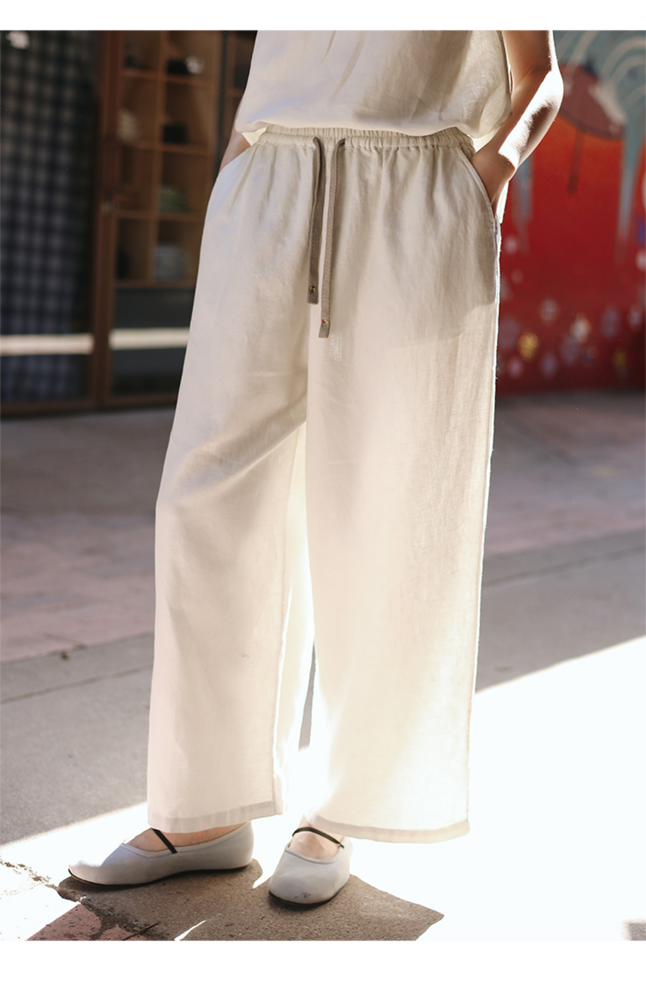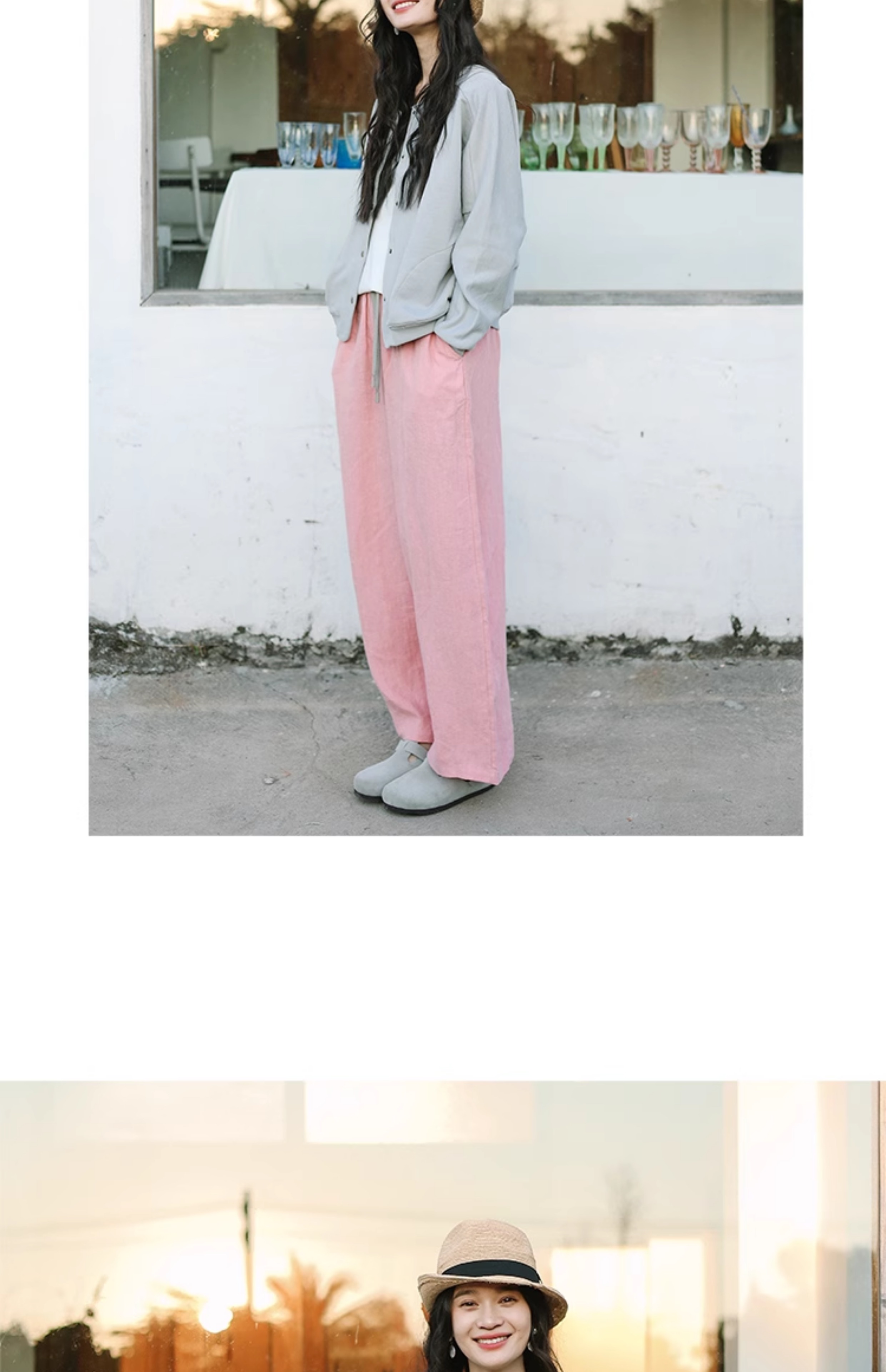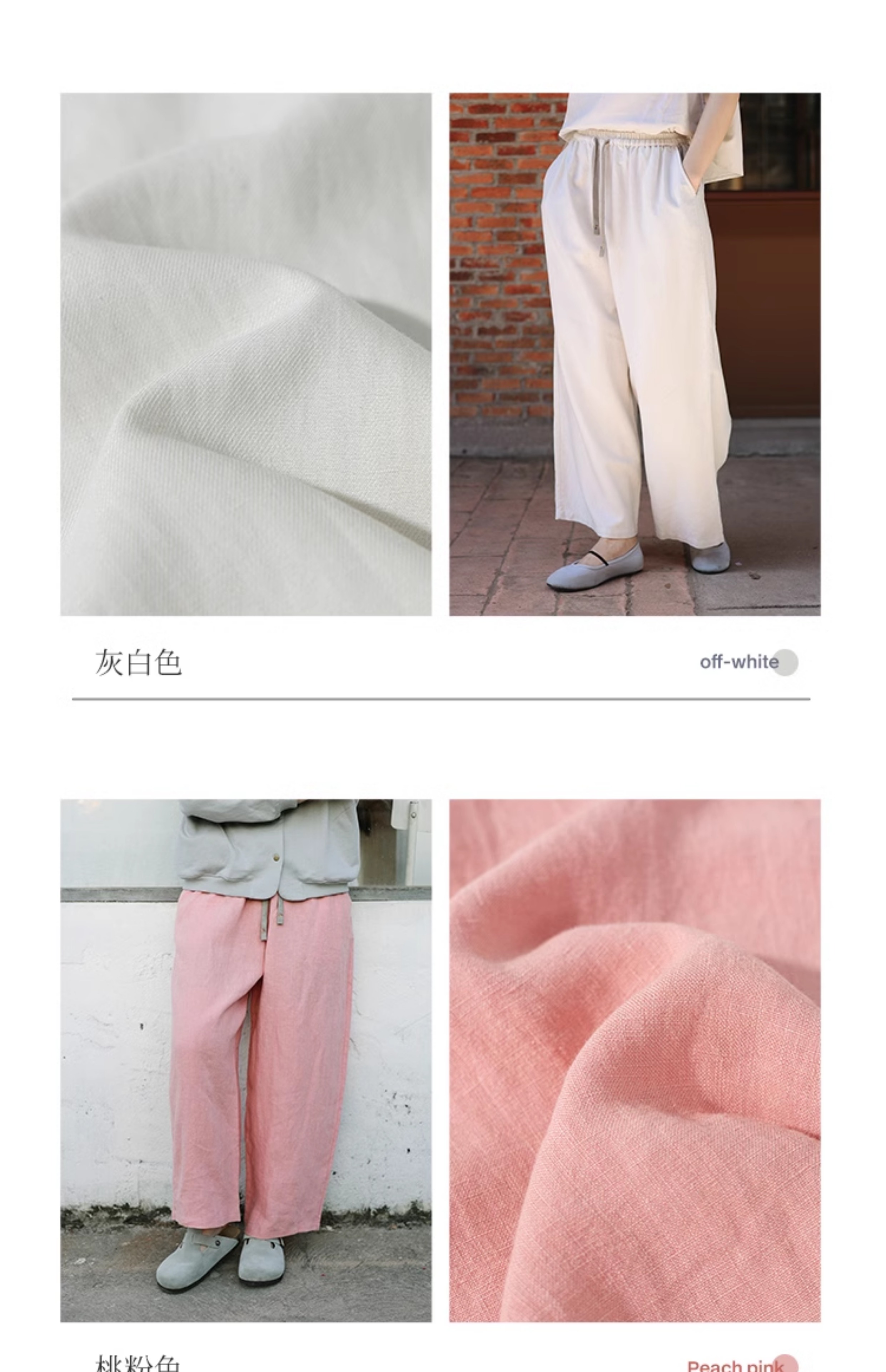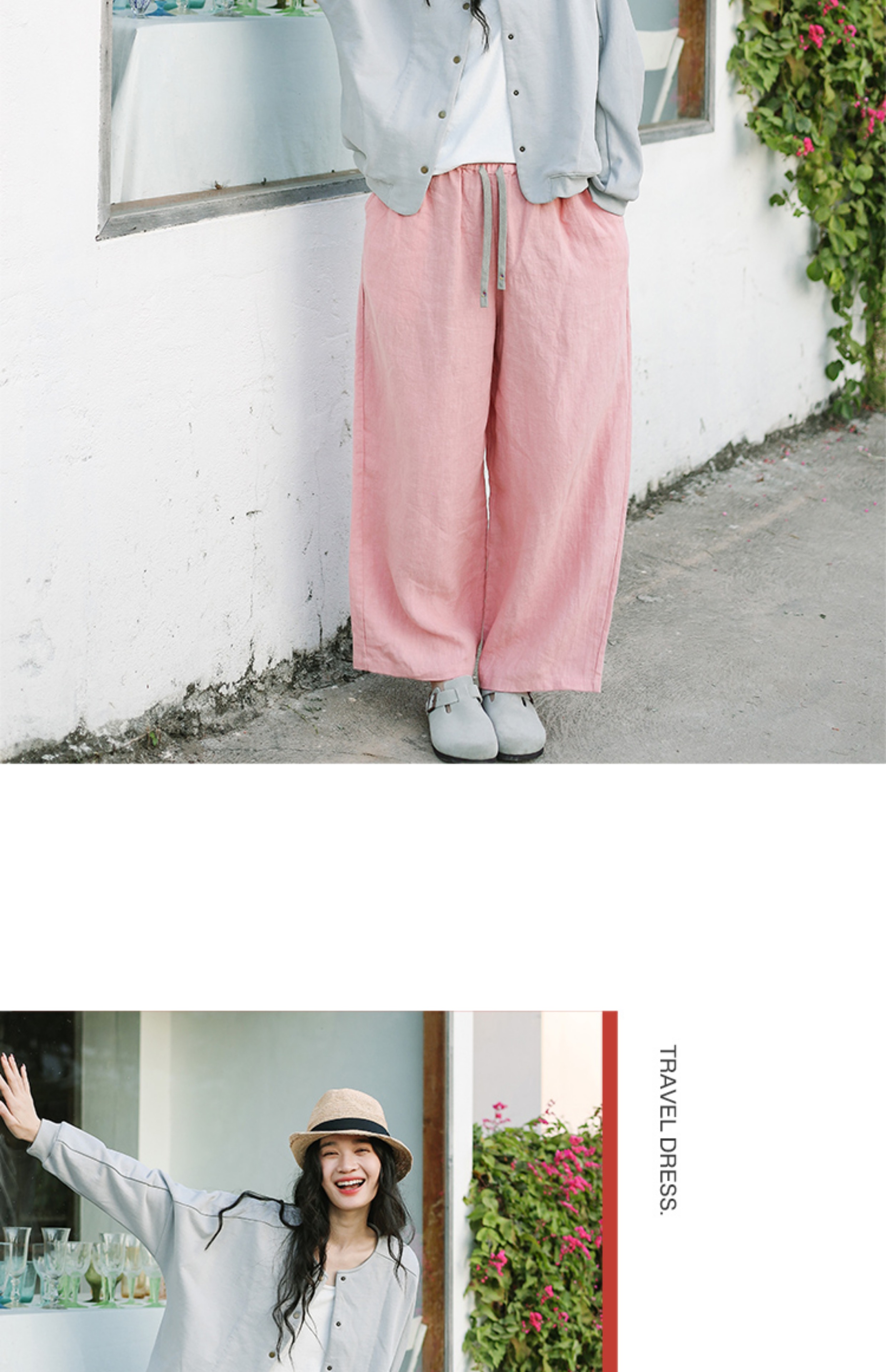 绽放旅行女装083朵/亚麻棉宽松直筒撞色系带松紧腰吸湿透气长裤