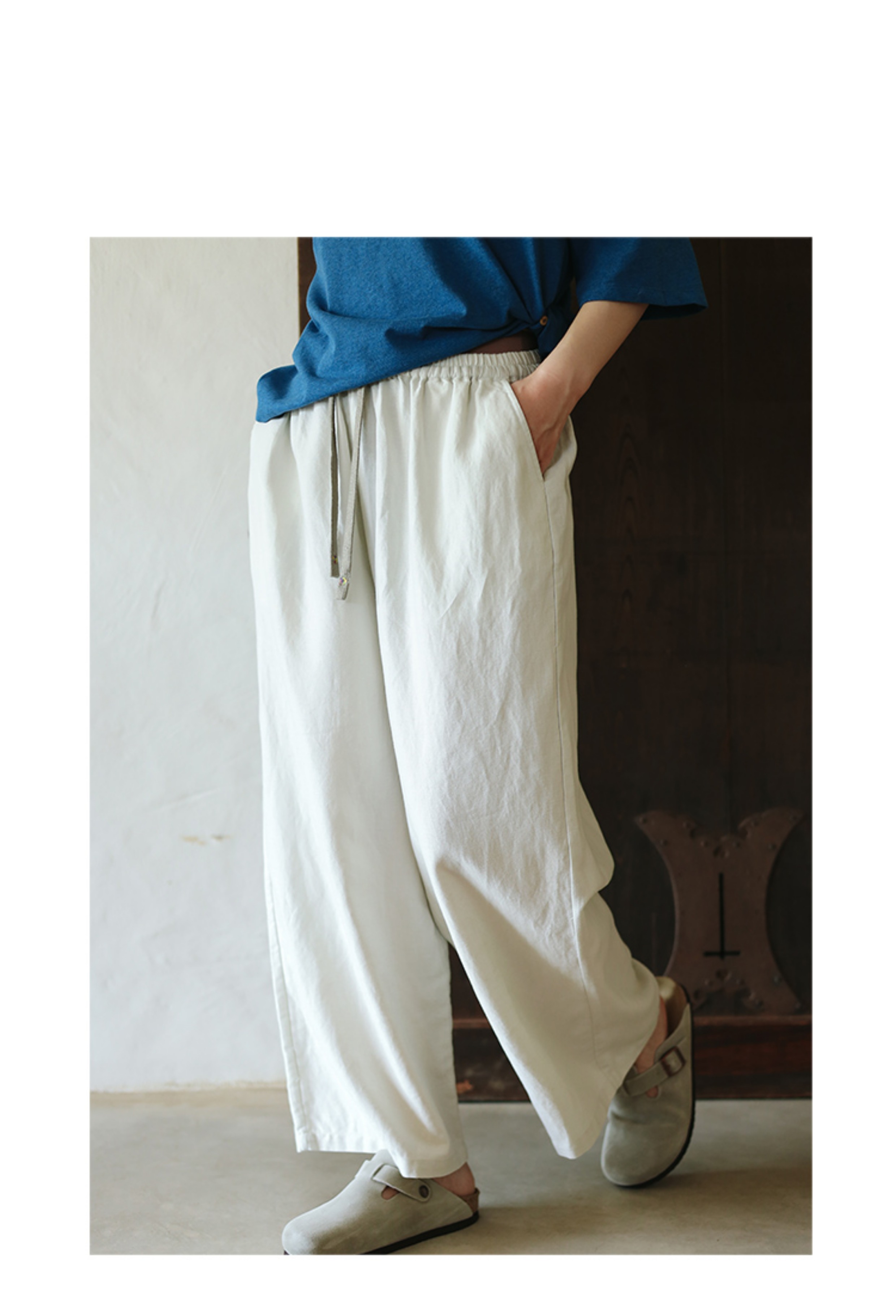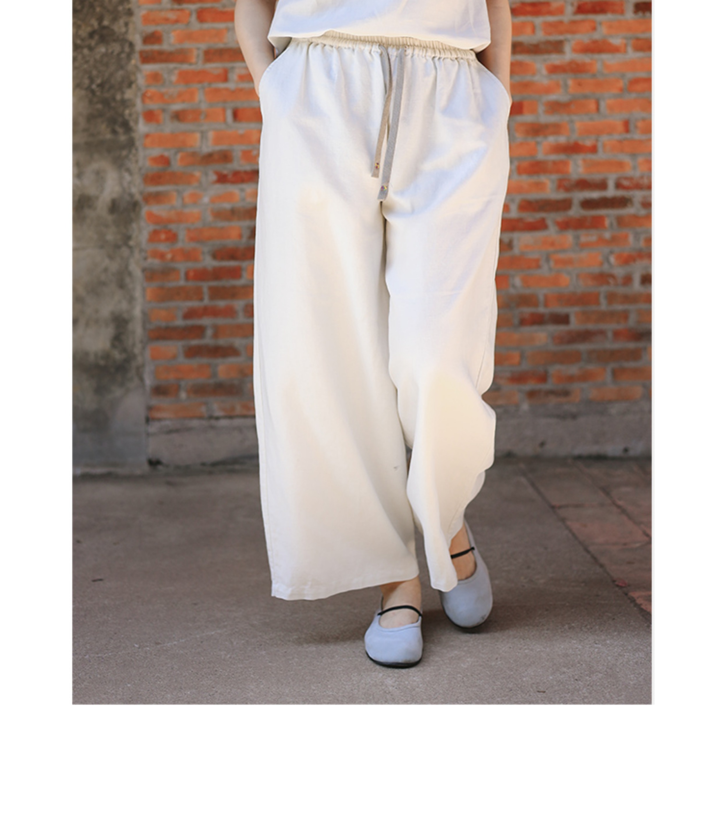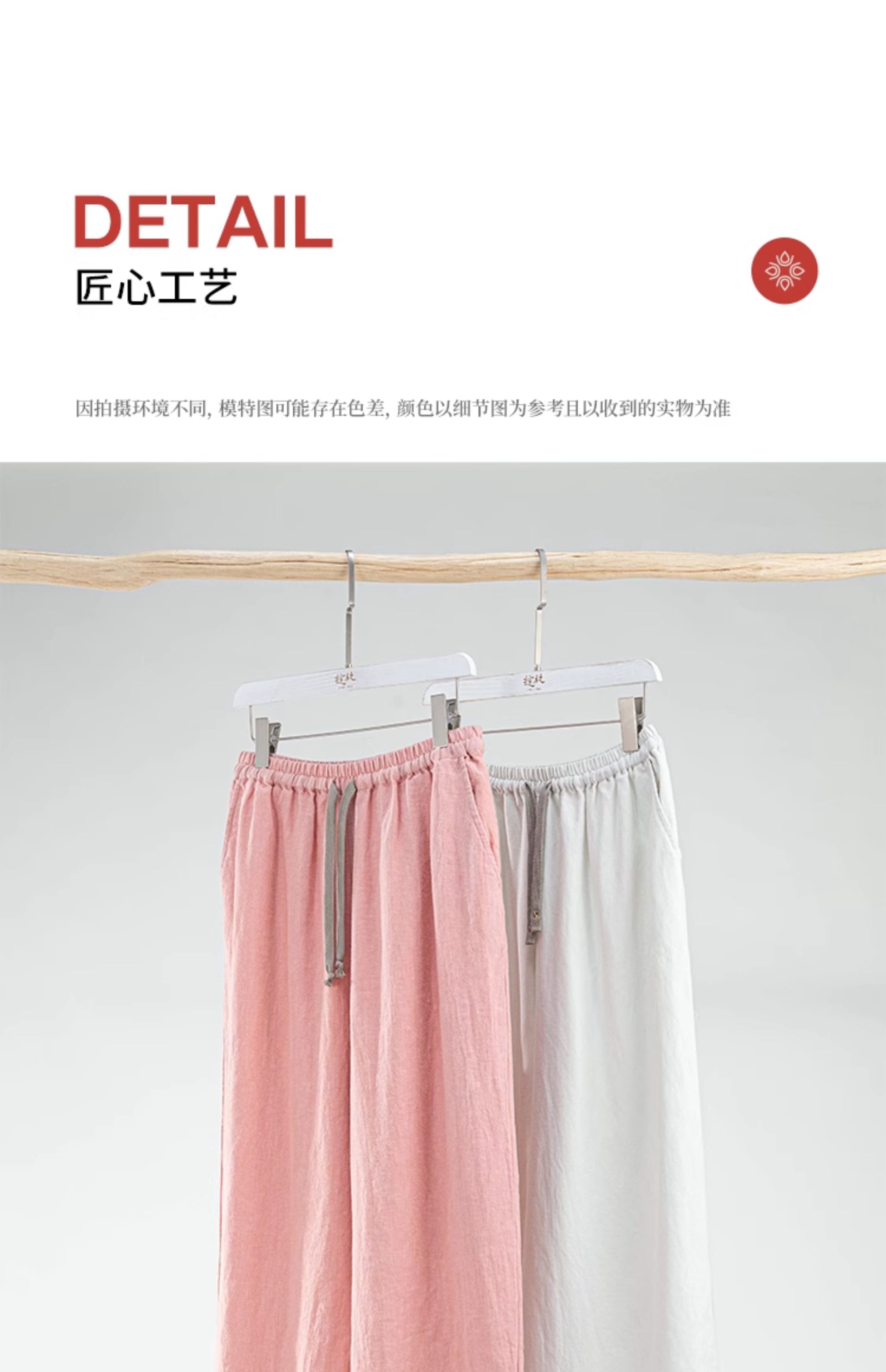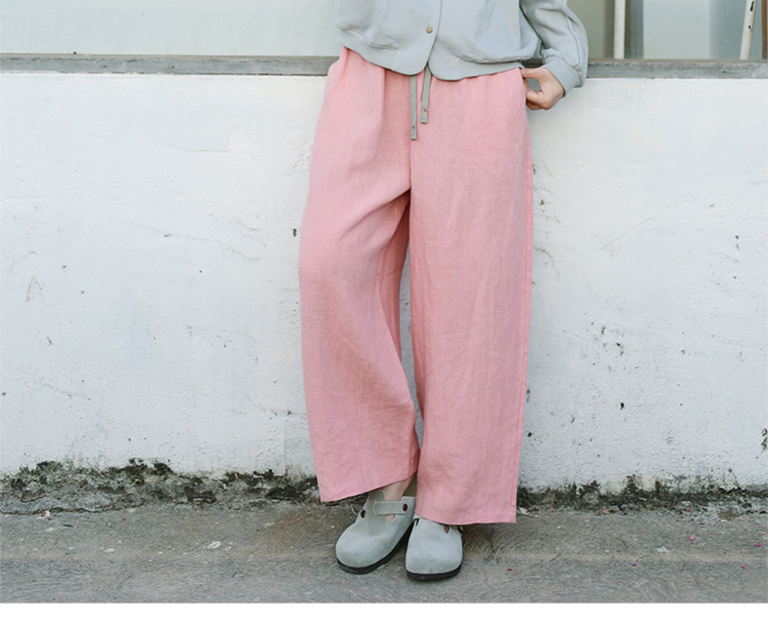 绽放旅行女装083朵/亚麻棉宽松直筒撞色系带松紧腰吸湿透气长裤