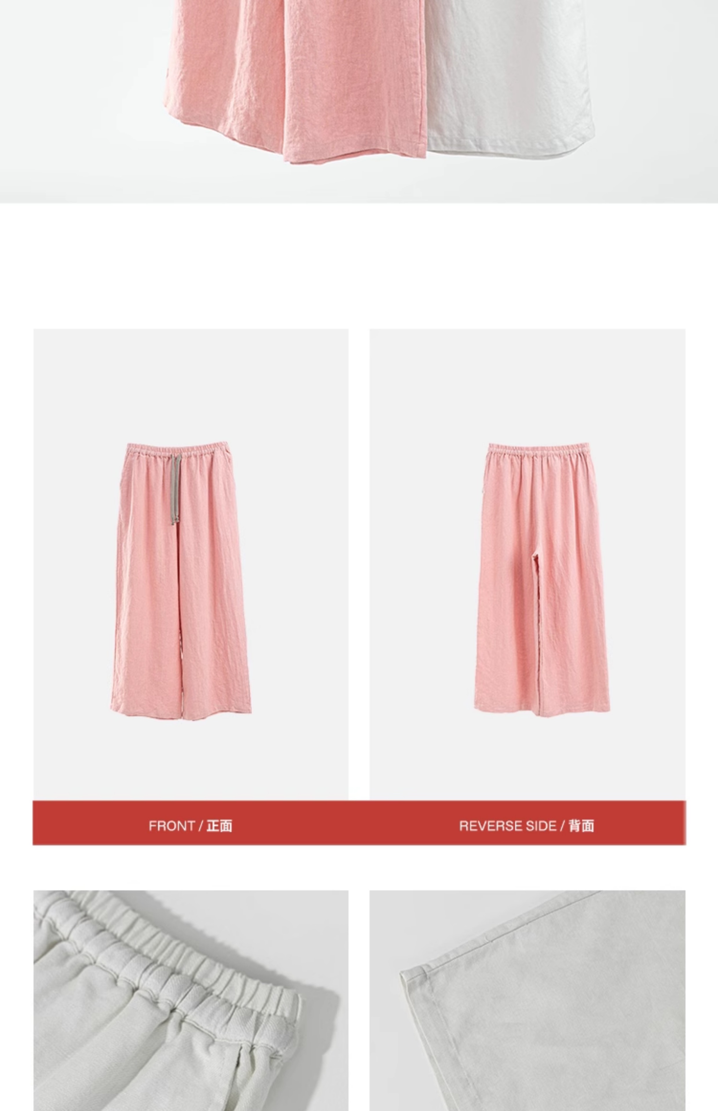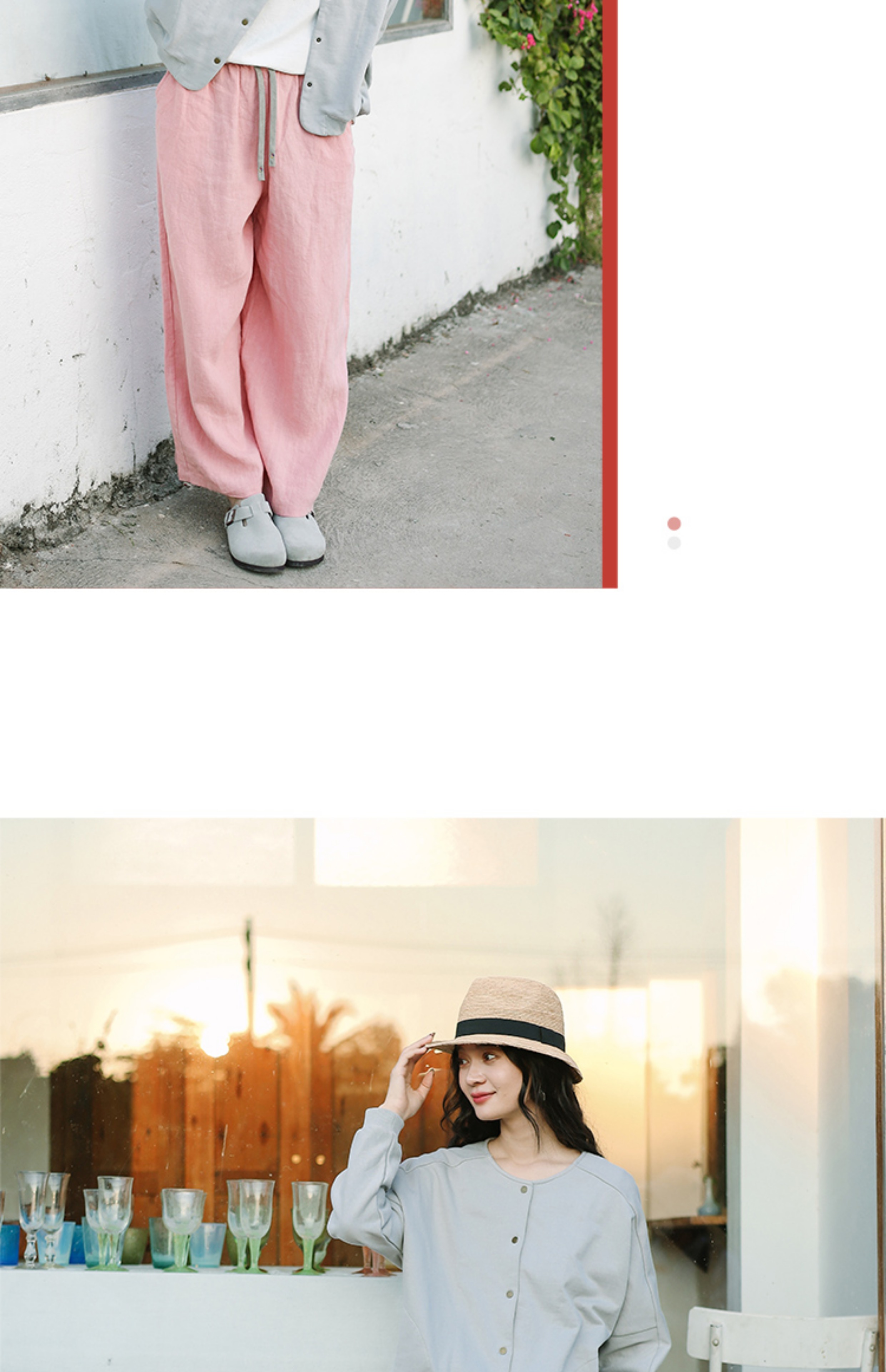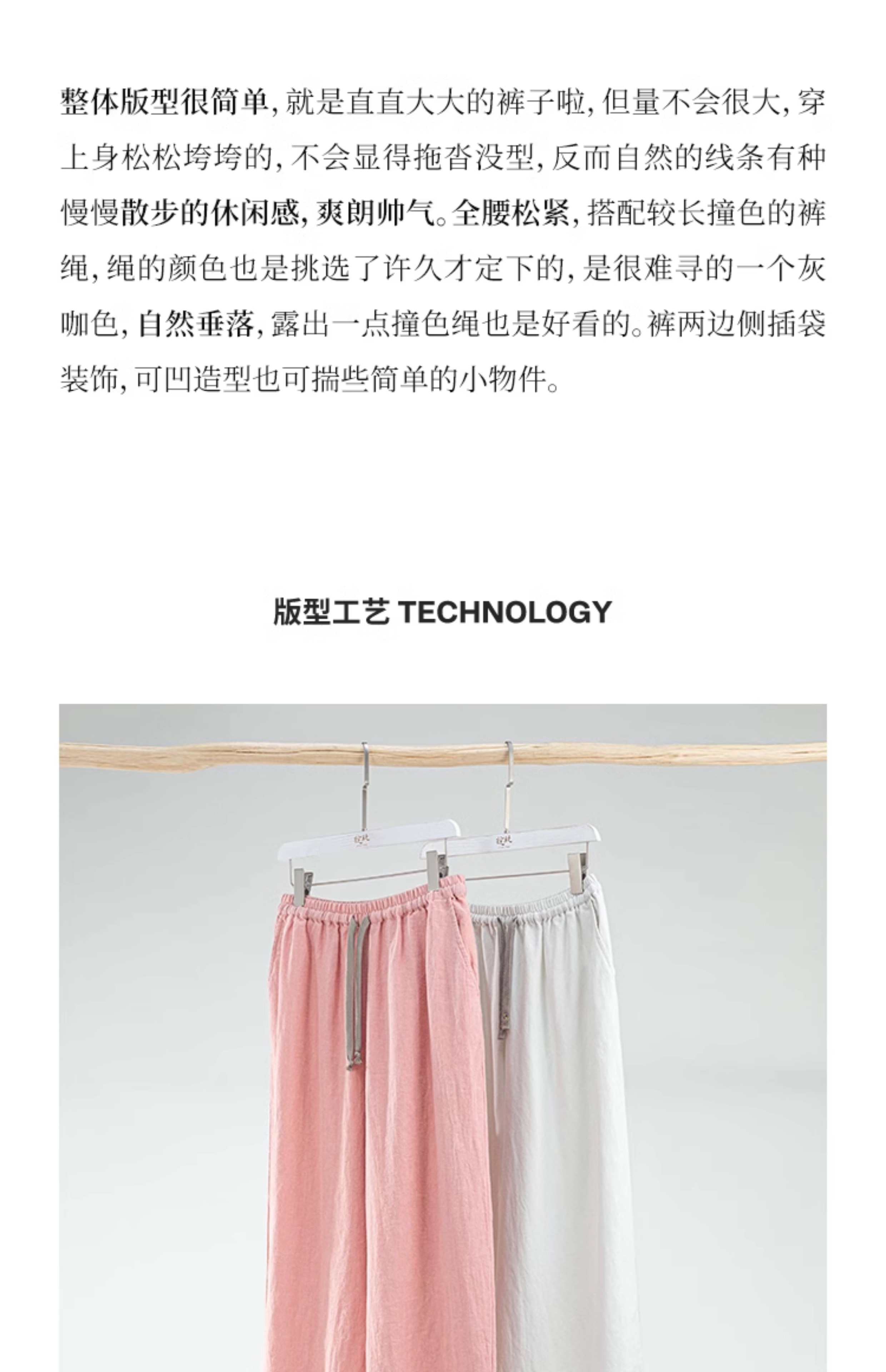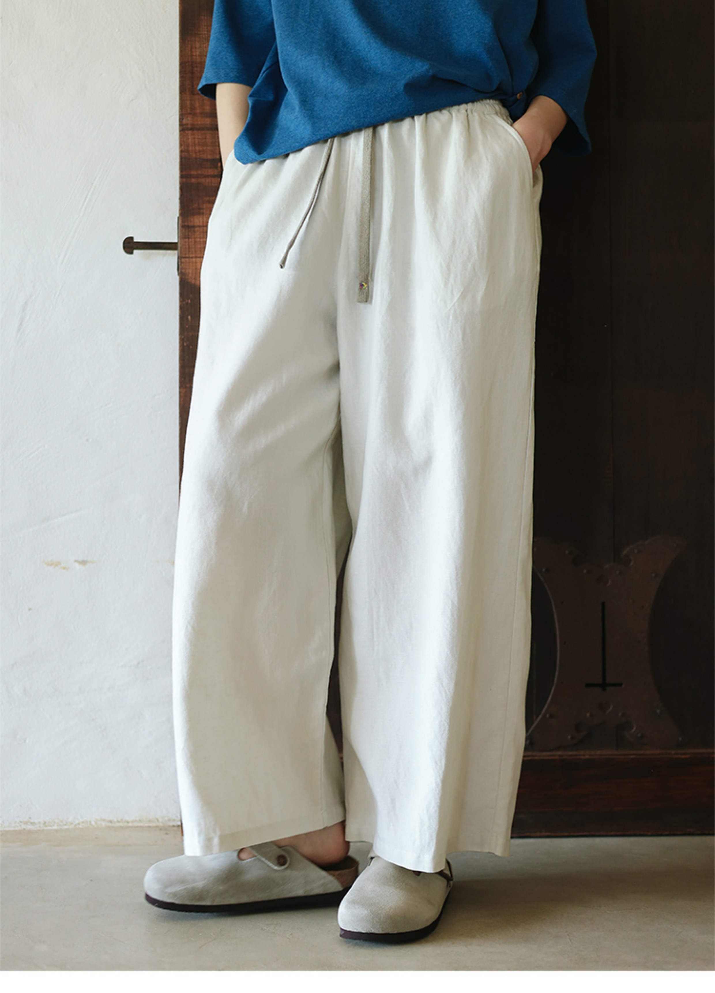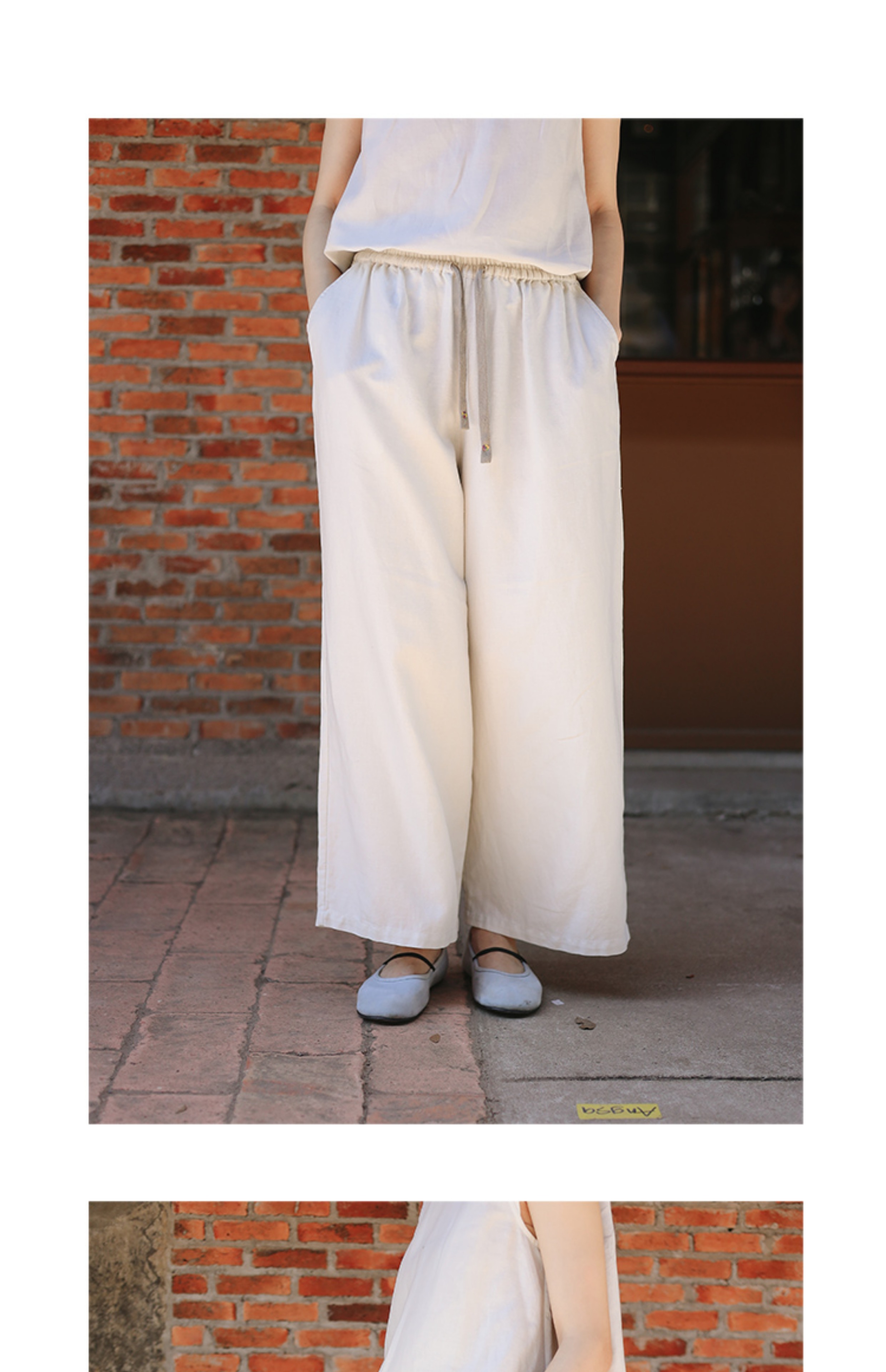 绽放旅行女装083朵/亚麻棉宽松直筒撞色系带松紧腰吸湿透气长裤