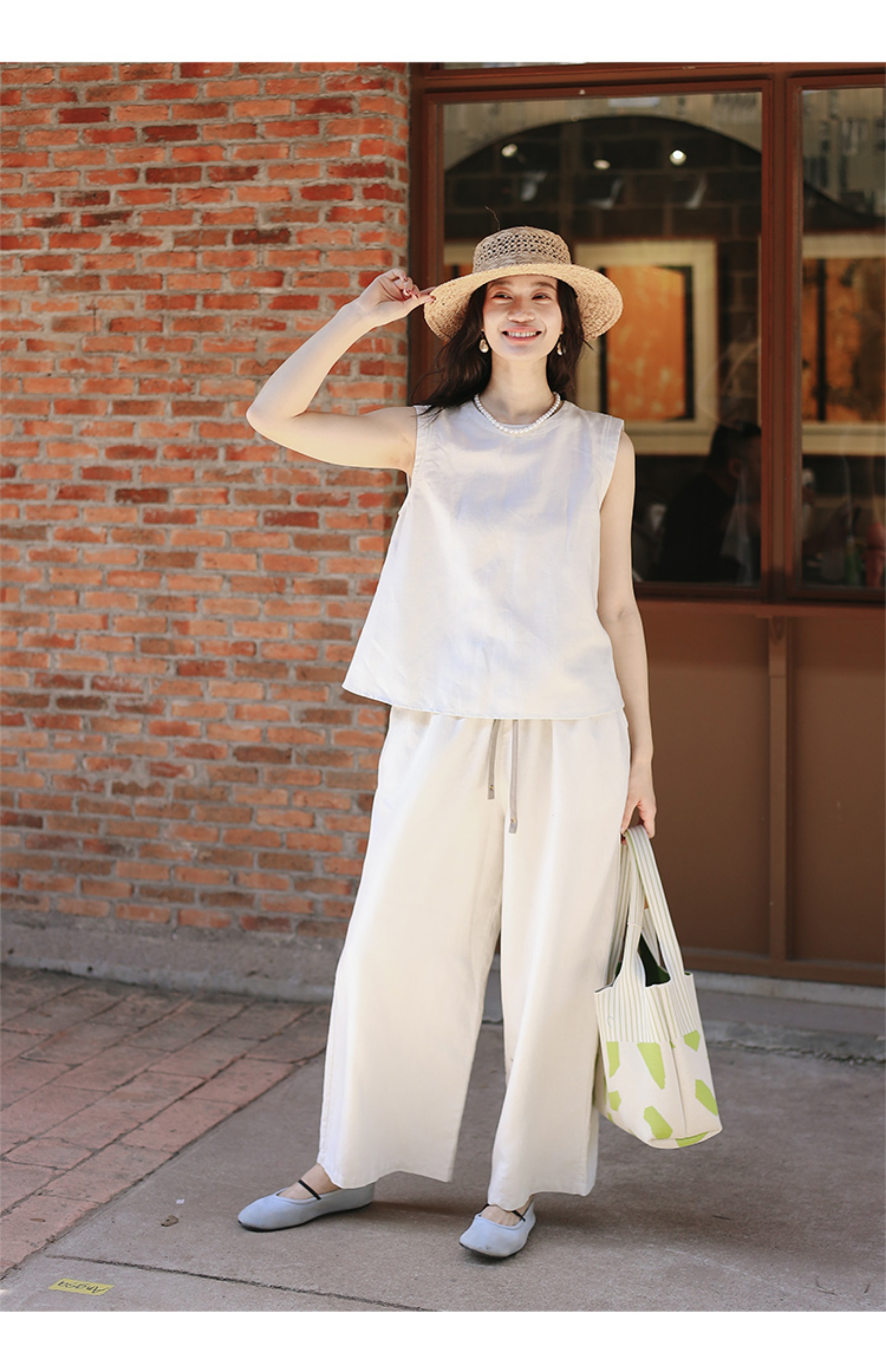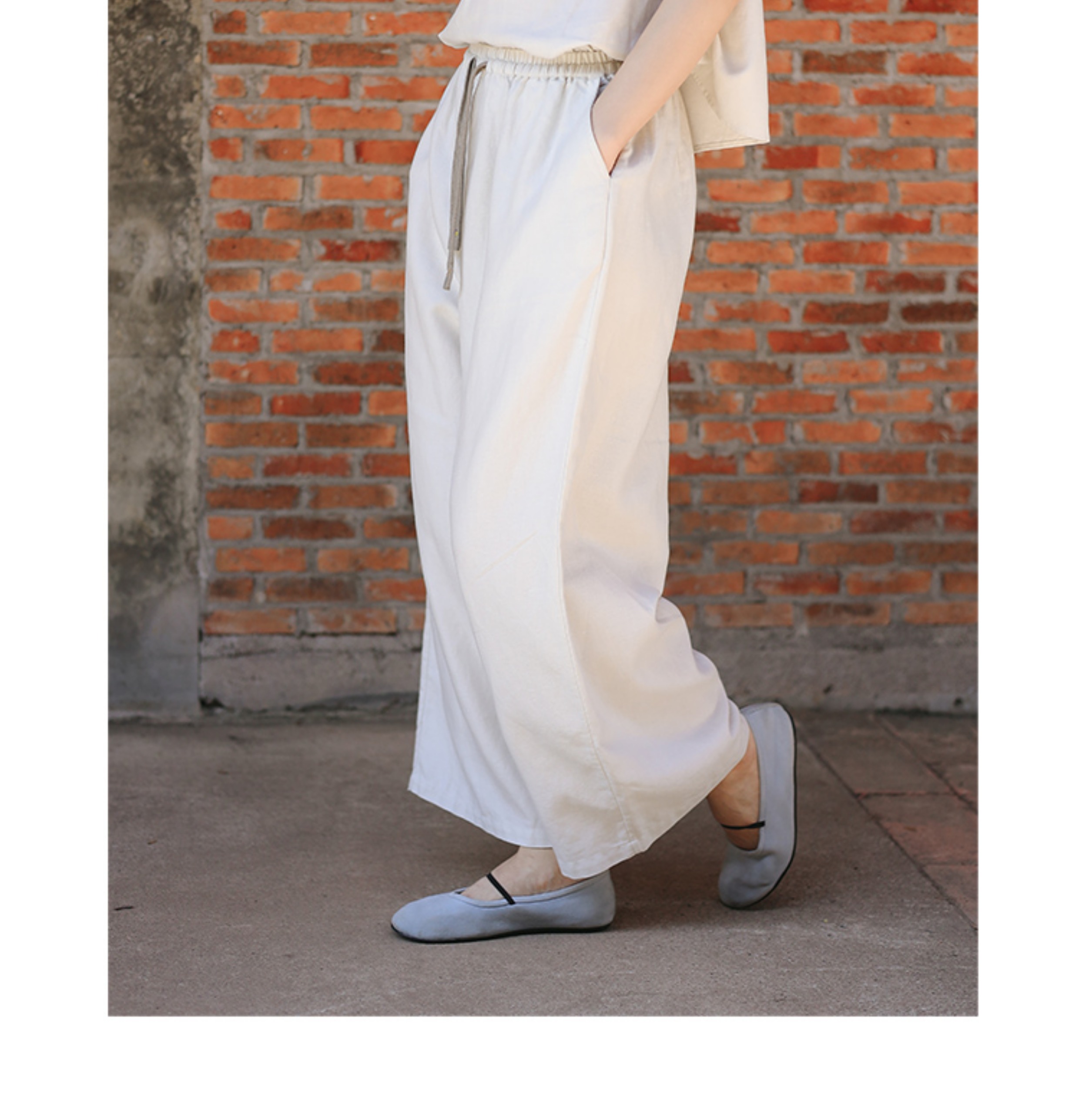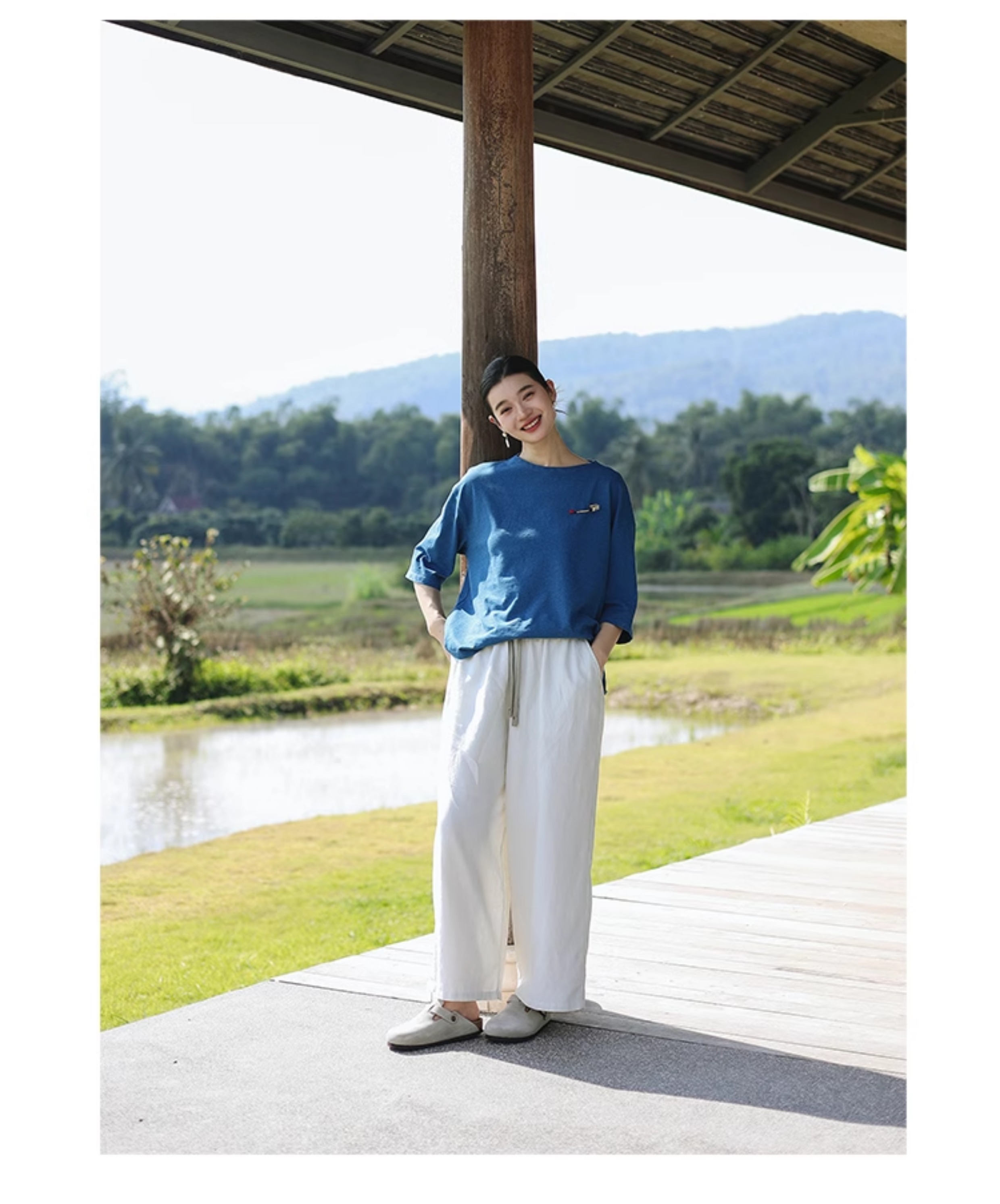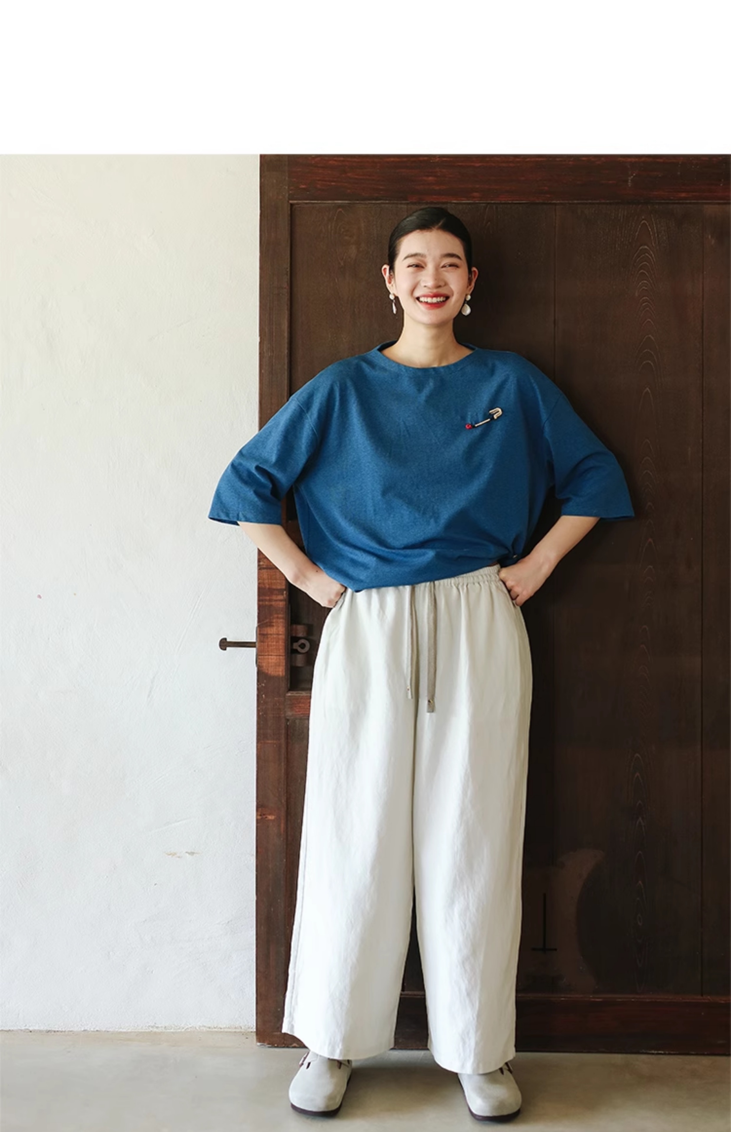 绽放旅行女装083朵/亚麻棉宽松直筒撞色系带松紧腰吸湿透气长裤