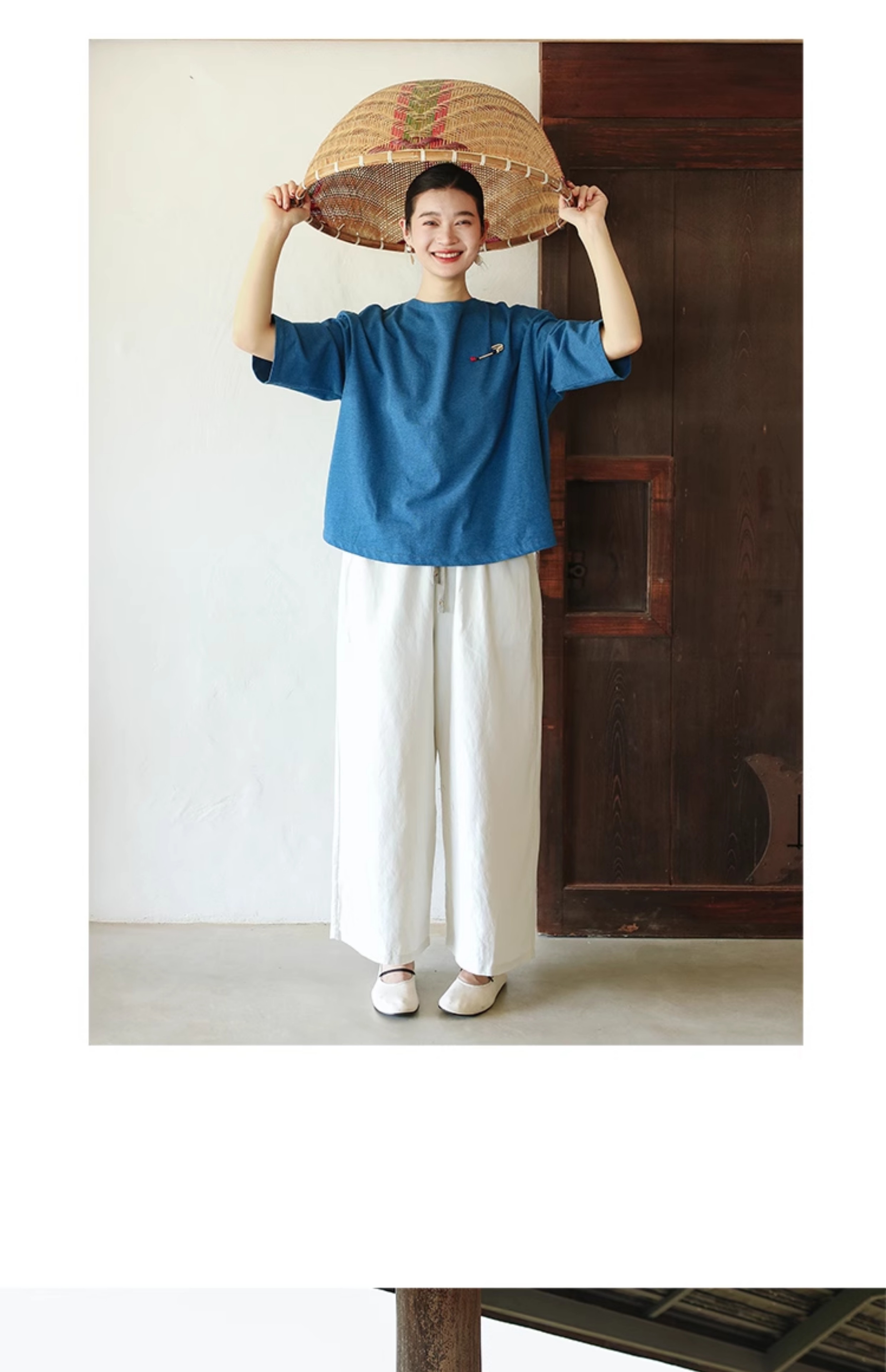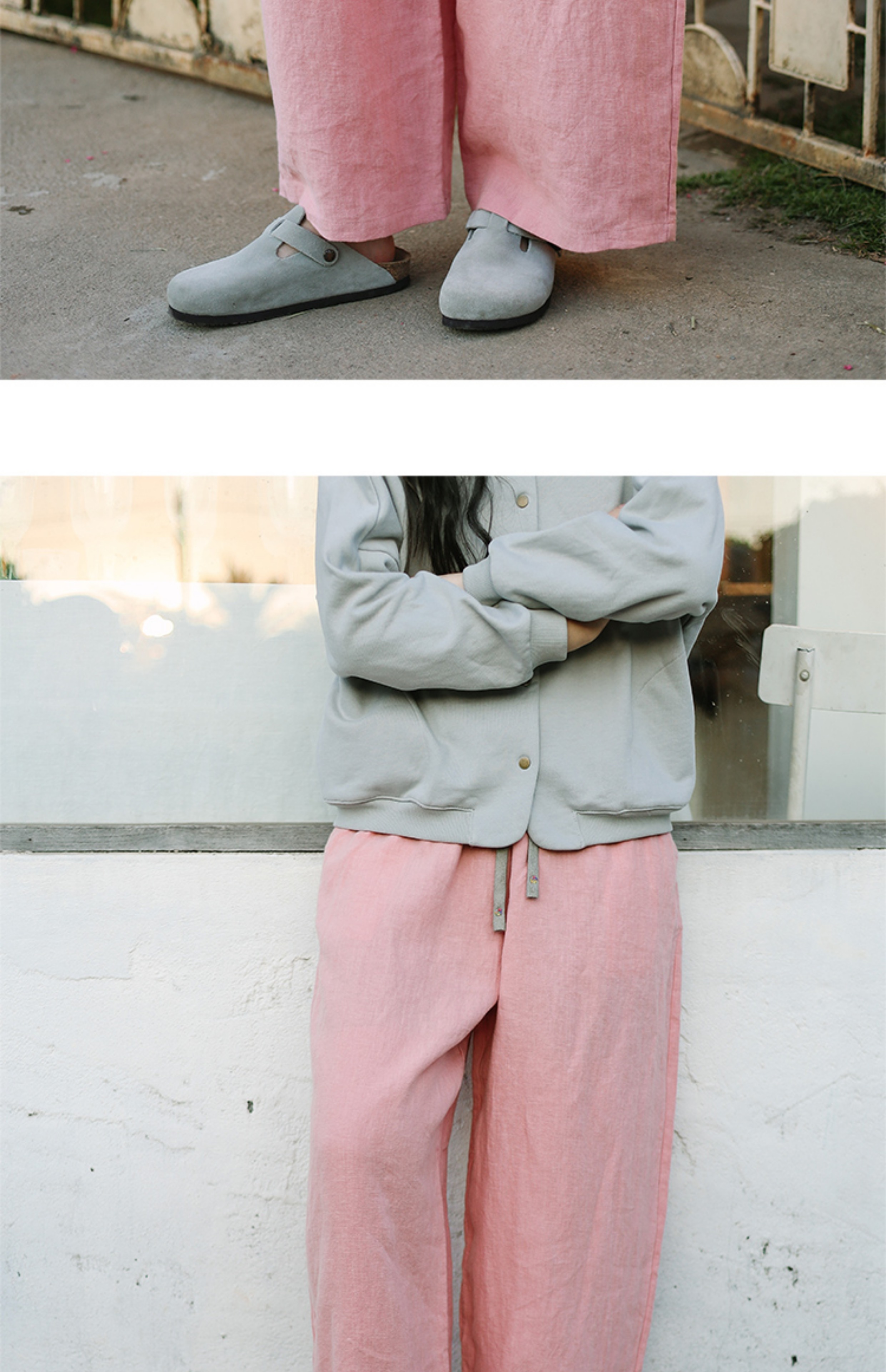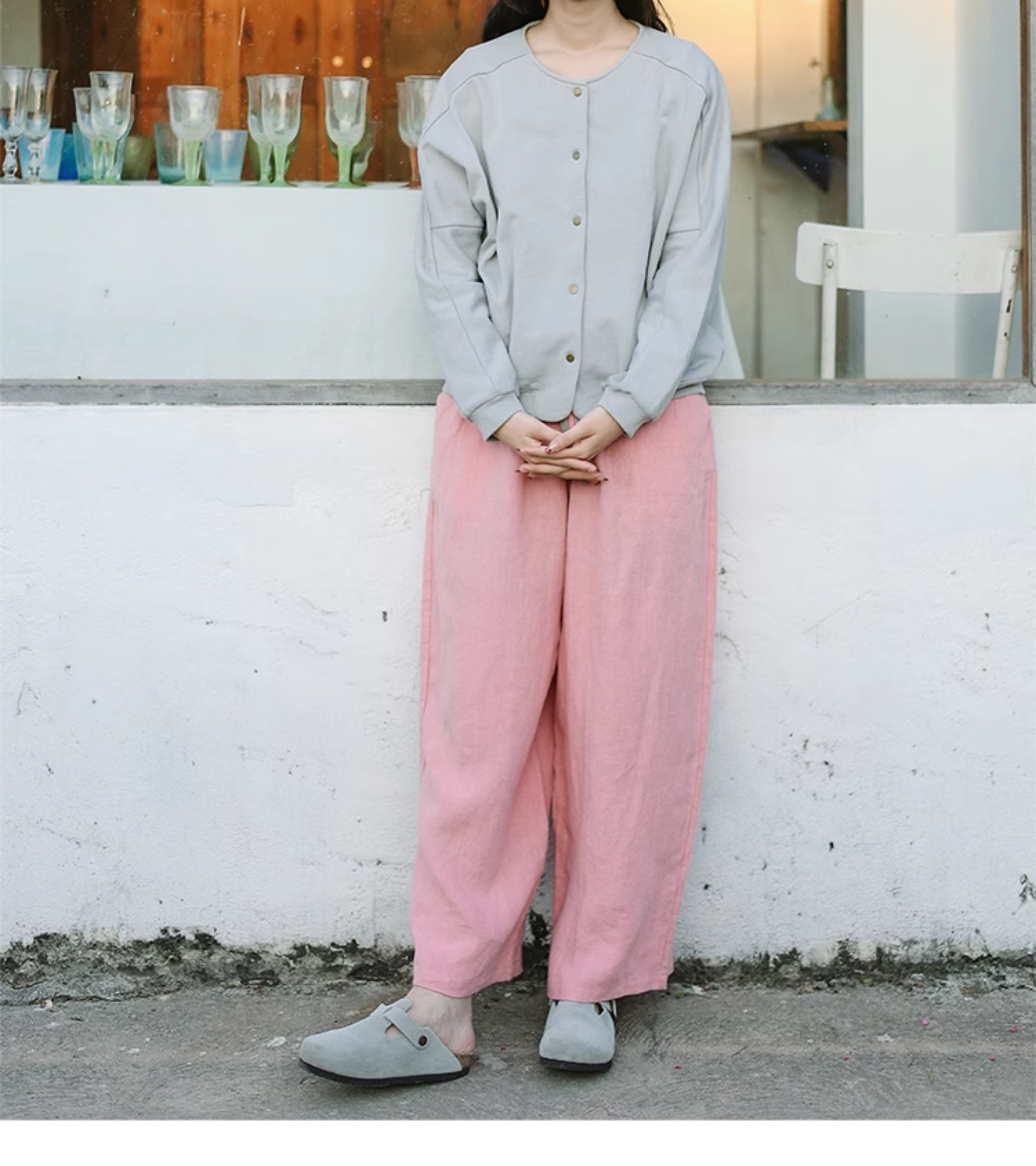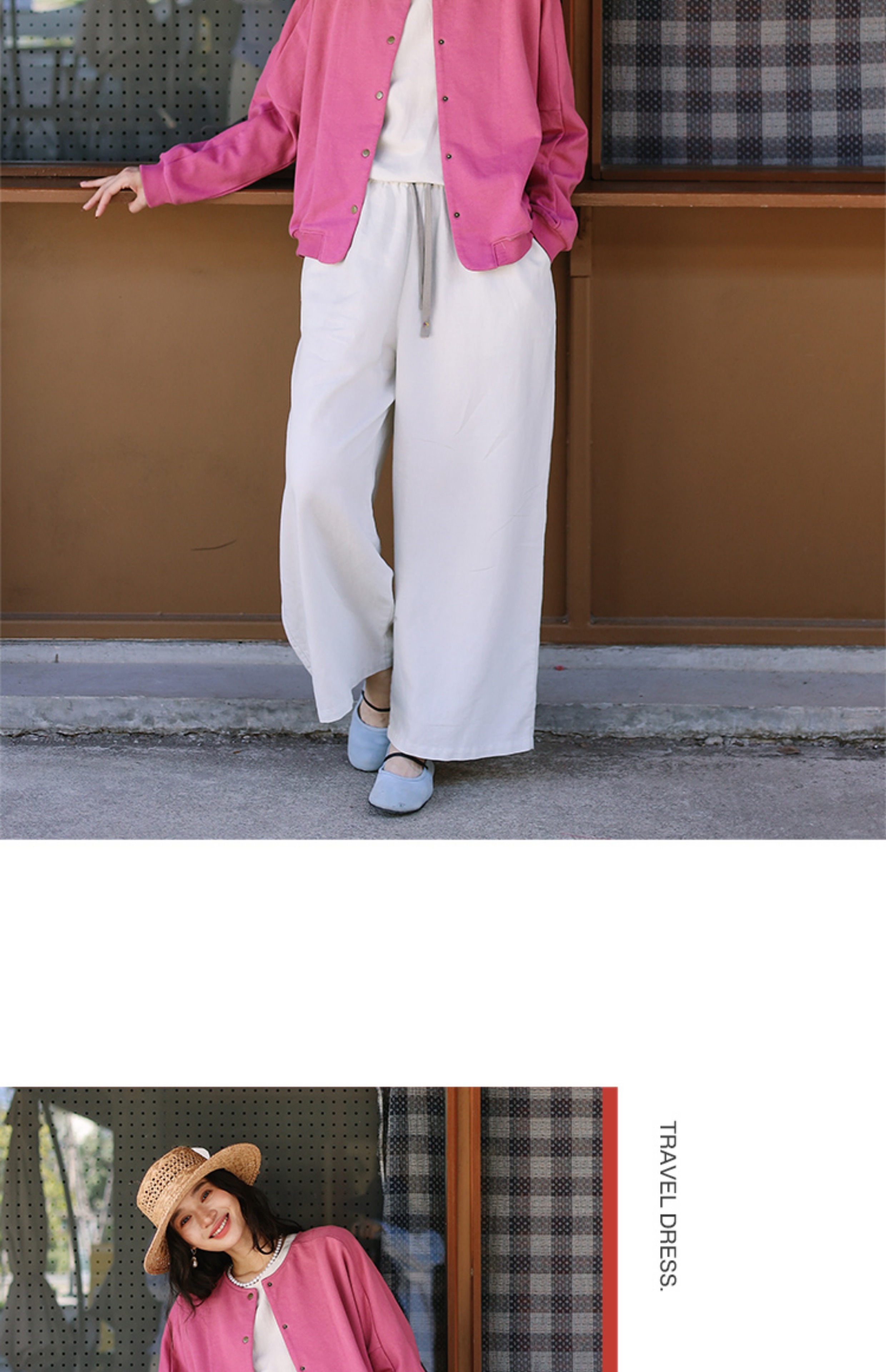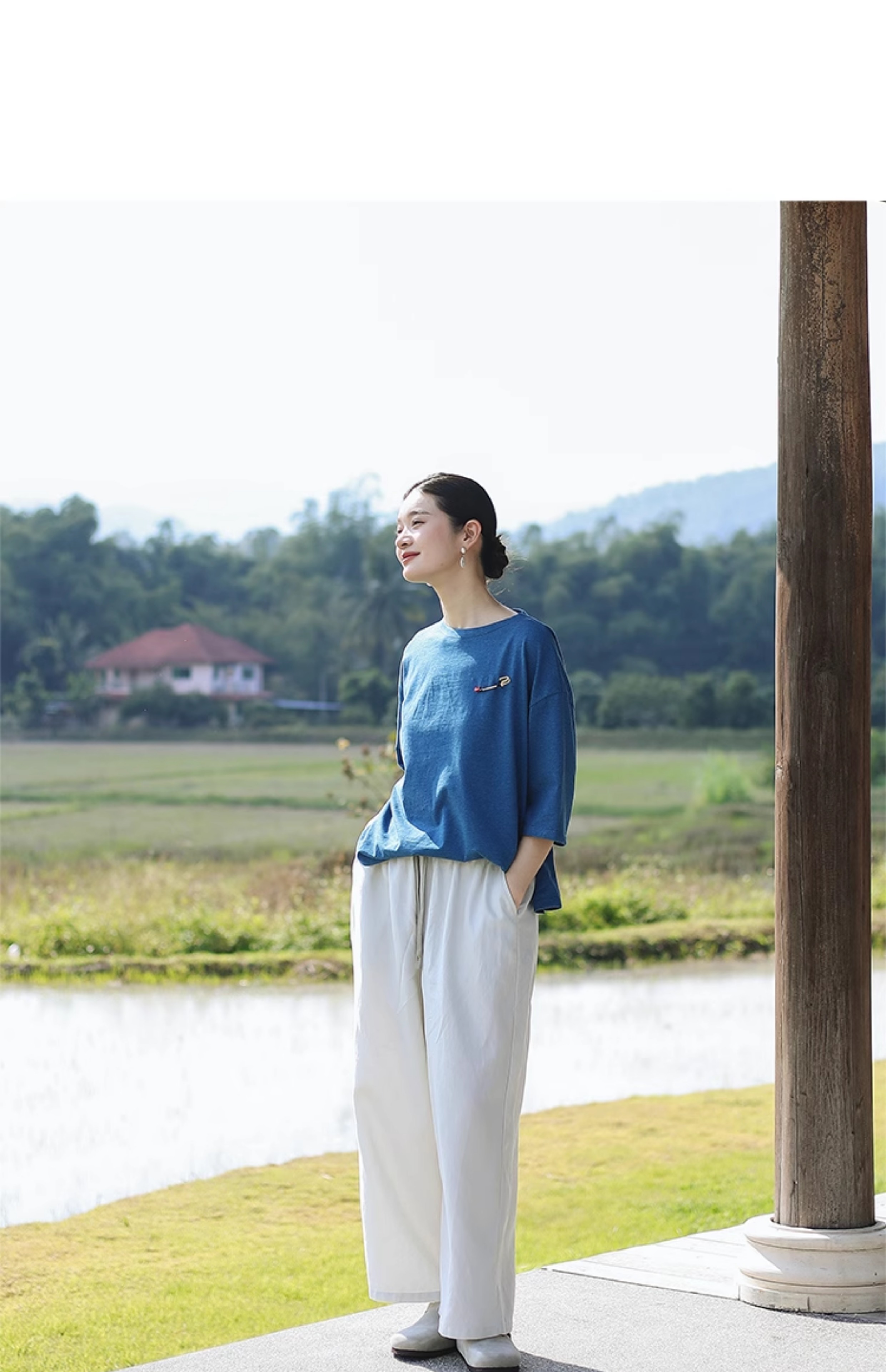 绽放旅行女装083朵/亚麻棉宽松直筒撞色系带松紧腰吸湿透气长裤