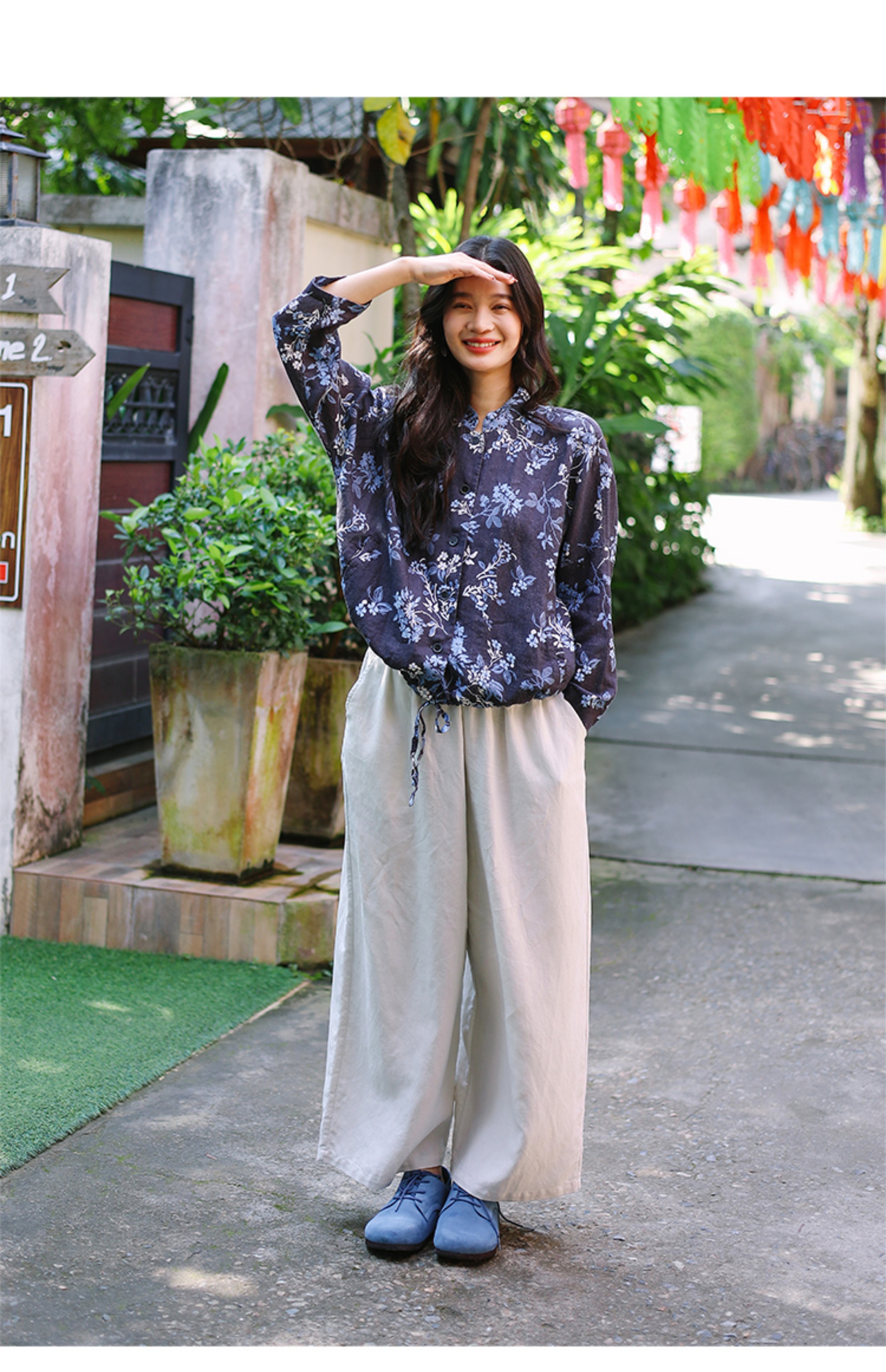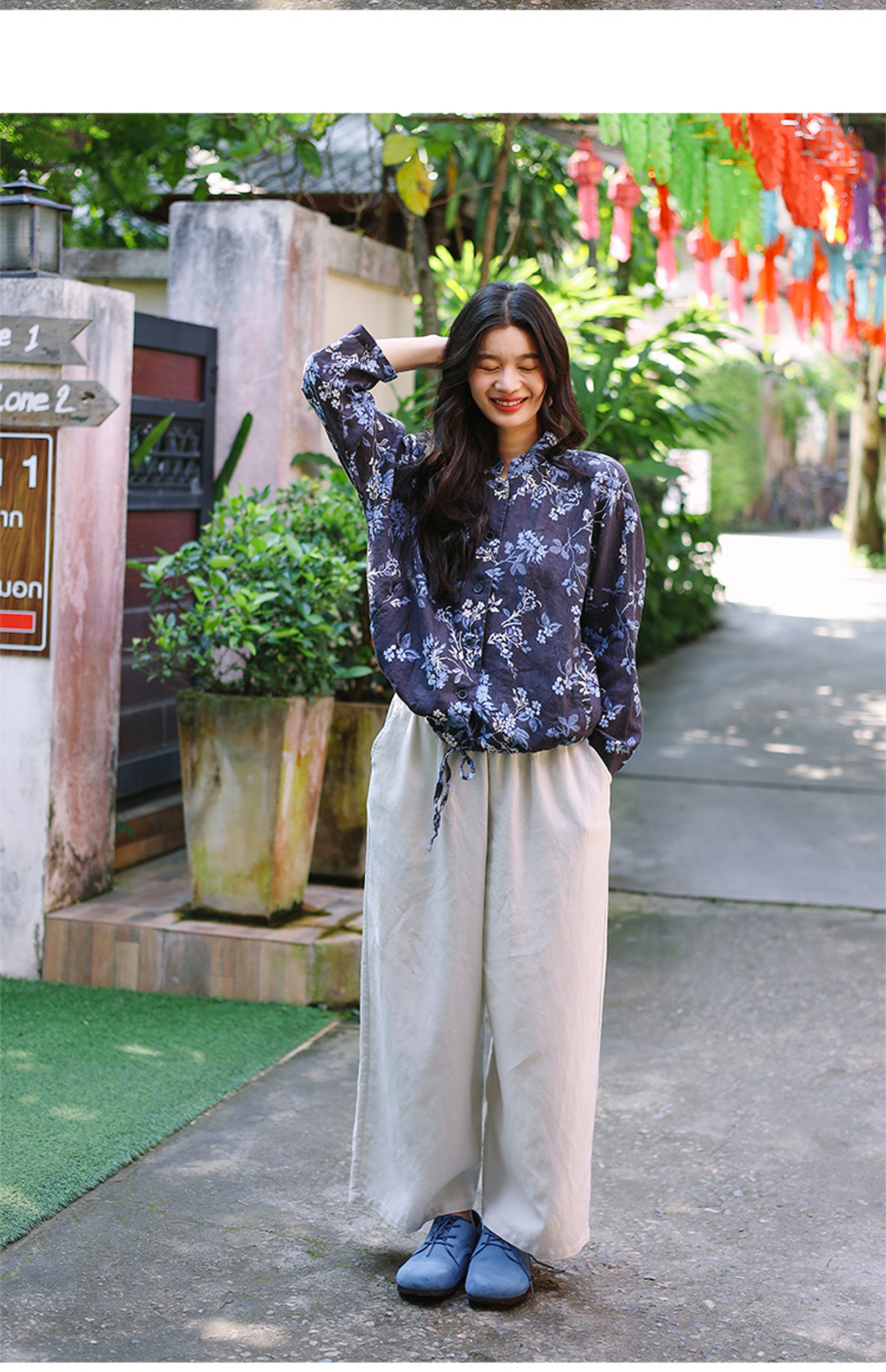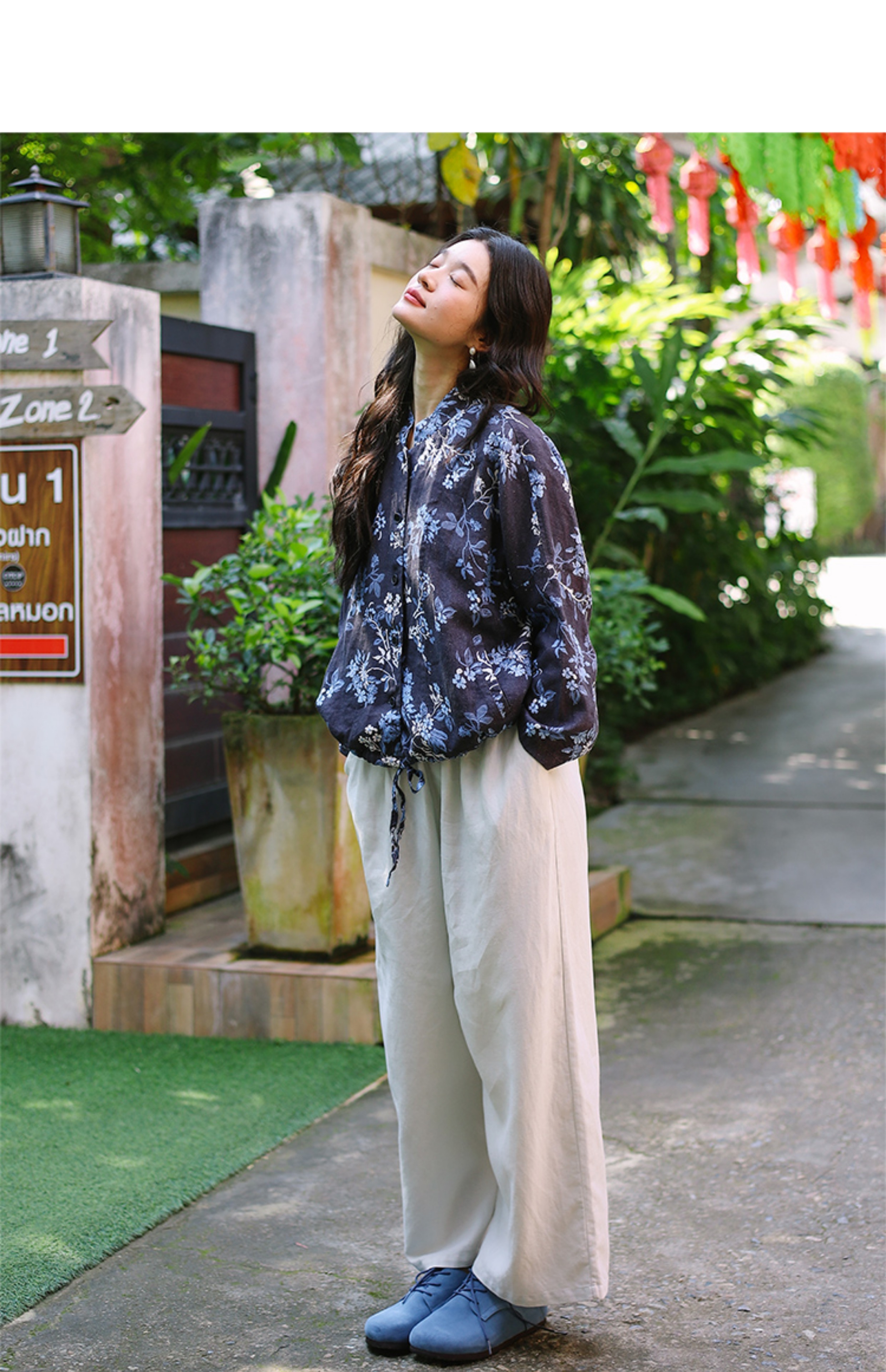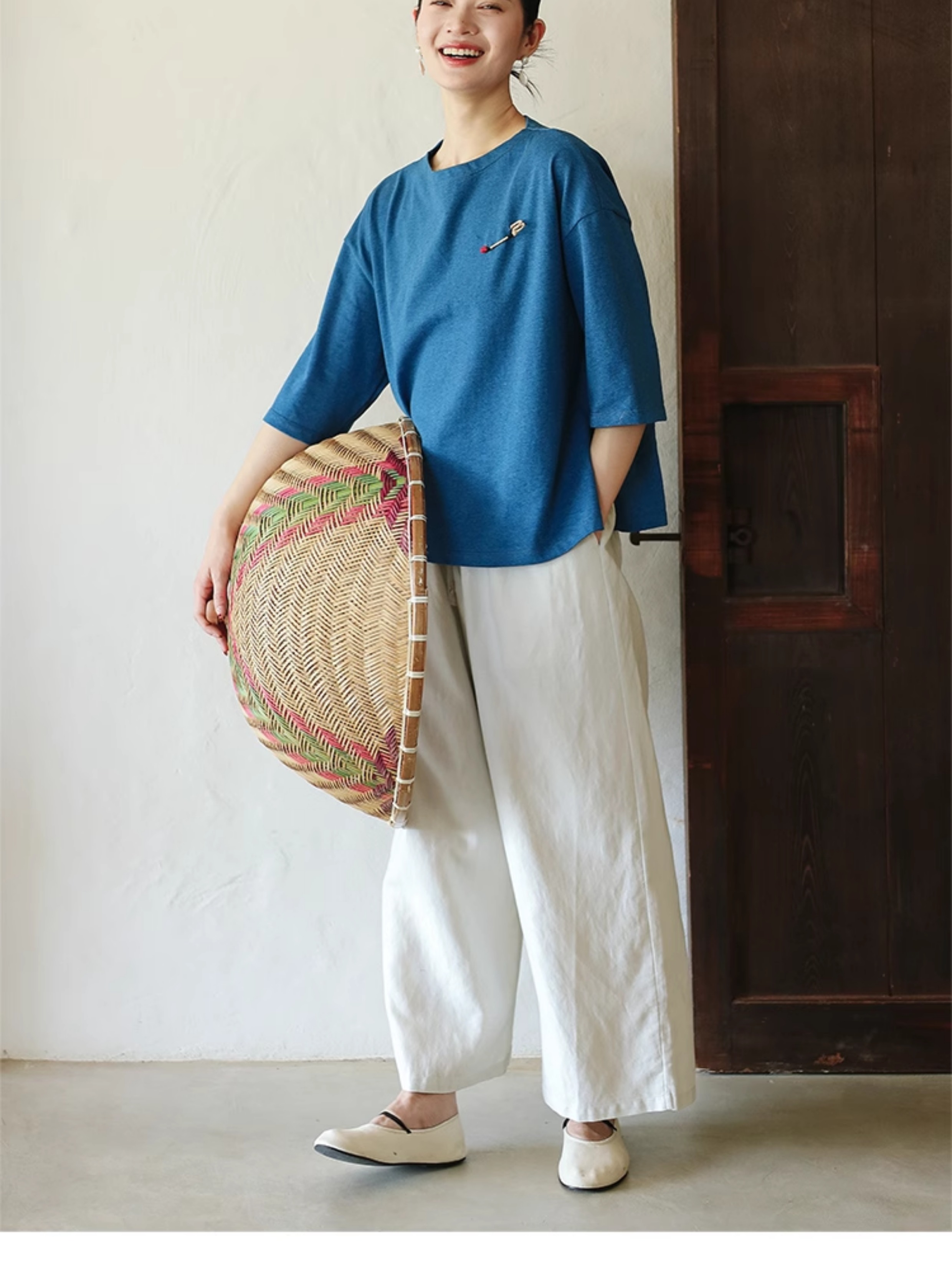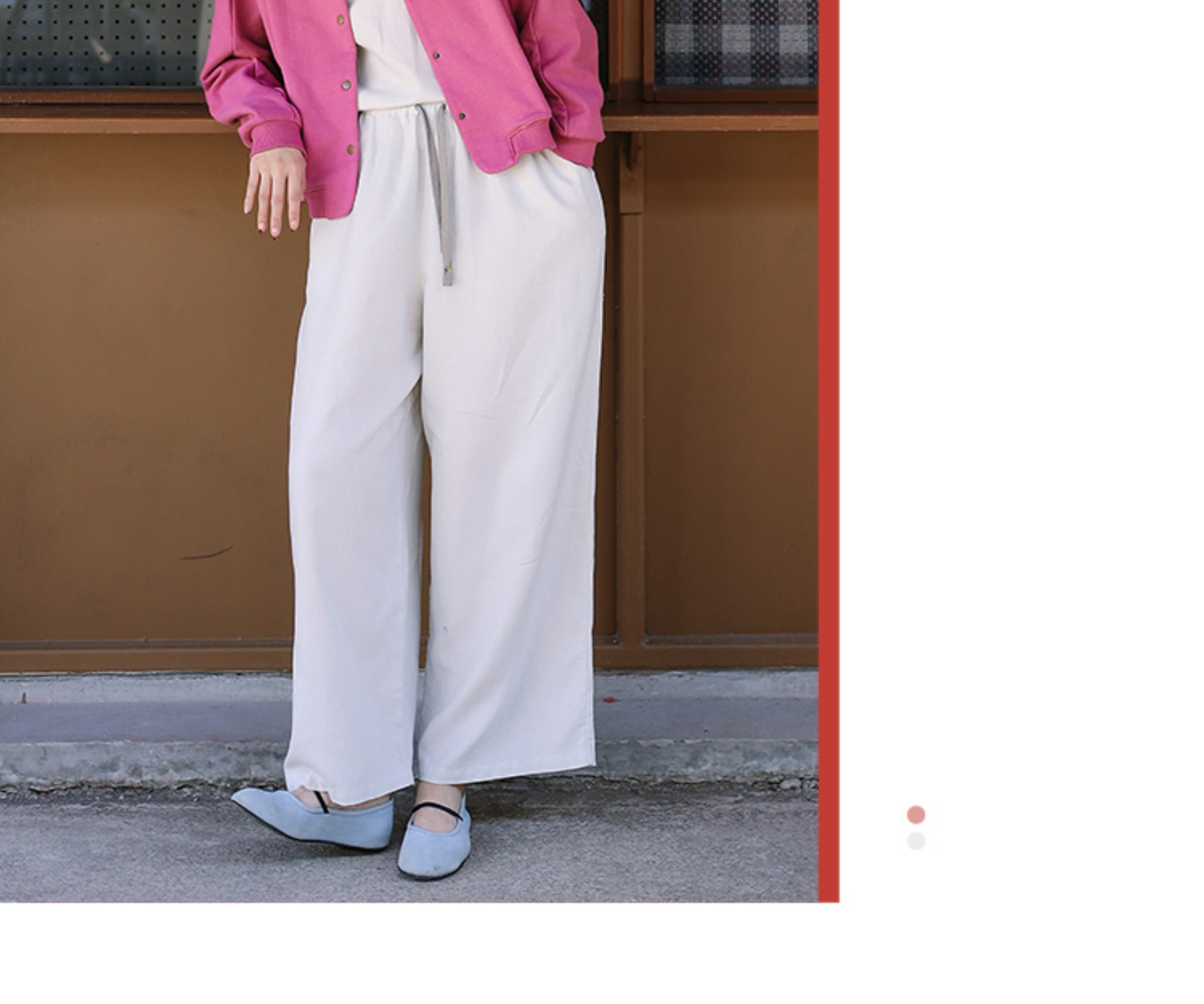 绽放旅行女装083朵/亚麻棉宽松直筒撞色系带松紧腰吸湿透气长裤