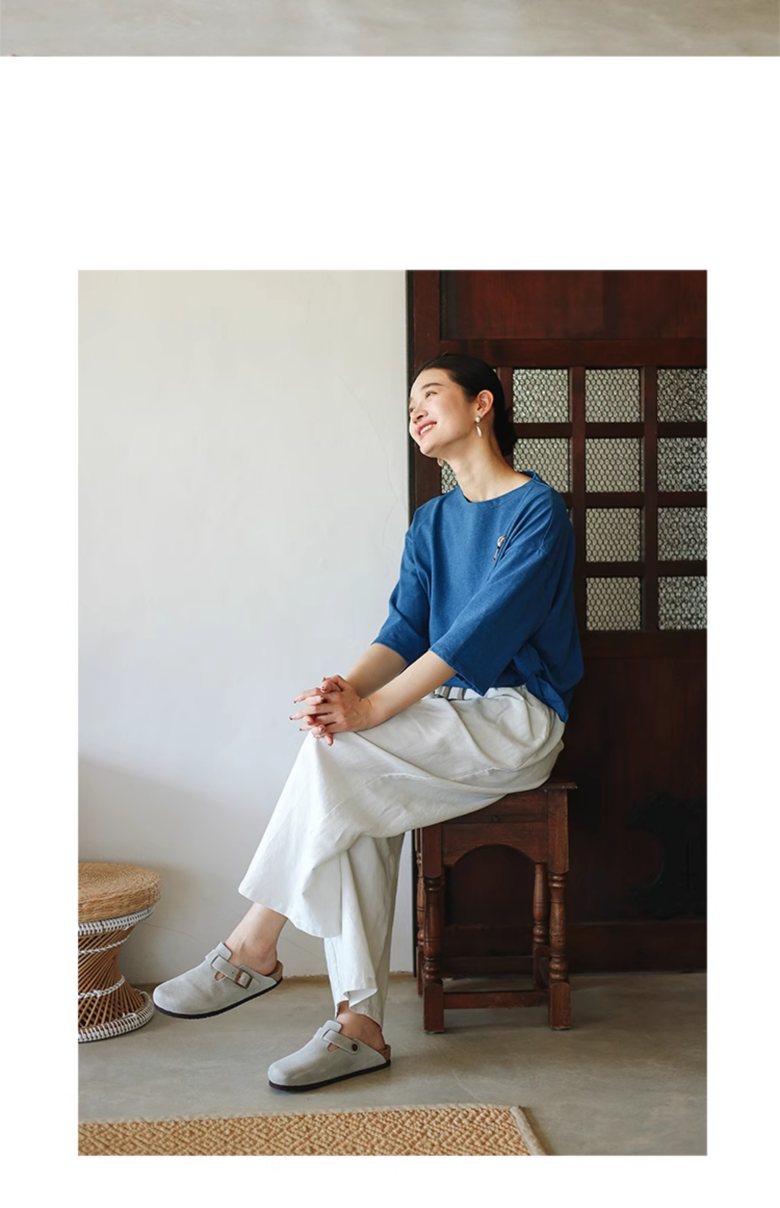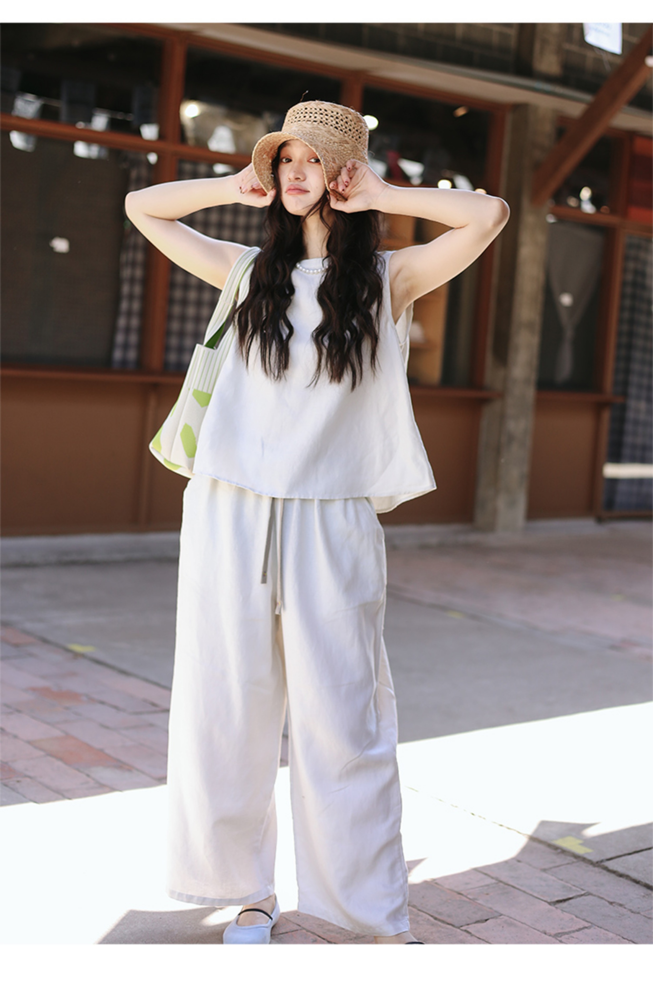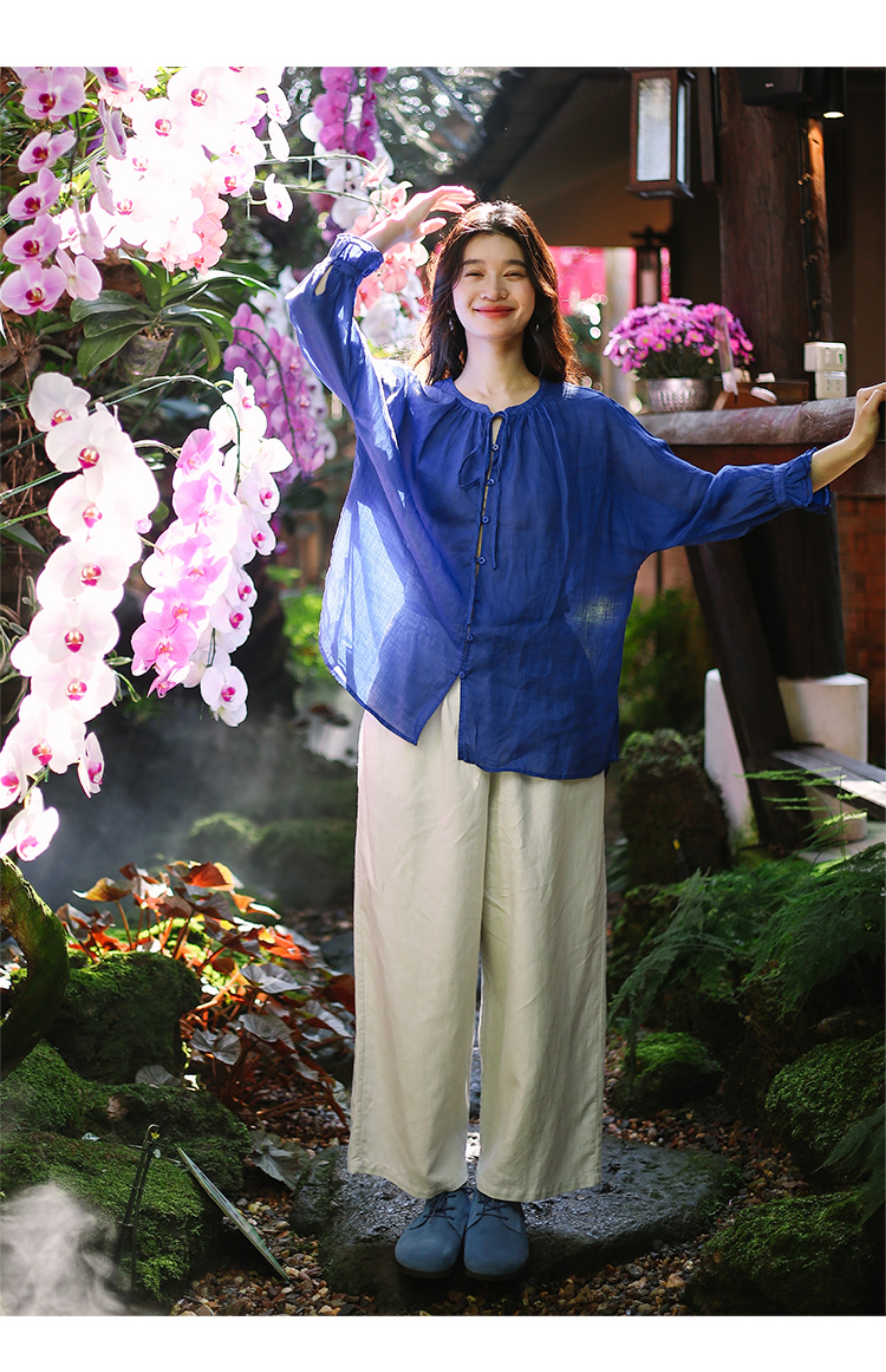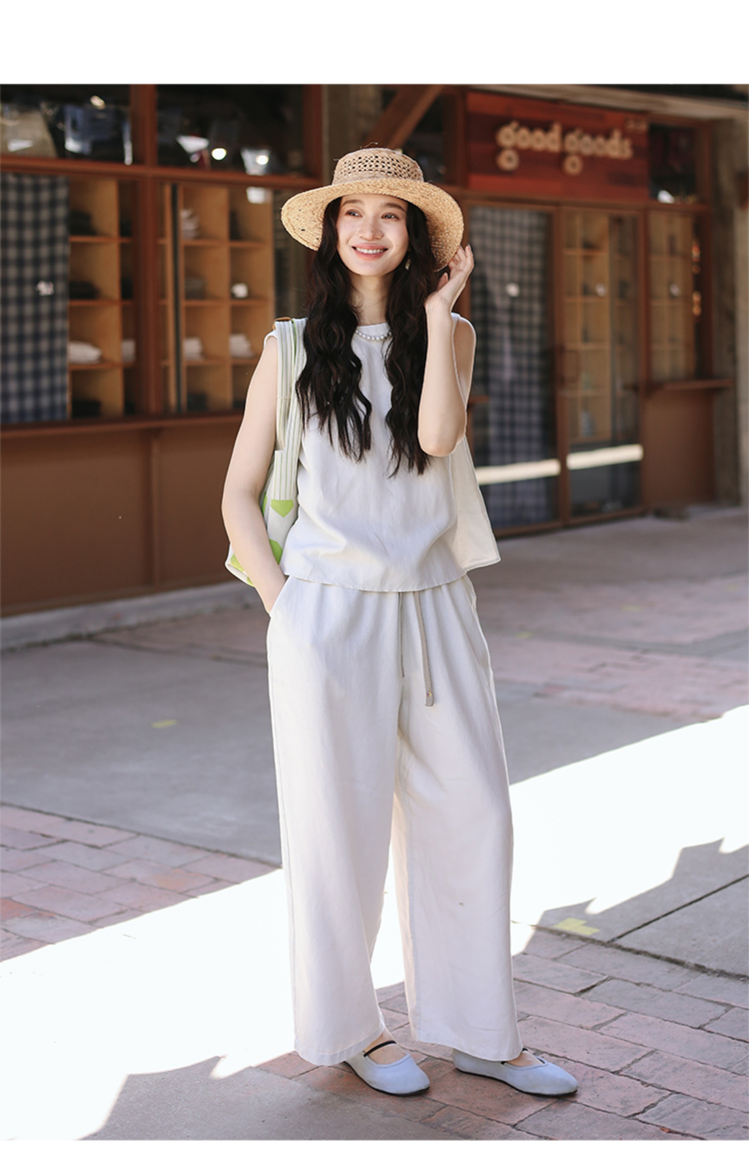 绽放旅行女装083朵/亚麻棉宽松直筒撞色系带松紧腰吸湿透气长裤