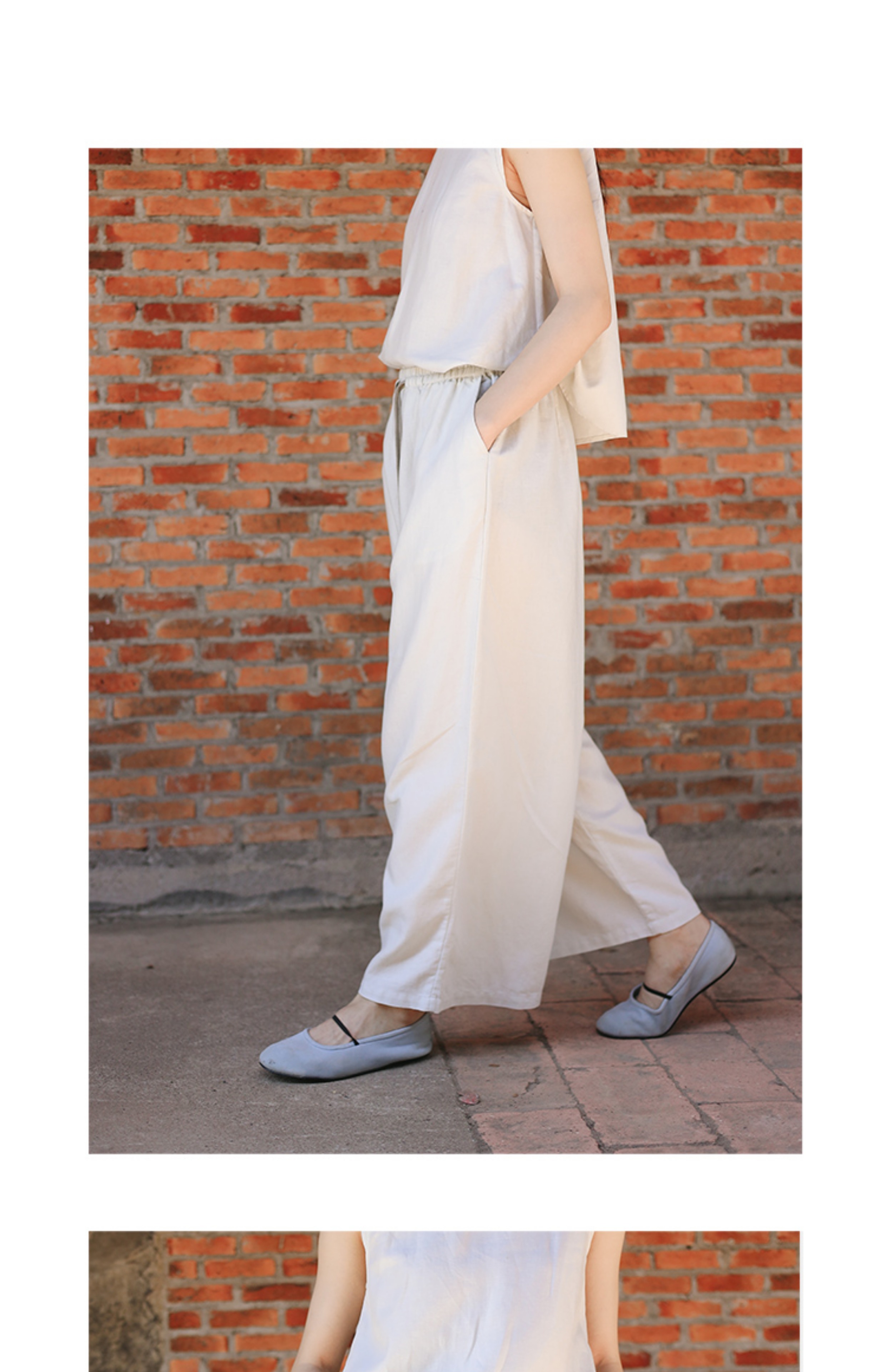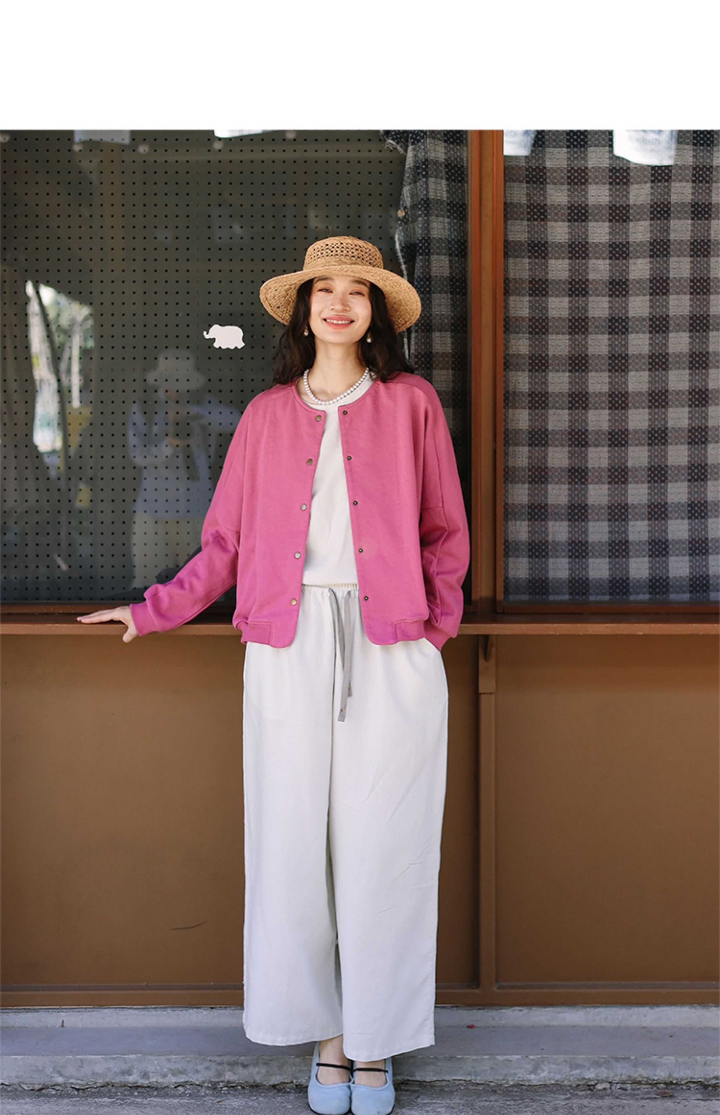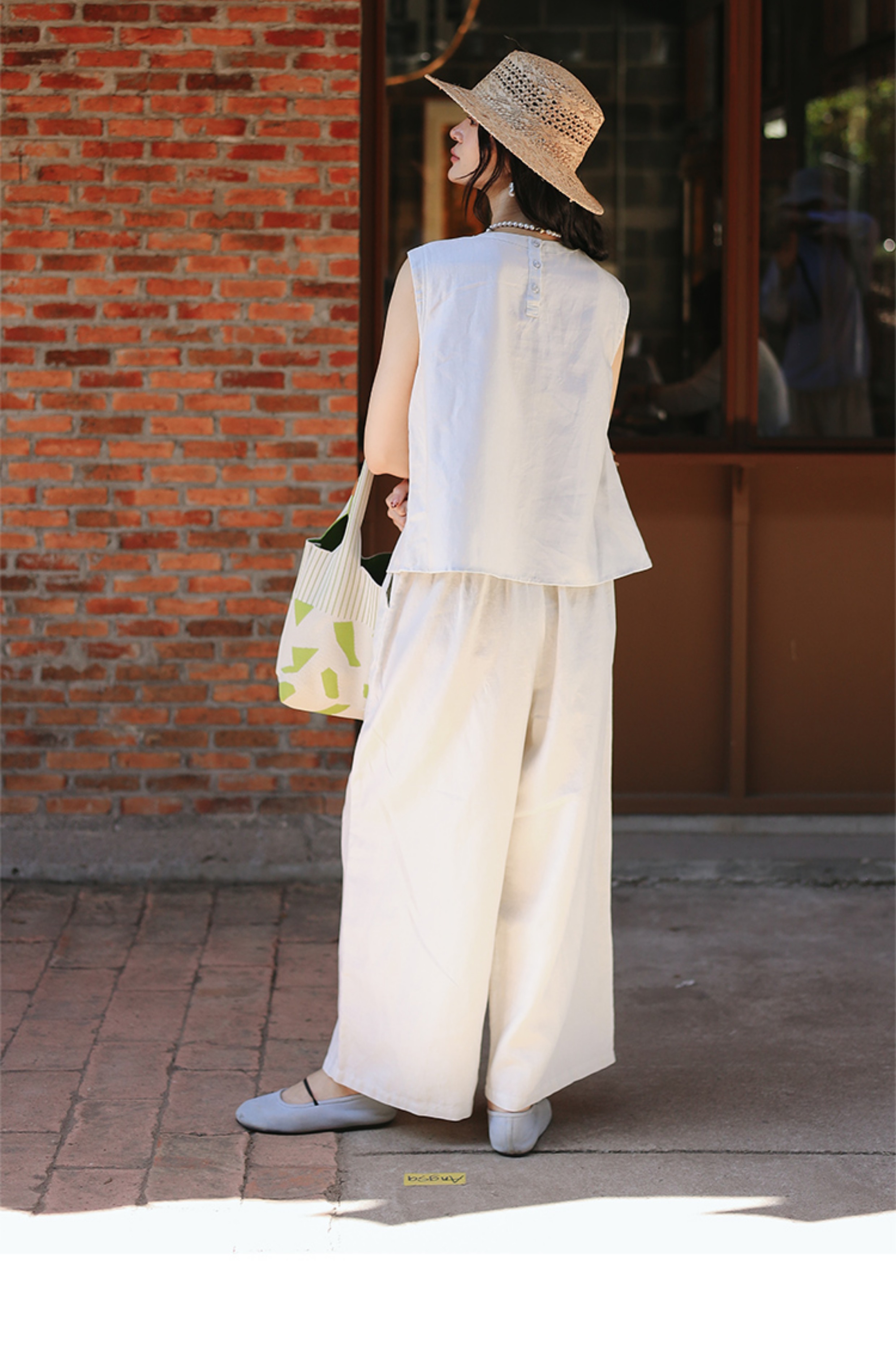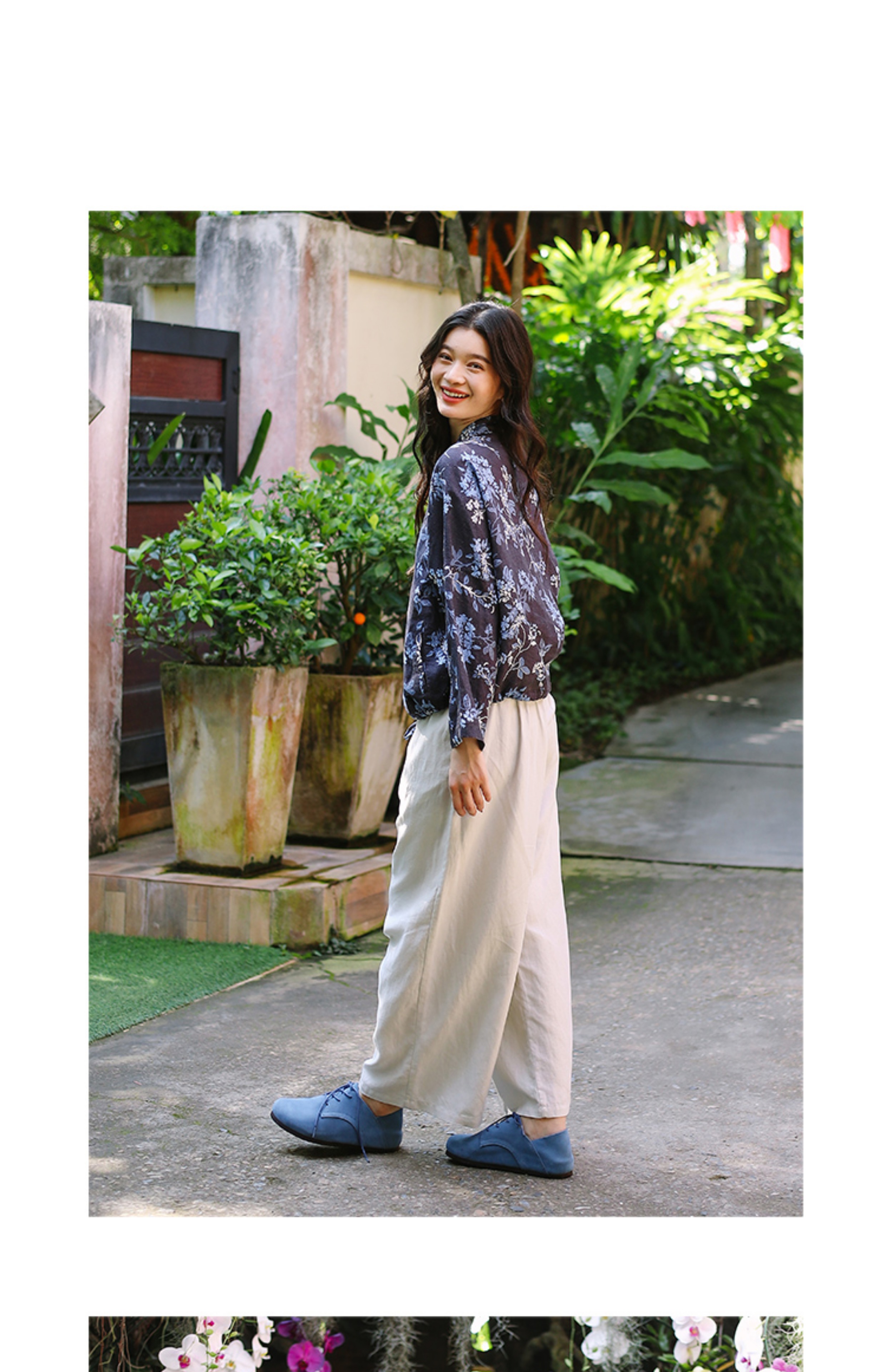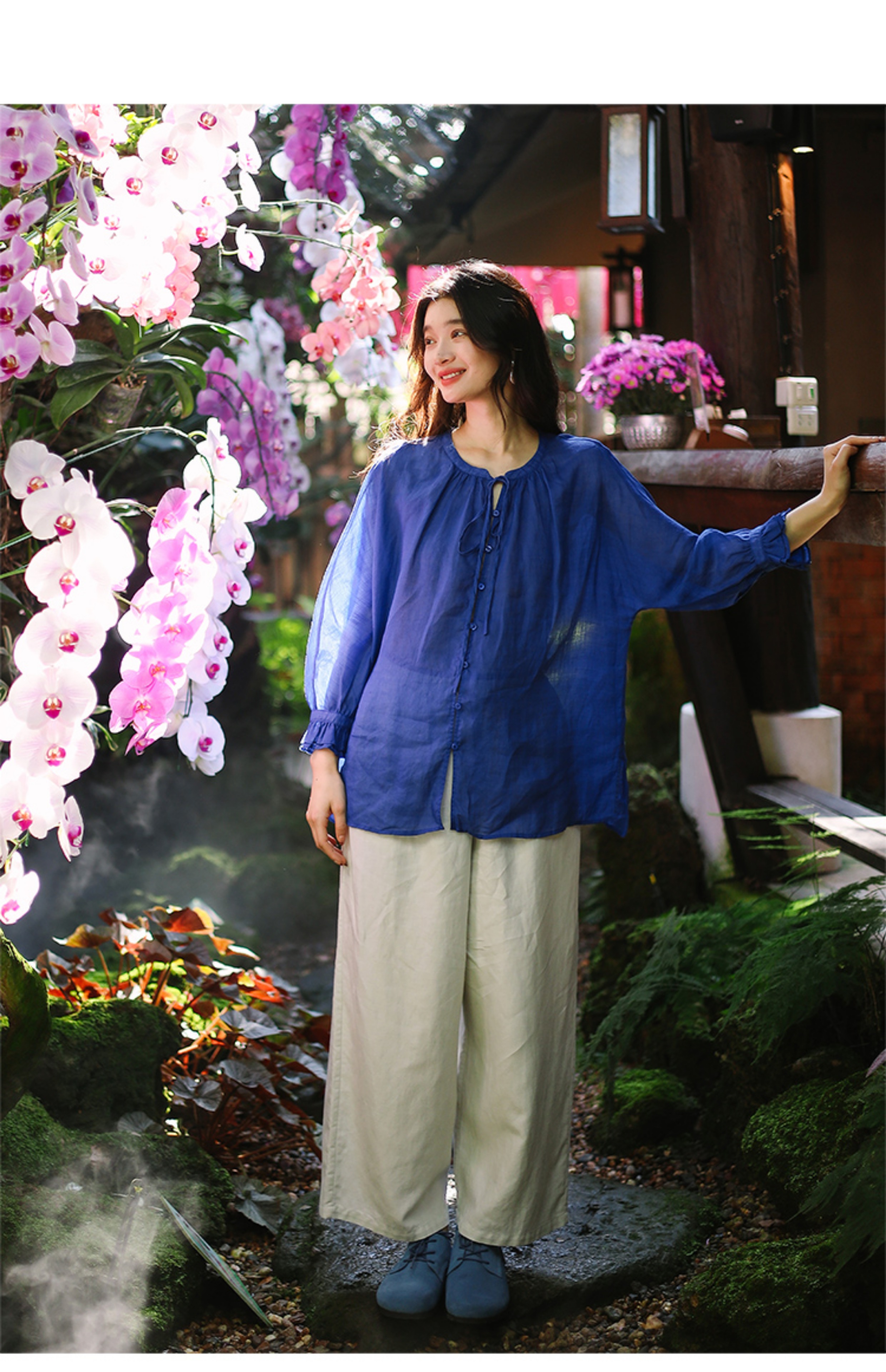 绽放旅行女装083朵/亚麻棉宽松直筒撞色系带松紧腰吸湿透气长裤