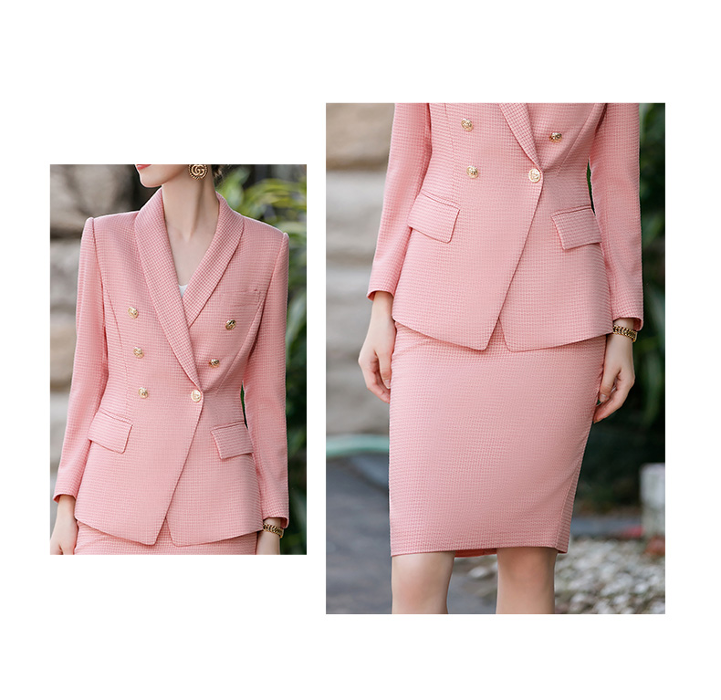 AD2023春季薄款粉色西装套装女小香风两件套半身包臀裙肌理感西服