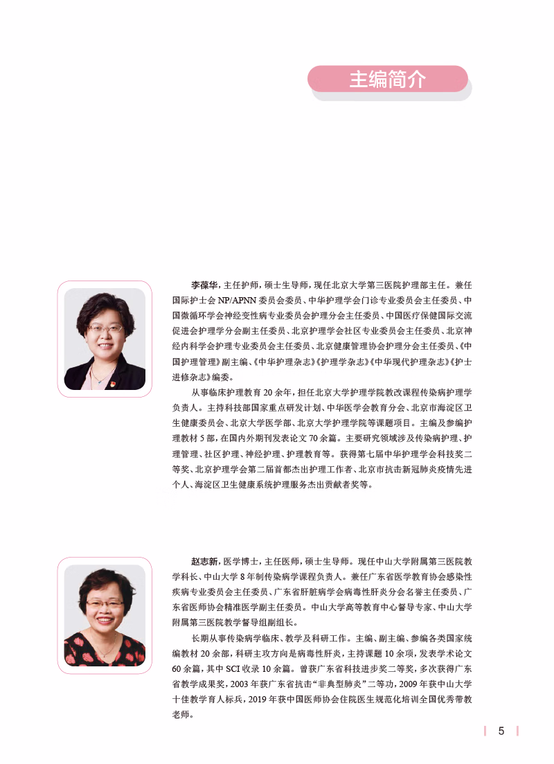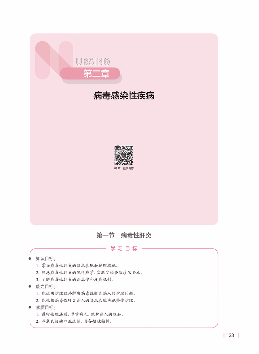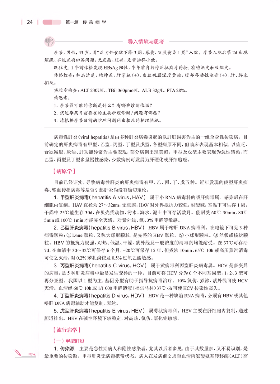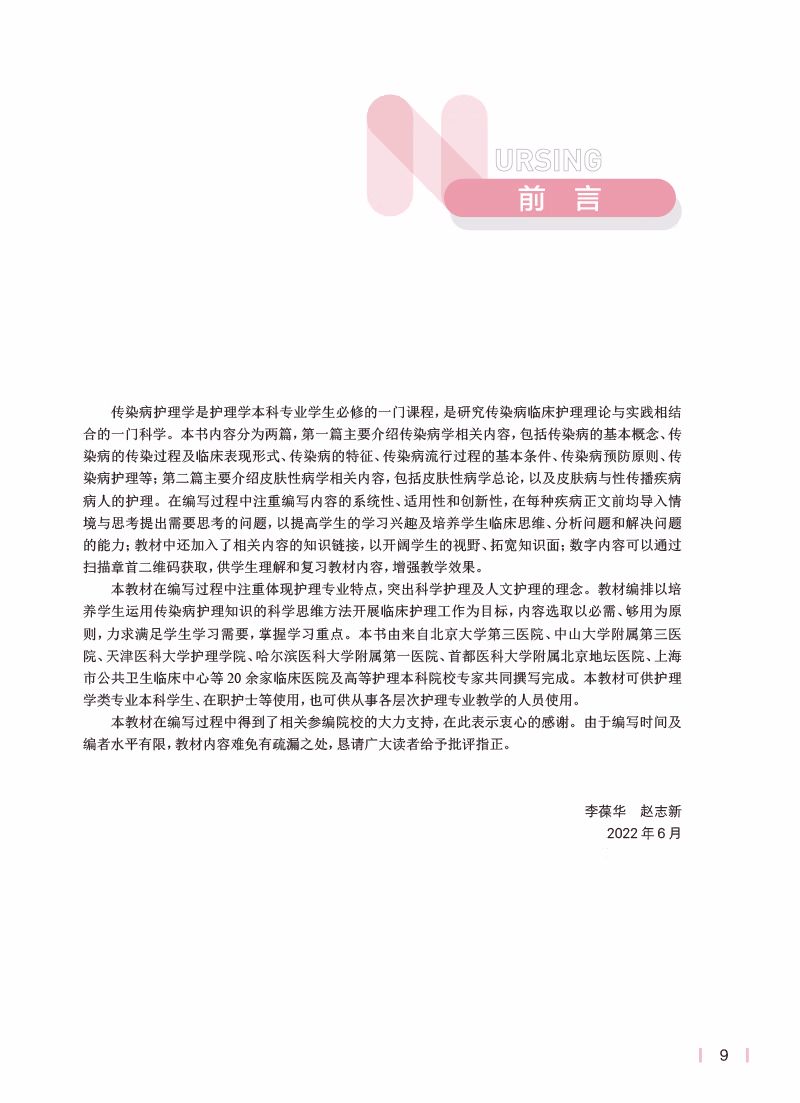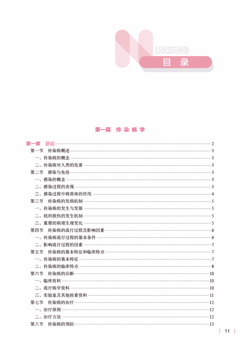 本教材主要介绍了本科生必须掌握的传染病的基本概念及传染病护理学基本理论、基本知识与基本技能。如传染病流行的必备条件;传染病特征;法定传染病分类及报告时间;传染病的消毒及隔离措施;病毒性肝炎、艾滋病、麻疹、水痘、流行性腮腺炎、流行性感冒、新型冠状病毒肺炎、流行性乙型脑炎、狂犬病、结核病、伤寒、细菌性痢疾、流行性脑脊髓膜炎、猩红热等的护理评估、主要护理问题及给予的相应护理措施等。目的是培养学生在未来的工作中,能够应用传染病知识思考、分析和解决临床面临的实际问题,培养本科生自主学习和独立分析和解决问题能力。
