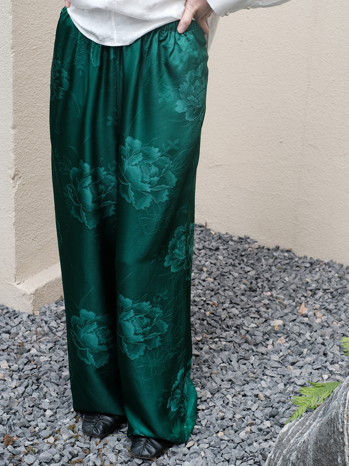 盛唐婧 |真丝缎牡丹花直筒阔腿裤
