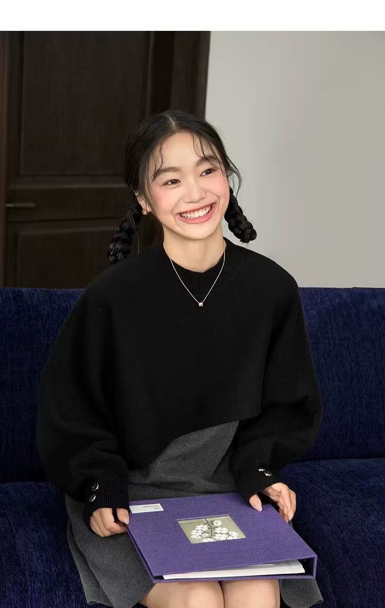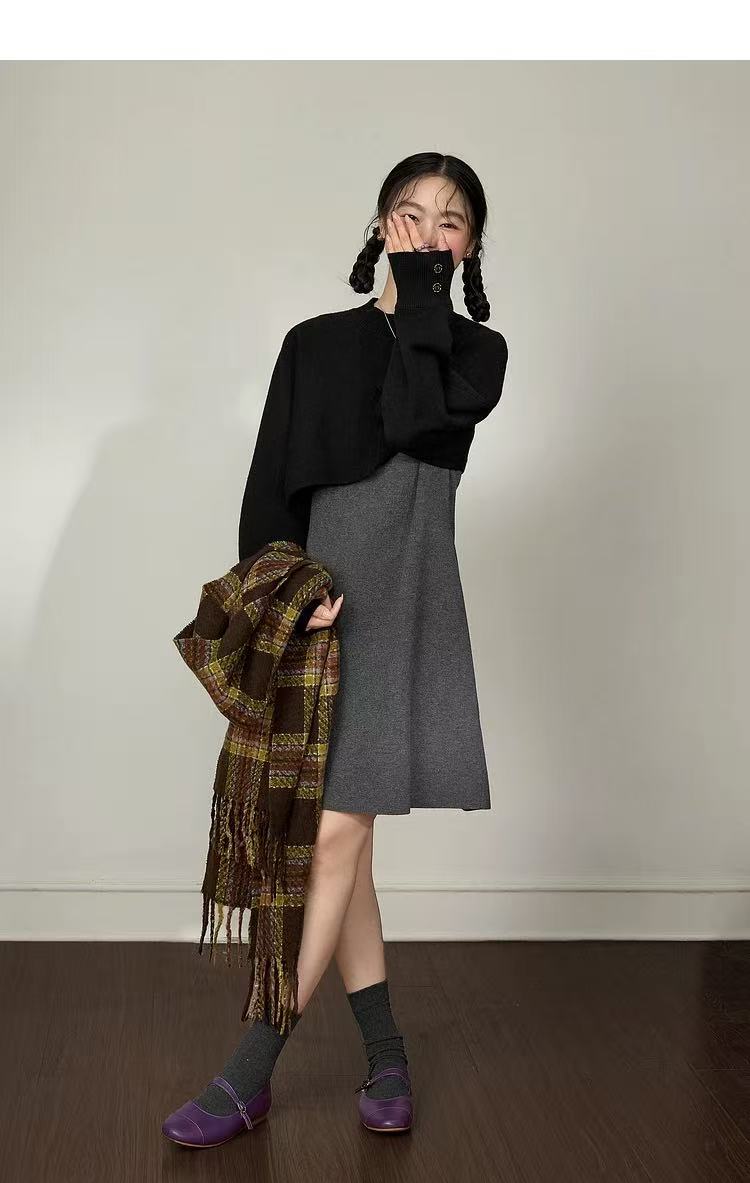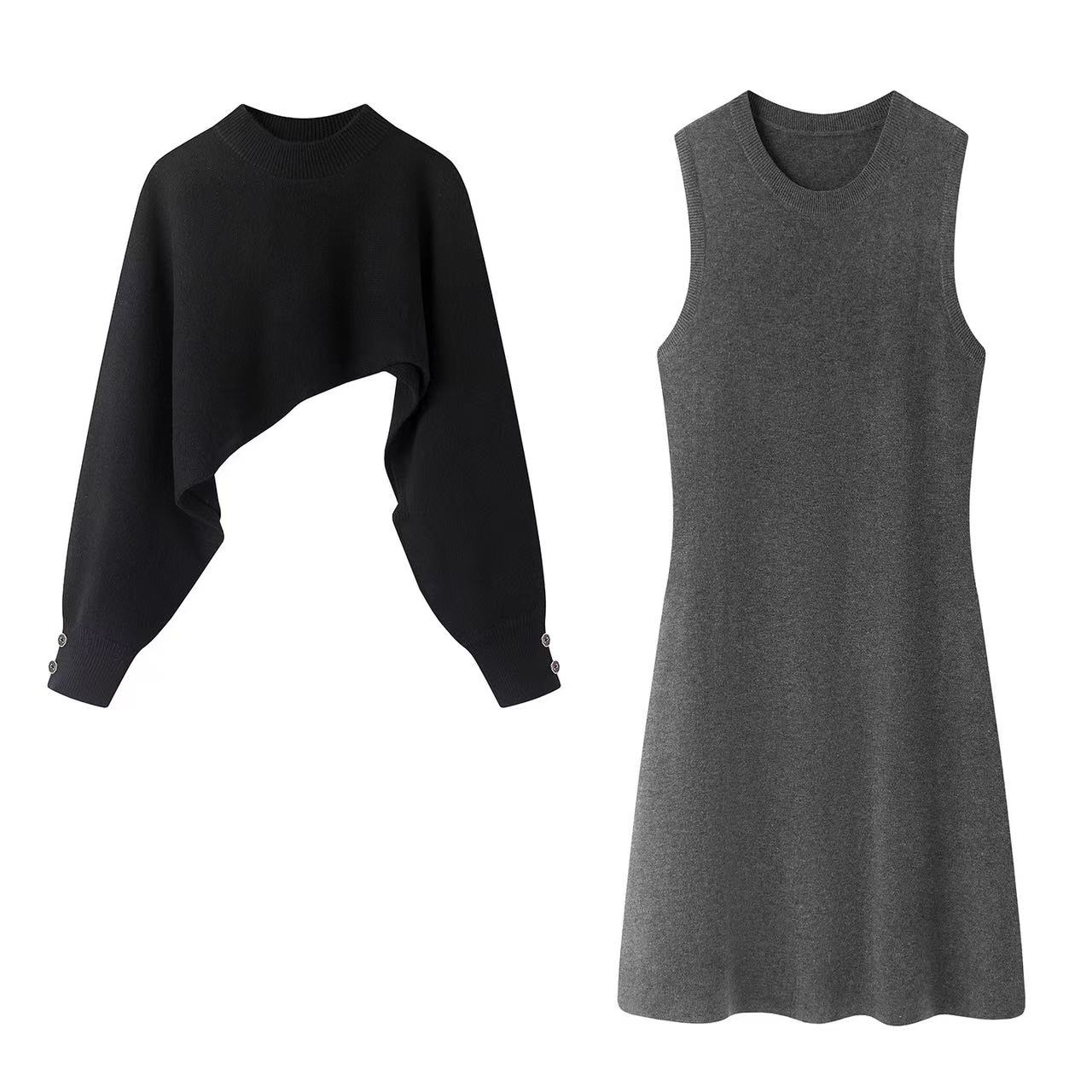 灰色不规则收腰显瘦连衣裙女25秋冬新款针织披肩毛衣两件套装(上衣)