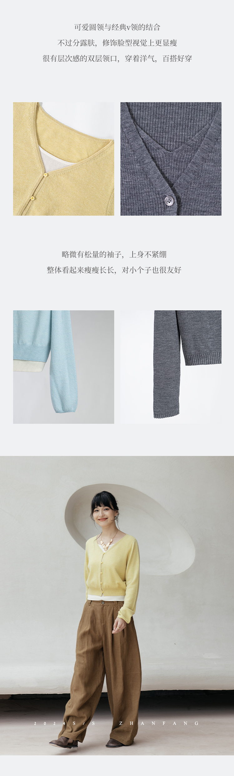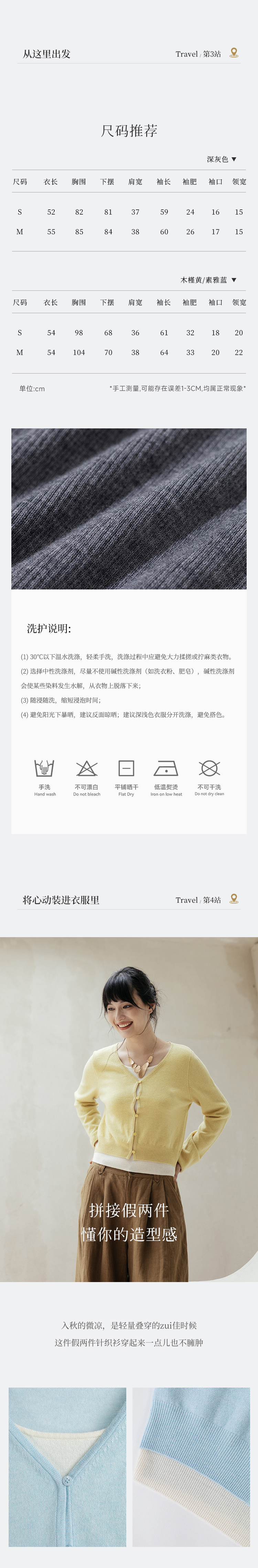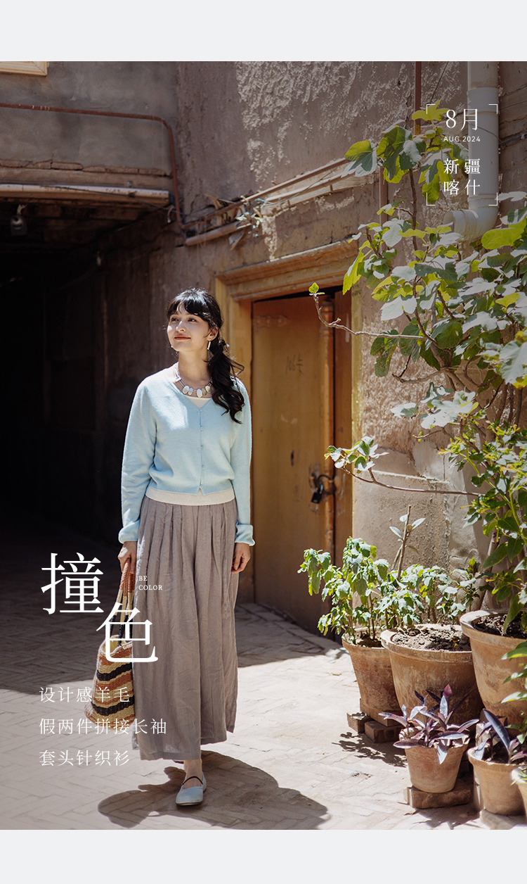 绽放旅行女装599朵/早秋假两件拼接V领套头宽松长袖羊毛针织开衫