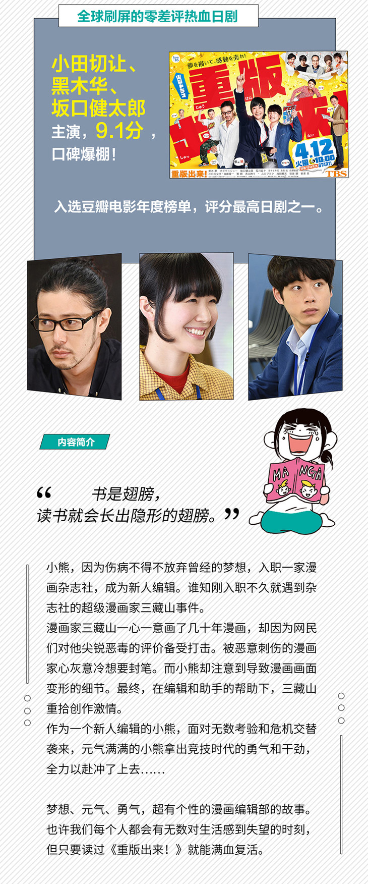 梦想、元气、勇气,超有个性的漫画编辑部的故事。也许我们每个人都会有无数对生活感到失望的时刻,但只要读过《重版出来!》就能满血复活。