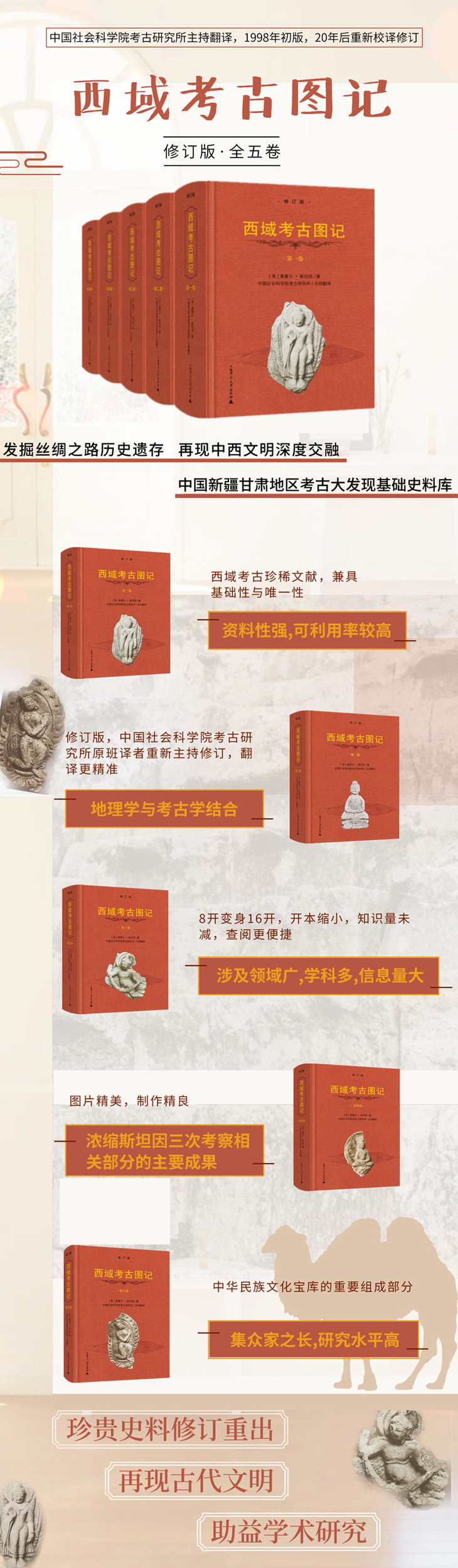 1999年,广西师范大学出版社出版了根据克拉伦敦出版社1921年版进行翻译的五卷本《西域考古图记》,在学界引起强烈反响。时隔20年,中国社科院考古研究所组织原班译者对该书重新校译修订,进一步提升了译著质量。同时,此次修订版开本由初版的8开变成16开,使读者查阅更方便。