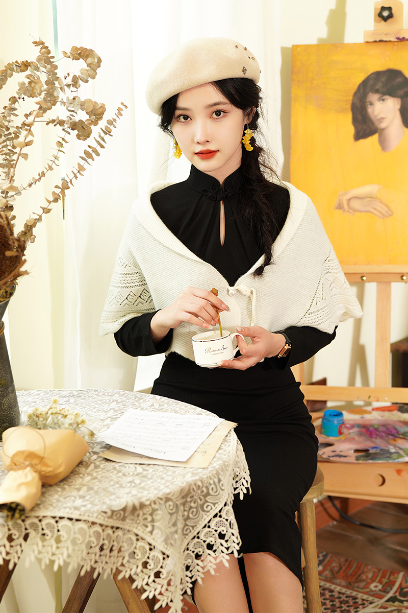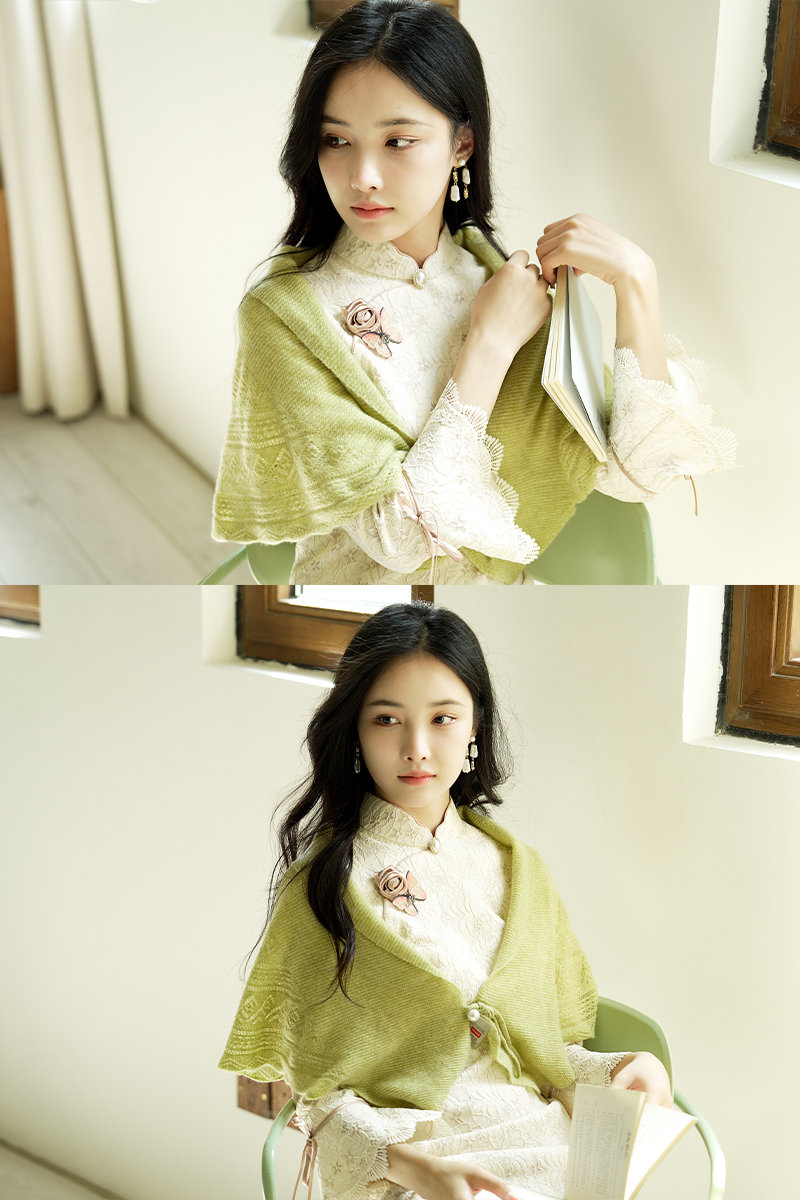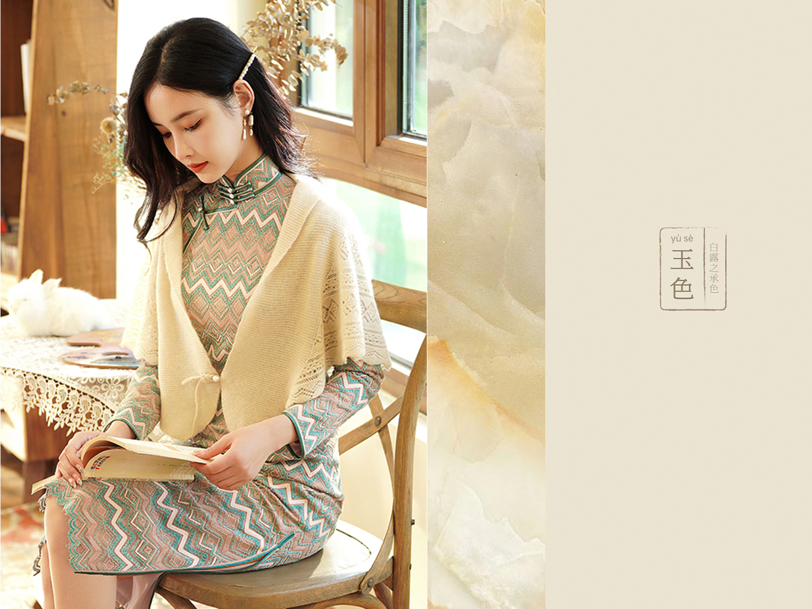 为姐妹们设计了3种中国古典色:凝脂(白色)、玉色(驼色)、风入松(绿色),都是显白淡雅的色系.跟旗袍搭配,极美!!!
