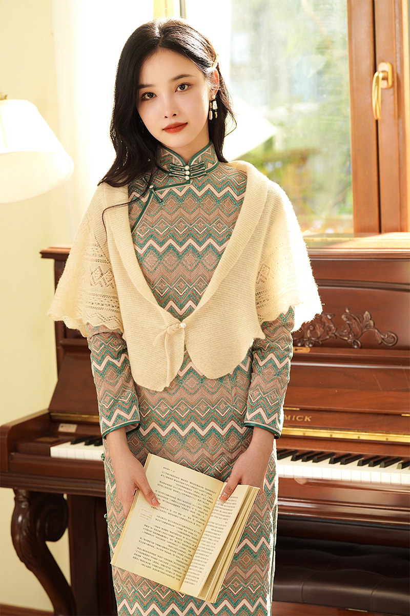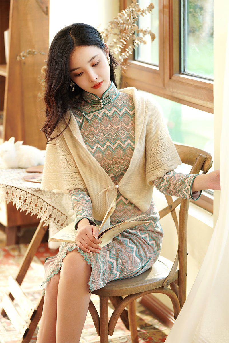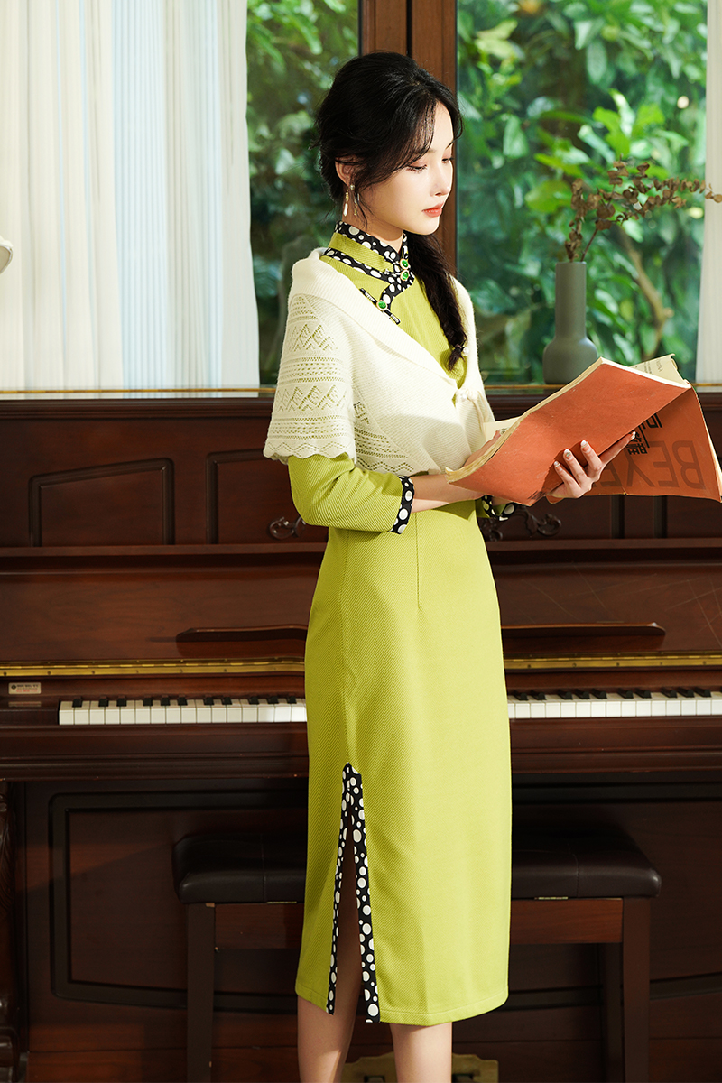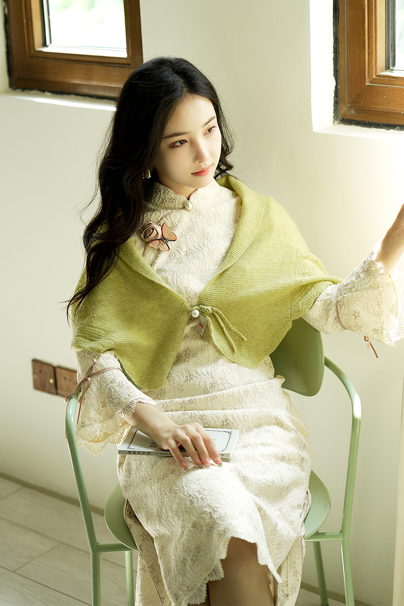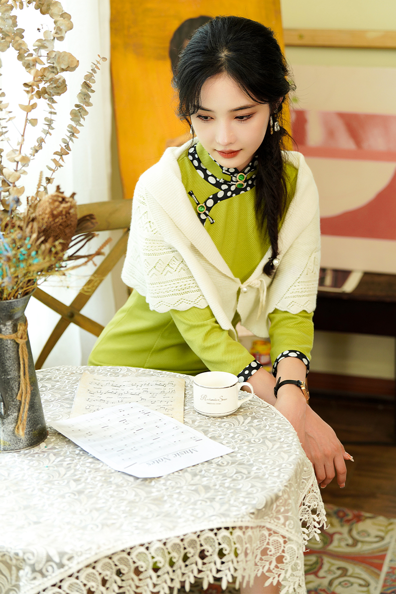 这款绿色是我精挑细选的颜色,冬日里的衣服偏暗色为主,挑选淡雅的风入松绿色,搭配白色旗袍就更加出彩!~