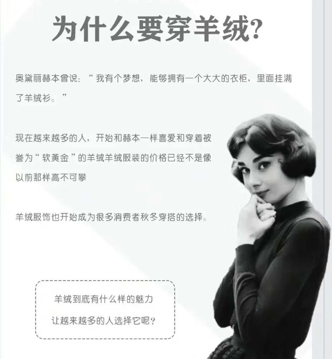 越来越多的人,开始和赫本一样爱着和穿着被誉为“软黄金”的羊绒.它轻柔、温暖、帖肤的质感也被越来越多的人喜欢!~