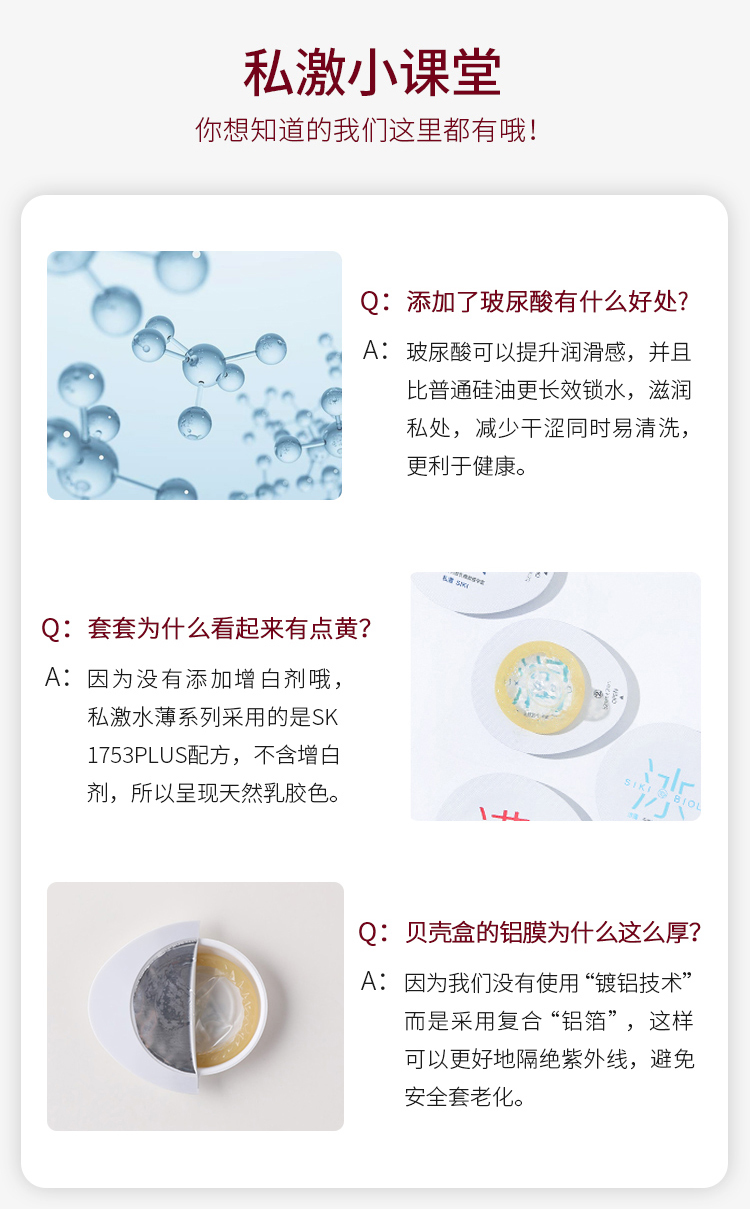 当大多数品牌还在玩着001、002之类数字游戏时,私激SIKI却认识到,对于所有为爱鼓掌的情侣,安全套的薄,仅仅是探索情趣体验的开端。为打破现状,私激SIKI在19年产品正式亮相前,由旅日30年的农学博士带队,潜心攻关2年,成功研发SK1753PLUS保密配方,推出接近于胶乳原料薄度极限的003安全套,在贴肤透薄的基础上全方位提升体感,并添加兼具润、滑、养三重特性的天然植萃玻尿酸润滑液,适合东亚人群体质特性,不含硅油,健康易洗,更有利于维持女性私处酸碱平衡,不易过敏,为每一场爱爱保驾护航。
