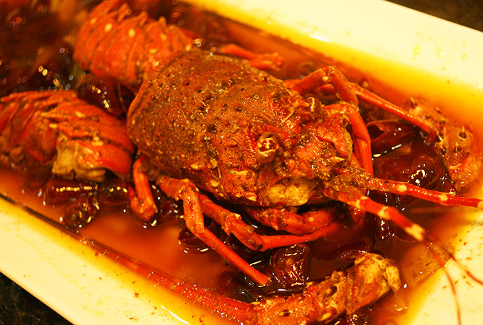 先将澳龙去内脏切块炸至金黄,再加入独家秘制调料炒至鲜香入味