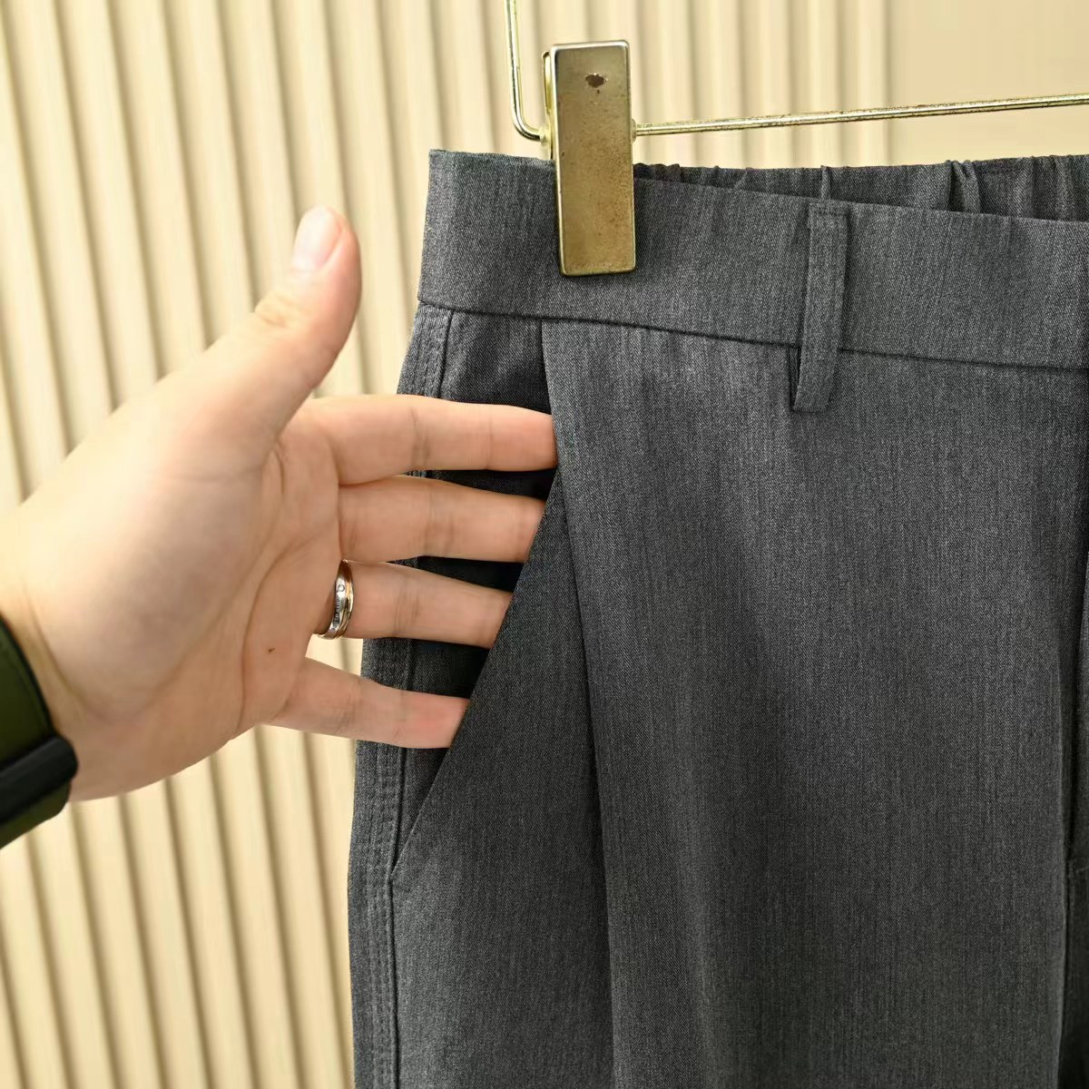 春季新品男士垂感宽松休闲直筒西裤,重磅奢感垂感易打理西裤,重构奢感新体验,易打理|垂感透气 舒适亲肤,低奢简约!休闲西裤可以说是正装西服的衍生品,因为很多时候商务通勤的朋友们都是在工作的地方,准备一套正装西服来应对特殊场合。不过这样既不方便,打理起来又很麻烦!所以为了方便又不失场合,日常通勤选择休闲西裤肯定是睿智的选择!而且休闲西裤更能穿出时尚年轻感!传统jing典的直筒基础款,裤脚略微收起,这样会拉长视觉比例线条,上身非常显腿长!没有繁复的设计,简约大气上身不仅仅舒适感爆棚,同时提升气质,随意切换场合也游刃有余!裤子的剪裁,车工,辅料,所有细节都非常到位!面料更是重中之重!休闲西裤这类单品大部分还都是商务工作场合来穿,透气不好闷热无比,同时走动过多或是长时间久坐裤子背后邹邹巴巴。这款单品再也不用像正装西裤那样,费时费力的处理褶皱!敞口斜插袋,功能性与美观兼具!小直筒裤脚,当下流行的微微收口设计,无论是放下还是卷起都非常有型!搭配各种鞋子也没有问题!喜欢的快下单吧 !